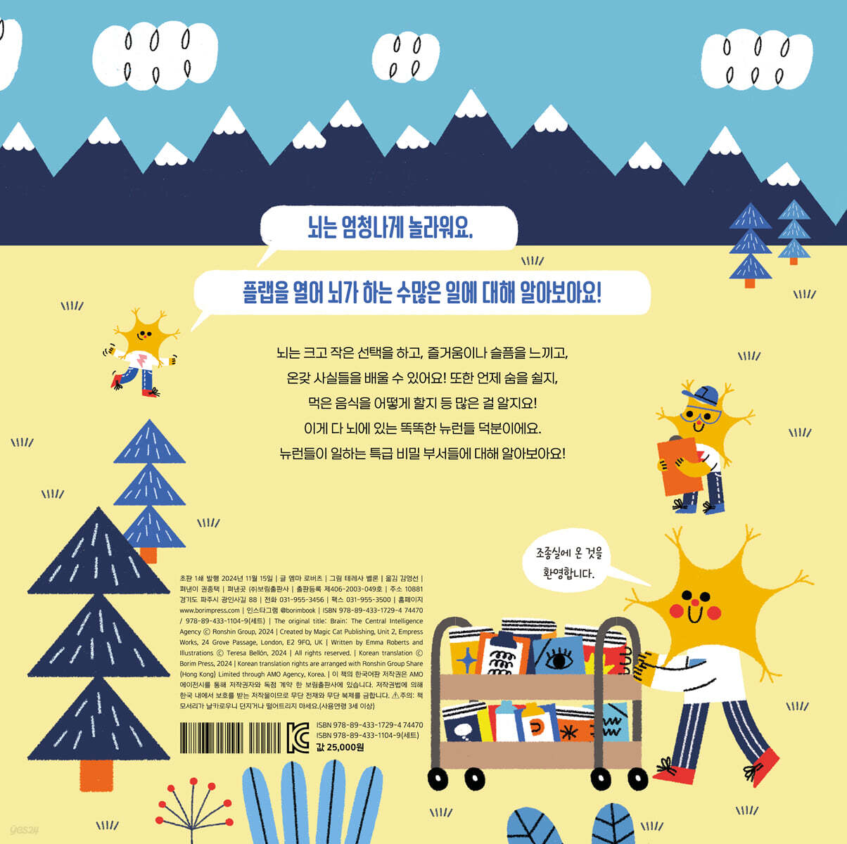 뇌는 우리가 보고 듣고 느끼는 모든 것과 생명을 유지하는 데 필요한 모든 일을 지휘해요. 상상할 수 없을 만큼 놀라운 뇌를 속속들이 다 이해하는 건 불가능하지요. 《뇌-우리 몸의 조종실》에서는 뇌에 대한 모든 것을 알려 주기보다는 뇌가 감각 기관에서 받아들인 자극을 판단하고, 명령을 내리는 과정에만 초점을 맞췄어요. 그래서 대뇌, 소뇌, 뇌줄기처럼 뇌의 부위에 따라 하는 일을 설명하는 게 아니라, 뇌를 뉴런이 일하는 커다란 일터로 설정하고 정보를 재구성했지요. 감각 기관으로부터 받은 정보를 해석하는 ‘시각실, 분석실, 청각실’과 정보를 처리하고 명령을 내리는 ‘종합 상황실’, 명령을 수행하기 위한 움직임과 관련된 ‘소뇌’. 이렇게 5가지 부서로 나누어 뉴런이 하는 일을 알려 줘요. 아이들은 뇌 속에서 바쁘게 움직이는 뉴런을 따라가며 뇌가 어떻게 다양한 일을 해내는지 맛볼 수 있답니다. 지식의 깊이를 더해 주는 플랩 《뇌-우리 몸의 조종실》은 뉴런들이 어떻게 일하는지를 뜯어보는 재미가 있어요. 아이들이 부담 없이 볼 수 있도록 뇌에 대한 정보는 뉴런 캐릭터들의 말풍선 대사와 짧은 글로 간결하게 설명했지요. 대신 33개의 플랩 안에 깊이 있는 정보가 숨겨져 있어요. 플랩을 닫았을 때는 평범한 그림이지만, 플랩을 열면 자세한 설명이 쓰여 있지요. 그래서 직접 플랩을 열어 내용을 확인해 보는 과정만으로도 책을 읽는 재미와 집중력이 높아져요. 아이들은 플랩을 하나씩 열어 보며 새로운 지식을 찾아내고, 플랩 안쪽과 바깥쪽의 내용을 서로 연결 지어 보면서 뇌에 관해 더 풍부하고 깊이 있는 지식을 얻을 수 있답니다. 추상적인 내용을 구체화해 주는 그림 뇌 속에서 일어나는 일이나 뉴런 세포가 일하는 모습은 어렵고 추상적이라 있는 그대로 그림으로 나타내기는 어려워요. 아이들이 쉽게 이해하기 위해서는 적절한 비유와 구체적인 예시가 필요하지요. 《뇌-우리 몸의 조종실》은 뇌를 조종실이라는 커다란 일터에, 뉴런을 뇌에서 일하는 일꾼에 비유했어요. 책을 펴면 뇌로 출근하는 뉴런들의 모습을 시작으로, 학교, 시각실, 분석실, 종합 상황실, 청각실, 운동장에서 저마다 바쁘게 일하는 뉴런들을 볼 수 있지요. 뉴런 캐릭터는 실제 뉴런의 생김새와 특징을 잘 살리면서도 그림 그리는 뉴런, 음식 맛보는 뉴런, 연주하는 뉴런, 다이빙하는 뉴런 등 아이들의 눈높이에 맞춰 구체적으로 의인화했어요. 이처럼 친근하고 재미있게 표현한 그림이 어려운 지식을 쉽게 이해하도록 돕지요. 또한 야구 모자를 쓴 뉴런 친구들이 장면마다 나와요. 야구 모자를 쓴 18명의 뉴런 친구들을 찾다 보면 책을 더 재미있게 볼 수 있답니다. |