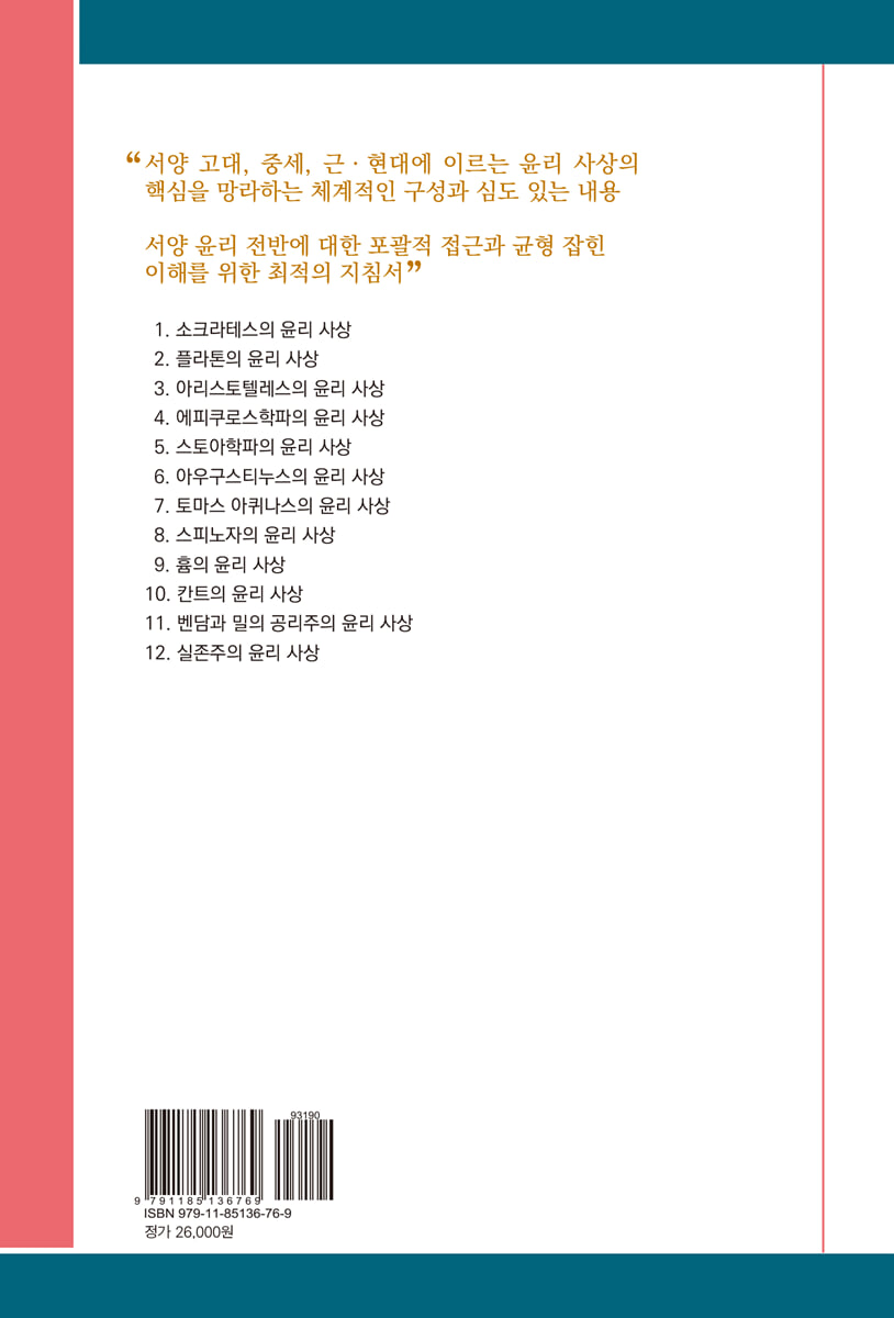 2. 플라톤의 윤리 사상|김도형 3. 아리스토텔레스의 윤리 사상|노영란 4. 에피쿠로스학파의 윤리 사상|추정완 5. 스토아학파의 윤리 사상|엄성우 6. 아우구스티누스의 윤리 사상|윤영돈 7. 토마스 아퀴나스의 윤리 사상|홍석영 8. 스피노자의 윤리 사상|변순용 9. 흄의 윤리 사상|변영진 10. 칸트의 윤리 사상|정대성 11. 벤담과 밀의 공리주의 윤리 사상|류지한 12. 실존주의 윤리 사상|김남준 |