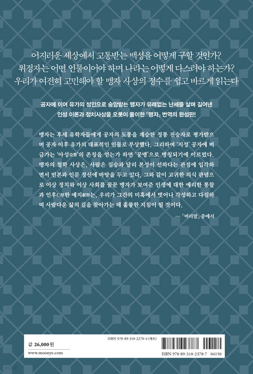 위정자는 어떠해야 하며 나라는 어떻게 다스려야 하는가? 시대를 초월한 맹자의 질문을 다시 마주하다 ★★유려한 번역, 상세한 주석, 명쾌한 해설 ★★고금의 여러 판본을 두루 참고한 『맹자』 번역의 완성판! 『맹자』는 『논어』, 『대학』, 『중용』과 함께 유가의 필수 경전인 사서로 꼽힌다. 더불어 공자를 지극히 우러러본 맹자가 공자의 사상을 어떻게 발전적으로 계승했는지를 살펴볼 수 있는 책이기도 하다. 맹자는 “인류가 탄생한 이래로 아직 공자 같은 분이 없었다”며 공자를 추앙했고, “다만 내가 바라는 것은 바로 공자를 본받는 것이다”라며 공자의 가르침을 적극 계승하고자 했다. 공자와 맹자는 닮은 점이 많다. 맹자 당시 제후들은 패권 다툼에만 열을 올려 천하의 혼란이 극심했다. 민생 역시 처참했다. 이에 맹자는 인의(仁義)를 가볍게 여기고 무력이나 권모술수로 승리를 구가하는 ‘패도정치’를 배격하고 임금으로서 마땅히 지켜야 할 도리인 ‘왕도’와 어진 정치(‘인정’)를 강조하며 사회를 개혁하고 민생의 안정을 도모하고자 했다. 공자와 맹자의 인생 역정이 모두 녹록지만은 않았던 이유가 여기에 있다. 두 사람은 어지러운 세상일을 외면한 채 고고하게 학문에 매진하지 않았다. 누구보다 치열한 개혁가, 정치가의 삶을 지향하고 실제로 살아낸 것이다. ‘지성’ 공자에 이어 ‘아성’으로 추앙받는 맹자 높은 이상을 품고 시대가 나아갈 길을 치열하게 모색하다 맹자 사상의 핵심은 세 가지로 추릴 수 있다. 먼저 성선설이다. 인간사회의 수많은 악과 부덕이 고래로 존재해왔다는 점을 상기해본다면, 성선설에 고개가 갸우뚱해질 수 있다. 하지만 이는 맹자가 설파한 성선설의 본질을 비켜 간 질문이다. 맹자는 인간이 환경의 영향을 받는다고 보았다. 본연의 선함을 발현할 수 없는 환경에 놓여 있다면 인간이 금수와 다름없어질 수 있다는 의미다. 그러므로 우리는 선함을 지키기 위해 최선의 노력을 기울여야 한다. 그러면 인간이 모인 사회도 선하게 변모할 것이다. 이 노력이 부족하기에 인간이 본연의 선함을 잃고 사회가 혼탁하다는 것이 맹자의 논지다. 인간이 아무것도 하지 않아도 자연히 선하다는 것은 성선설에 대한 오해다. 그다음은 인의 사상이다. 맹자는 인과 의를 도덕의 가장 중요한 두 개념으로 삼았다. 공자가 인을 핵심으로 두고, 의를 그 부대 개념으로 강조한 것과는 다르다. 사람이 지켜야 할 정도이자 도덕 원칙, 행위규범으로 ‘의’의 지위를 격상한 것이다. 마지막은 왕도 인정의 정치사상이다. 맹자는 어지러운 세상에서 백성을 구제하기 위해 동분서주했다. 결국 『맹자』에서 가장 강조하는 것도 정치와 치국의 문제다. ‘왕도’와 ‘인정’은 『맹자』 정치사상의 핵심이다. 왕도와 인정은 각각 패도와 학정에 대비되는 개념으로 도덕과 폭력, 덕과 힘의 대립과 궤를 같이한다. 이처럼 맹자는 힘으로 억눌러 복종하게 하는 방식이 아닌 마음으로 우러러 따르게 하는 데 정치의 주안점을 둔다. 맹자 사상의 또 다른 특징인 민본 관념도 여기서 나온다. 아무리 군왕이라도 인의를 저버린 폭군이라면 교체할 수 있다는 맹자의 주장은 그가 전제군주의 시대를 살았다는 점을 감안하면 깜짝 놀랄 정도로 대담하다. 『맹자』 「양혜왕 하」편에는 이런 대목이 나온다. 먼저 맹자가 제나라 선왕에게 묻는다. “만약 옥관의 우두머리가 부하 옥관을 잘 다스리지 못한다면, 그를 어떻게 해야 합니까?” 이에 선왕은 파면해야 한다고 답한다. 맹자가 다시 묻는다. “만약 나라가 잘 다스려지지 않는다면, 어떻게 해야 합니까?” 이에 선왕은 얼굴을 돌리며 화제를 바꾼다. 『맹자』에는 이외에도 임금에게 직언하는 맹자의 대범함을 볼 수 있는 대목이 많다. “백성이 가장 귀중하고, 사직이 그다음이며, 임금은 귀중함이 가장 덜하다”는 신념을 굽히지 않고 당당하게 설파한 맹자의 강단 있는 면모는 왜 그가 유가의 성인으로 손꼽히는지에 관한 하나의 대답이 되어준다. “백성의 신임이 없으면 나라는 존립할 수 없다”는 공자 사상을 계승하면서도 이를 더욱 적극적으로 강조한 것이다. 더 나은 세상을 바라는 사람들에게 영감과 귀감을 주는 맹자의 호연지기를 쉽고 바르게 읽는다 맹자는 요순시대를 거쳐 공자까지 이어져온 성왕과 성현의 도통이 중단될 위기에 처한 현실을 한탄한다. 그러나 체념하지는 않는다. 오히려 사명감을 갖고 나서서 그 도통을 계승하겠다는 결연한 의지를 다진다. 어려운 상황에 꺾이고 수그리기에는 백성을 넉넉히 부양해 인의에 기반한 왕도정치를 구현하겠다는 맹자의 의지와 신념이 그만큼 크고 넓었다. 『맹자』는 ‘쉽고 바르게 읽는 고전’(『논어』(상하권), 『노자』, 『장자』, 『손자병법』, 『대학?중용』)을 펴낸 박삼수 교수가 번역한 시리즈의 여섯 번째 책이다. 이전 책과 마찬가지로 고금의 여러 판본을 두루 참고한 유려한 번역과 상세한 주석, 명쾌한 해설에 『맹자』의 총체적 의의를 짚을 수 있는 서문 등으로 책을 구성해 독자에게 ‘쉽고 바르게’ 다가가고자 했다. 또한 직역을 원칙으로 하여 한문 문리(文理