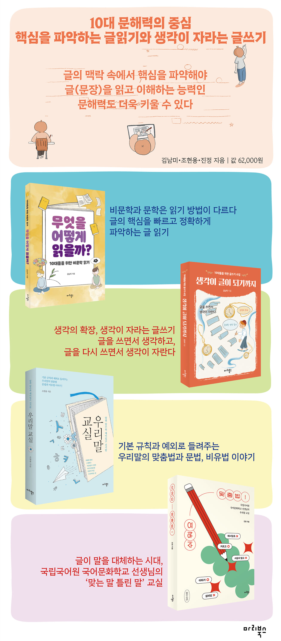 머리말_글 읽기는 내가 무엇을 좋아하고 무엇을 할 수 있는지 발견하는 시간 PART 1. 나도 글을 잘 읽고 싶어! 정말 책을 많이 읽으면 좋을까? 왜, 무엇을, 어떻게 읽어야 할까? 나와 독서는 어떤 관계일까? 독서가 나에게 미치는 영향 글의 종류에는 무엇이 있을까? 책을 읽을까? 글을 읽을까? 나를 읽는 과정이라고? PART 2. 글을 읽으려면 이것만은 꼭 글의 목적 파악하기 보이지 않는 것도 함께 읽기 문장의 무게 파악하기 나는 어떻게 읽을까? 목차를 보고 전체 파악하기 글을 읽는 5단계 나만의 주제문 오답 노트 만들기 핵심 정보, 너의 위치가 궁금해 연계 단락의 역할을 알려 줘 구조를 그릴 때도 무게 비교는 필수 글을 입체적으로 보려면 이렇게! PART 3. 지금은 글을 읽을 시간 문제 제기를 하는 글 원인과 결과를 밝히는 글 원인과 결과를 밝히는 글의 유용성 이론을 소개하는 글 두 개 이상의 이론을 소개하는 글 사실을 설명하는 글 사실을 설명하는 글의 유용성 중요 가치를 해석하는 글 중요 가치를 해석하는 글의 유용성 02_생각이 글이 되기까지 머리말 1장 … 글로 생각하기, 써야 알 수 있는 생각 글을 쓰면서 비로소 생각을 한다 글을 다시 쓰면서 우리의 생각이 자란다 나의 삶에서 ‘소장각’은 무엇인가? 내 생각을 찾으려면 빈칸을 채워라 생각을 해야만 하는 시간, 마감 마감을 만나는 세 가지 순간 중요한 마감을 만나라 빨리 틀리고 들켜야 빨리 고칠 수 있다 무엇이, 왜, 얼마나 중요한가 2장 … 생각을 글로 그리는 법 마감의 수를 늘려라 짝을 이루는 빈칸을 만들어라 단어와 단어 사이의 관계, 어휘를 잘 활용하라 빈칸을 만드는 첫 번째 방법, 무게가 같은 말을 활용하라 빈칸을 만드는 두 번째 방법, 무게가 다른 말을 활용하라 생각의 시각화, 생각을 그려라 중요한 것, 버릴 것, 더 생각해 볼 것으로 정리하기 내 머릿속에는 무엇이 있을까? 생각의 구조 그리기 3장 … 생각이 글이 되기까지, 글을 구성하는 것들 글을 왜 쓸까? 하고 싶은 말을 하기 위해! 단어가 생각나지 않으면 괄호를 하고 넘어가라 방향을 잃었을 때 다시 보아야 할 중요한 것들 아무리 긴 글도 핵심어(구)는 5개 이하 핵심어(구), 단락을 둘로 나누어 찾아라 핵심어(구) 읽기가 왜 필요할까? 일단 쓰고 다시 들여다보기 난 왜 이렇게 못 쓰지? 자책하지 마라 주제문, 글에서 내가 하고 싶은 말 그다음에는 무엇을 하면 좋을까? 단락은 무엇일까? 주제문과 핵심어를 긴밀하게 만드는 단락 중요 단락은 정독으로, 보조 단락은 통독으로 생각을 단락 단위로 쪼개라 주제? 주제문! 주제문이 갖추어야 할 것들 주제문은 언제 결정될까? 주제문 읽기와 주제문 만들기 4장 … 생각이 글이 되기까지, 글 쓰는 과정 쓰기 시작할 때 점검할 것들 글쓰기의 출발점, 계획서 만들기 다른 사람의 생각 읽기을 읽는 검색 방법 낯선 것부터 접근하라 글에 넣을 중요 자료를 선정하라 더미 파일을 활용하라 출처가 따라다니게 하라 계획서는 언제 완성될까? 개요, 중요한 만큼 많이 수정하라 관계를 보면 개요가 보인다 좋은 서론을 쓰려면 무엇이 필요할까? 본론은 개요를 바탕으로 서론에서 쓰기로 한 것을 쓴다 멋지지 않아도 괜찮은, 기본에 충실한 결론 다시 쓰기와 검토하기 맞춤법과 띄어쓰기를 위한 하루 03_우리말 교실 머리말 1장 알면 알수록 재미있는 맞춤법 이야기 하해의 원리 고세회수 척과 체 ‘?로서’와 ‘?로써’ 제가 앞에서 끌게요 몇 월 며칠이에요? ‘안’ 꾸며주니까 ‘않’ 양염쥐는 예외 ‘예’의 반대말 ‘아니요’ ‘오’와 ‘요’ 데? 대? 오뚜기와 오뚝이 칠칠맞다와 칠칠맞지 않다 오랜만과 오랫동안 그러고 나서 금세와 비로소 숟가락과 젓가락 예전에 먹었었다 띄어쓰기와 붙여 쓰기 표준어에서 ‘버림’ 마침표와 쉼표 ‘-에 있어서’는 피해야 ‘부르다’에서 ‘불리워지다’까지 주스 주세요 뉴욕 커피숍에서 ‘보다 높이’가 아니라 ‘더 높이’ ㆍ우리말의 탄생ㆍ 훈민정음 창제 당시의 한글 자음 이름 기역, 디귿, 시옷 ㅎ과 ㅋ 2장 알면 알수록 신기한 문법과 비유법 이야기 의태어의 비밀 직유법의 거짓말 풍유법은 풍자 과장법의 한계 아이의 활유법 완곡어법의 매력 공감각적 표현 의인법의 반대말 무서운 비유 대통령과 압존법 우리말의 매력, 모음조화 감탄사가 절로 난다 명사와 동사의 시각 형용사의 발달 무엇의 대명사 감정을 생각하지 마라 감정에 관한 관용 표현들 잘못된 자기소개 서방님과 호칭 아내를 지칭할 때 지명의 유래와 수수께끼 숫자의 크기 반말의 거리 받침의 비밀 단어 순서의 친밀함 ㆍ표준어와 사투리ㆍ 표준어의 비밀 상상의 세계로 이끄는 사투리 조선어라는 말 지명으로 풀어보는 고구려어 04_쉬워요 맞춤법! 머리말 ㄱ 가리키다와 가르치다 | 가정란, 경제란, 정치란과 어린이난 | 간질이다와 간지럽히다 | 갈가리와 갈갈이 | 갉작거리다(갉작이다)와 긁적거리다(긁적이다) | 개개다와 개기다 | 개발새발과 괴발개발 | 개수 | 객쩍다 | 거 | 자주 헷갈리는 맞춤법 확인 문제 10 거르다 | 거방지다와 걸판지다 | 거시기 | 거치적거리다와 걸리적거리다 | 건더기 | 건드리다와 건들거리다 | 걸맞은과 맞는 | 
