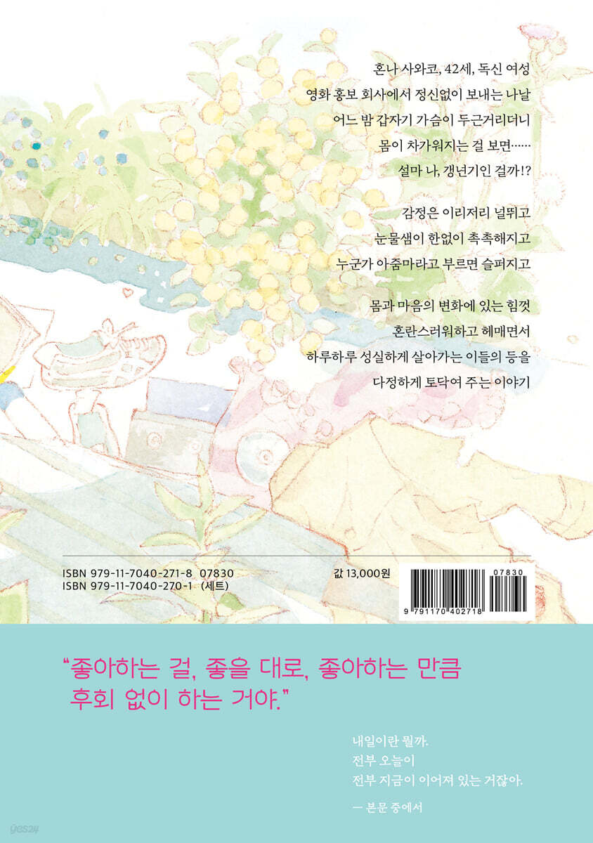 * 2020년 만화 타이쇼상 후보 독특한 유머와 섬세한 심리 묘사, 그리고 개성 있는 캐릭터로 많은 독자들에게 사랑을 받으며 BL부터 순정 만화, 여성지 등 다양한 장르에서 활발하게 활동 중인 카리 스마코의 힐링 만화 『내일 죽기에는』이 마침내 국내 독자들을 만난다. 20대와 30대를 지나, 우뚝 선 40대의 벽 나는 이제 어쩌면 좋지? 어른이 되면 모든 것이 다 수월하고 쉬울 줄로만 알았는데, 우뚝 선 40대의 벽이 그저 혼란스럽기만 한데……. 40대 여성이 마주하는 다양한 문제들을 섬세하고 유머러스한 시선으로 포착한 카리 스마코의 『내일 죽기에는』. 몸과 마음의 변화에 있는 힘껏 혼란스러워하고 헤매면서 하루하루 성실하게 살아가는 이들의 등을 다정하게 토닥이는 이야기가 되어 줄 것이다. 40줄에 접어든 한 여성의 좌충우돌, 망설임, 즐거움, 새로운 만남과 헤어짐. 지금부터 다양하게 그려 나가려고 합니다. - 카리 스마코(지은이) 제 인생에도 우메키같은 원수가, 미츠키같은 깜찍이 후배가, 다른 속도로 하지만 함께 나아가는 친구들이 있습니다. 혼나도 저도 여러분도 어느 방향으로든 나아가고 있다고 생각합니다. 그런 힘을 주는 만화입니다. - 오지은(옮긴이) 버텨 내자, 산을 하나씩 넘어가는 거야 42세, 독신 여성, 혼나 사와코. 영화 홍보 회사에서 열심히 일하며 살아가던 그에게 갑작스럽게 찾아온 몸과 마음의 변화. 어느 날 밤 가슴이 두근거리기 시작하더니 몸이 차가워지고 마음까지 싱숭생숭하기만 한데…… 이게 바로 말로만 듣던 갱년기인 걸까? 바쁘게 밀려드는 회사 일과 눈치 없이 치근대는 유부남 동료, 그리고 때 이르게 찾아온 갱년기 증상까지. 하루하루 버티는 마음으로 살아가고 있던 사와코에게 어느 날 중학교 동창 노자키 토코의 편지가 도착한다. 딸과 함께 도쿄에 방문할 일이 있으니 오랜만에 얼굴이나 보자는 토코의 편지에 사와코는 잠시 망설이지만 곧 만나 보기로 결심한다. ‘그 아이라면 어떻게 되었을지…… 한번 보고 싶다는 생각이 들어.’ 아무도 이런 아줌마 머리에 신경 안 쓰니까 노자키 토코, 42세. 23살에 7살 연상 남편과 결혼했고, 결혼 후 낳은 딸이 어느덧 대학생이 되었다. 결혼과 육아로 인해 다니던 직장을 그만둔 토코는 우연한 계기로 근처 레스토랑에서 아르바이트를 시작한다. 오랜만에 일을 시작한 토코는 설레는 것과 동시에 두려운 마음이 든다. 유니폼 모자를 쓰고 일한 탓에 잔뜩 눌린 머리 스타일이 마음에 들지 않지만, 그때 날아든 같이 일하는 동료의 말 한마디. “신경 쓰지 마. 아무도 이런 아줌마 머리에 신경 안 쓰니까.” 새삼 자신의 나이를 통감하며 울적해하던 토코에게 젊은 레스토랑 알바생 오노가 살갑게 다가오고, 그동안 잊고 있던 설렘이 어느새 그녀에게도 찾아드는데……. |