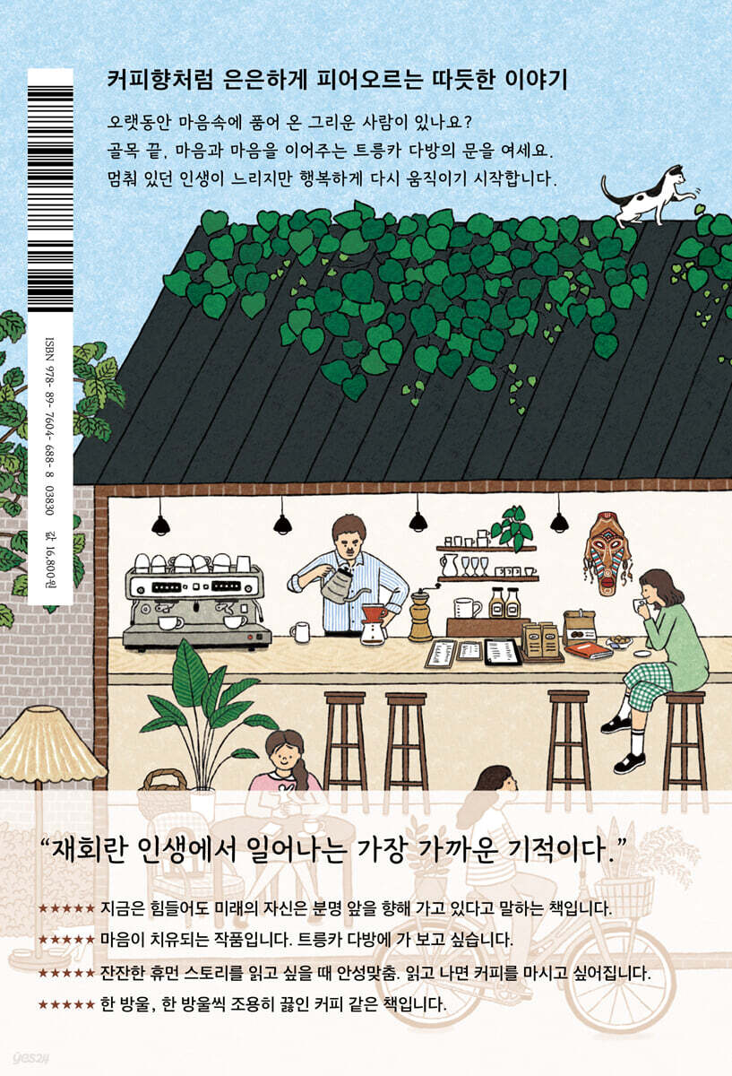 별것 아닌 작은 콩들이 커피로 변신하는 순간, 그윽한 향기가 당신의 지친 마음을 어루만집니다. 정신없이 흘러가는 바쁜 일상 속 한잔의 커피는 부드러운 쉼표가 되어 주변을 둘러보는 힘을 건넨다. 비로소 천천히 커피 한잔을 음미하는 순간 우리는 ‘나’와 다른 사람의 마음에 귀를 기울이기 시작한다. 도쿄 주택가 작은 뒷골목 제일 안쪽, 마치 몸을 숨기듯 조용히 자리 잡은 커피전문점 트릉카 다방. 이곳의 문을 열면 그윽한 커피 향기가 온몸을 감싸며 지친 마음을 어루만진다. 《기적을 내리는 트릉카 다방》은 트릉카 다방을 중심으로 펼쳐지는 세 편의 이야기가 옴니버스 형식으로 전개된다. 어린 시절 부모에게 받은 상처로 삶을 냉소적으로 바라보게 된 대학생 슈이치, 오로지 성공만 좇다가 아픈 몸만 남은 중년의 남성 히로, 언니 기일이 다가올 때마다 덧나는 마음의 상처를 지닌 고등학생 시즈쿠가 화자가 되어 각자의 내밀한 이야기를 전한다. 이들은 저마다의 아픔을 품고 있지만 트릉카 다방에서 이어진 인연으로 상처를 깨닫고 치유해 나간다. “누군가를 위해 내가 바뀌고 싶다고 생각하는 게 이렇게 기분 좋은 일인지 몰랐다.”(111쪽) 주인공들은 트릉카 다방의 마스터 다치바나가 건네는 커피 한잔을 응원 삼아 변화를 향해 한 발짝 내디딘다. 《기적을 내리는 트릉카 다방》은 “외벽이 담쟁이덩굴로 뒤덮인, 아주 오래된 건물이 나왔다. 방갈로처럼 세모난 지붕이 뾰족 솟았고, 전체가 차분한 갈색으로 통일된 그 건물은 일반 주택이 아니라 가게인 모양이었다.”(28쪽)와 같이 눈앞에 그려지는 듯한 섬세한 장면 묘사와 “아담한 몸집에 얌전해 보이는 인상이었다. (중략) 밖이 추웠는지 하얀 얼굴이 살짝 상기되어 발그스레한 볼이 눈에 들어왔다.”(11쪽)와 같이 주변에서 마주칠 법한 생생한 인물 묘사를 통해 독자에게 트릉카 다방 구석 테이블에서 주인공들을 바라보는 듯한 낯선 감각을 선사한다. 커피 향기처럼 은은하게 피어오르는 달콤하고 부드러운 기적 이야기는 아픔과 상처를 안고 살아가는 사람들의 마음을 부드럽게 어루만져 줄 것이다. |