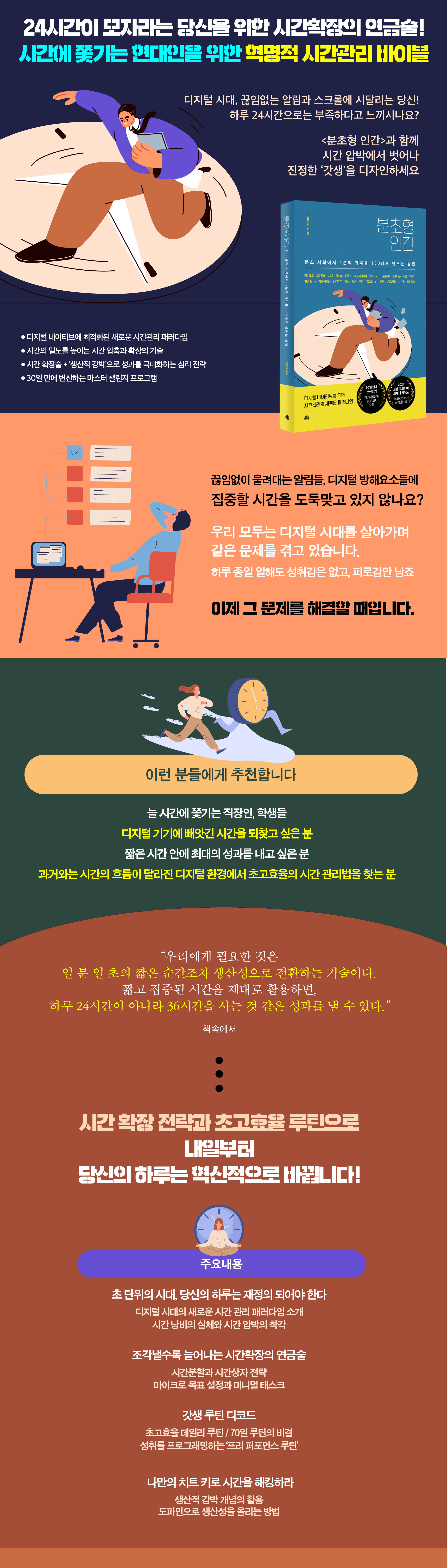 “시간의 밀도를 높이면 인생의 질이 달라진다!”24시간이 모자란 당신을 위한 시간 관리 혁명바쁜 일상 속에서 끊임없이 "시간이 부족하다"는 생각을 하고 있는가? 『분초형 인간』은 당신이 그동안 당연하게 여겼던 시간 관리의 개념을 완전히 뒤집을 책이다. 이 책은 단순한 ‘계획 중심’ 시간 관리가 아닌, 디지털 네이티브들에게 최적화된 혁신적인 시간 활용법을 제시한다. 하루 24시간이라는 틀에 갇히지 않고, 시간을 압축하고 확장하는 법을 통해 더 많은 성과를 낼 수 있는 방법을 배우게 될 것이다. 디지털 시대의 우리는 스마트폰과 각종 디바이스 속에서 끊임없이 알림과 메시지를 확인하며 시간을 소비한다. 하루 평균 1분 10초씩, 150회에 걸쳐 스마트폰을 확인하는 데에만 약 3시간을 쓴다는 통계가 이를 증명한다. 그러나 그 시간이 정말로 가치 있게 사용되고 있는가? 이 책은 바로 이 질문에서 출발하여, 우리가 짧은 순간을 제대로 활용하지 못하고 있음을 짚어내고, 이를 최대의 생산성으로 전환하는 방법을 제시한다.책에서 다루는 ‘마이크로 모먼트’는 디지털 시대에 맞춰 짧은 순간을 효율적으로 활용하는 개념이다. 그 짧은 순간이 모여 큰 성과를 만들어낼 수 있는 잠재력을 가지고 있다는 점을 강조한다. 구글이 처음으로 도입한 이 개념은 마케팅의 영역에서 나아가, 현대인의 시간 관리에도 그대로 적용된다. 책은 ‘즉각성, 유용성, 신속성’이라는 마이크로 모먼트의 특징을 통해, 시간을 쪼개는 것이 아닌, 시간을 압축하고 확장하는 방법을 제시한다. 즉, 순간순간에 즉각적으로 필요한 정보를 얻고, 지체 없이 작업을 해결함으로써 짧은 시간 안에도 의미 있는 성과를 낼 수 있는 방법을 배운다.이 책은 마이크로 모먼트뿐만 아니라, 시간 관리의 패러다임 전환을 강조한다. 과거의 시간 관리는 계획적이고 고정된 방식이었다. 그러나 현대 사회에서는 끊임없는 방해와 빠른 응답이 요구되는 상황 속에서 기존의 시간 관리 방식은 더 이상 효과적이지 않다. 우리는 예상치 못한 상황에 유연하게 대처할 수 있는 새로운 시간 관리 기술이 필요하다. 이 책은 그런 변화된 세상에 맞춰 몰입의 기술을 익히고, 짧고 산만한 시간 속에서도 집중력을 유지할 수 있는 전략을 소개한다. 특히 주목할 만한 것은 ‘생산적 강박’이라는 개념이다. 이 개념은 일반적으로 부정적으로 여겨지는 강박을, 성과를 내기 위한 긍정적인 동력으로 바꾸는 것이다. 강박을 저주가 아닌 축복으로 전환하여, 극도의 집중력을 통해 더 많은 성과를 낼 수 있는 상태로 자신을 이끌어가는 방법을 알려준다. 책은 독자들에게 번아웃 없이 효율적으로 시간을 관리하고, 성과를 극대화할 수 있는 심리적 도구와 구체적인 루틴을 제시한다.또한, 우선순위 설정과 시간 분할 기법을 통해 중요한 일에 먼저 집중하고, 하루를 효율적으로 사용하는 방법을 구체적으로 설명한다. 불필요한 시간 낭비를 줄이고, 중요한 일에 몰입하는 습관을 들이면 심리적으로 더 많은 시간을 가진 듯한 느낌을 받을 수 있으며, 하루의 질이 달라진다는 점을 강조한다. 이것이야말로 『분초형 인간』이 지향하는 시간 관리 혁명의 핵심이다.책은 다양한 검증된 연구 자료와 실제 사례를 통해, 독자들이 쉽게 공감할 수 있는 방식으로 설명된다. 특히, 하버드 비즈니스 리뷰에서 소개된 연구에 따르면, 전문가들조차도 잘못된 시간 관리 관행으로 인해 매주 평균 21.8시간을 낭비하고 있다고 한다. 불필요한 회의, 비효율적인 업무 흐름, 우선순위 설정의 실패 등이 그 원인이다. 이처럼 풍부한 논문과 과학적 근거를 바탕으로, 단순한 조언을 넘어서서 디지털 시대에 맞는 시간 관리의 새로운 패러다임을 설득력 있게 제시한다.이 책에서 말하는 ‘분초형 인간’의 궁극적인 목적은 단순히 더 많은 일을 해내는 것이 아니다. 이 책은 삶의 질을 높이고, 더 의미 있는 삶을 사는 것을 목표로 한다. 우리가 배운 시간 관리 기술들은 결국 자신의 가치와 목표에 맞게 삶을 디자인하는 것으로 연결된다. 더 많은 일을 해내기보다는, 중요한 일에 의도적으로 집중하고, 각 순간의 가치를 극대화하는 방법을 배우는 것이다. 이 책은 디지털 시대를 살아가는 현대인들이 겪는 시간 압박을 해결할 수 있는 혁신적이고 실질적인 전략들을 제공한다. 짧고 산만한 시간 속에서도 몰입할 수 있는 법, 그리고 짧은 순간을 생산성으로 전환하는 법을 배우고 싶다면, 『분초형 인간』은 그 해답을 제시할 것이다. 시간의 주인이 되어 의미 있는 삶을 살아가고 싶은 모든 이들에게 이 책은 필독서가 될 것이다.
