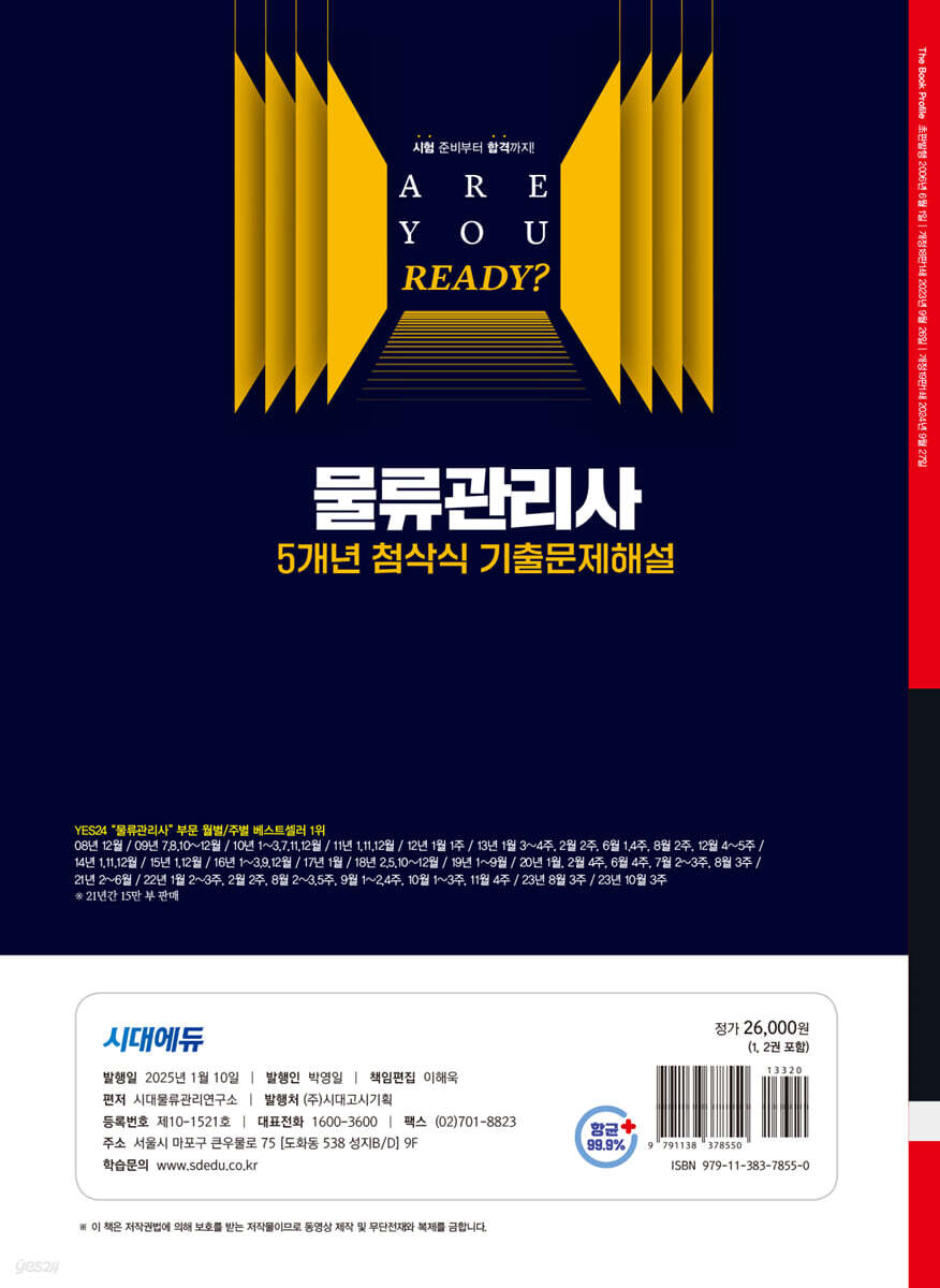 수험준비에 있어서 기출문제를 분석하고 유형문제를 풀어보는 것만큼 좋은 학습방법은 없습니다. 혼자서도 독학이 가능하도록 꼼꼼하고 상세한 첨삭식 해설로 시험을 처음 접해보는 초보자들이 시험의 출제경향을 파악하거나, 시험 마무리 단계에 있는 수험생들이 최종정리용으로 활용해도 무리가 없습니다. 본서가 물류관리사 자격 취득을 이루고자 하는 수험생들에게 도움을 줄 수 있기를 바라며, 모든 수험생들이 합격의 기쁨을 얻을 수 있기를 기원합니다. |