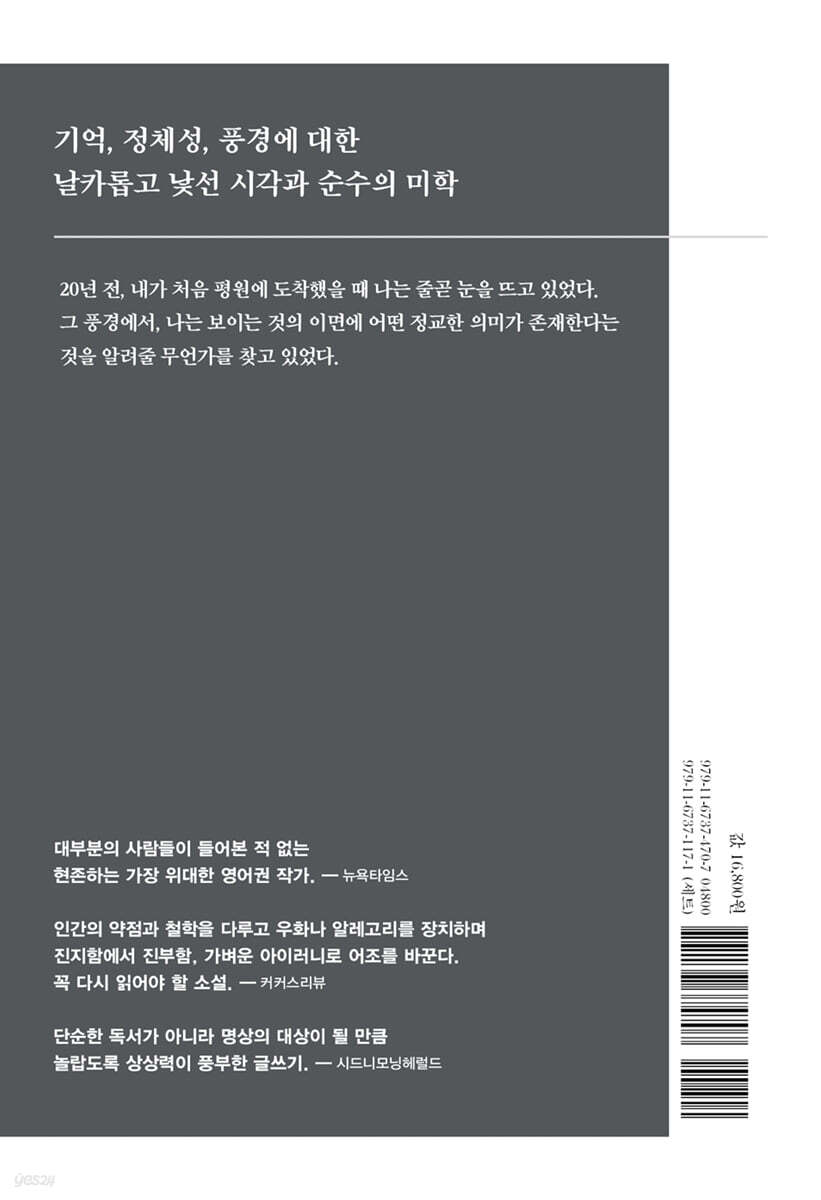 --- p.15 자신의 욕망이 자신을 가장 광활한 땅에서도 벗어나게 할 수 있음을 아는 그런 시인의 시를 읽고 싶은 겁니다. (…) 하지만 오로지 시(詩)만이 고동치는 별들로 가득 찬 하늘 아래 그 뜨겁고 무더운 도시에서 우리가 진짜로 하고 있었던 일을 설명할 수 있을 겁니다. --- p.67 예술 형식 중 오로지 영화만이 꿈의 머나먼 지평선이 실제로 거주할 수 있는 지역임을 보여줄 수 있다고, 또 동시에 익숙한 풍경을 오로지 꿈에나 어울릴 모호한 풍경으로 바꿀 수 있다고 선언했다. 그리고 거기에서 더 나아가 영화는 평원인의 모순된 충동을 만족시킬 수 있을 유일한 예술 형식이라고 주장했다. --- p.71 단순한 이미지 하나로 표현될 수 있을 평원이 어딘가 있긴 한 건가? 어떤 어휘가 혹은 어떤 카메라가 내가 지난 몇 주 동안 그리도 자주 들었던 그 평원 안의 평원을 드러낼 수 있을까? --- p.75 나는 그림을 향해 천천히 걸어가며 기억과 비전과 꿈에 관한 영화의 첫 프레임에 어울리는 음악을 흥얼거렸다. --- p.86 우리의 모든 경험이, 잠시 존재했다는 것 외엔 아무 의미도 없는 듯한 이들 미미한 발견보다 중요하지 않다면 과연 어떻게 될까? 타인에게 설명될 수 없다는 점 때문에 지각, 기억, 가정의 가치가 줄어드는 것이 아니라 오히려 커진다는 것을 확신할 수 있다면 그 사람은 자신의 행동을 어떻게 재정돈하게 될까? 또는 소위 보편적인 진실을 찾는 일에서 해방되어 그 자신 고유의 진리 탐구를 통한 진실을 얻을 수 있다면 성취하지 못할 것이 무엇일까? --- p.97 그런데 그들은 이야기와 노래에서 ‘시간’을 말할 때면, 친숙하지만 두려운 평원처럼 그들에게 밀려오거나 물러난다고 표현한다. --- p.100 우리가 부주의한 언사로 현실이라 부르는 것은 실은 우연한 시각과 청각의 배합일 뿐이므로 이것을 넘어 오래 지속되는 가능성이 진정한 가치를 지닌다는 것이다. 심지어 소수의 평원인은 그러한 현실에서의 실현은 모든 가능성의 소멸이라고도 말한다. --- p.111 “평원은 오래전에 사라졌어, 내가 보고자 했던 그 땅은. ‘위대한 어둠.’ 그것이 우리의 모든 평원이 있는 곳 아닌가? 그런데 우리의 평원은 안전해, 상당히 안전해. 그리고 평원 저 멀리, 너무 멀어서 자네와 내가 갈 수 없는 곳, 거기에서는 날씨가 바뀌고 있네. 우리 위의 하늘이 점점 밝아지고 있어. 또 다른 평원이 모두 우리 평원을 향해 밀려오고 있어. 우리는 눈 모양의 세계 안 어딘가를 여행하고 있는 것이네. 그리고 우리는 그 눈이 내다보는 다른 땅들을 아직 보지 못했어.” --- p.134 |