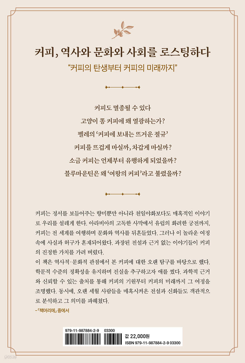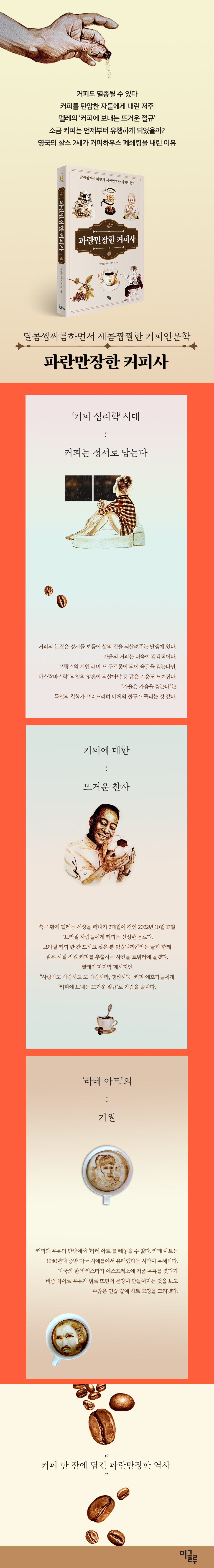 --- 「가을에는 커피가 생각난다」 중에서 아이스 아메리카노의 인기도 맛으로 풀이할 수 있다. 뜨거운 커피에 비해 한 모금 가득 입안에 담을 수 있어 ‘양적 포만감’이 뛰어나다. 그 덕분에 입안의 점막을 눌러주는 강도가 상대적으로 강해 보디감이 뜨거운 커피보다 되레 묵직하고, 그로 인한 만족감이 크다. 차가움으로 인한 첫인상이 강렬하고 상쾌해 기분 전환에도 더욱 효과적이다. 또 카페인의 각성 효과는 마신 뒤 20~30분이 지나야 서서히 나타나는데, 이 공백 기간을 아이스 아메리카노는 청량감으로 메워준다. 마시는 즉시 깨어나는 듯한 물리적 자극을 준다는 점도 ‘따아’가 ‘아아’를 이겨내기 어려운 이유 중 하나다. --- 「얼어 죽어도 아이스 아메리카노」 중에서 미국 남북전쟁의 스타는 커피였다. 워싱턴 D.C.에 있는 스미스소니언국립미국사박물관의 큐레이터인 존 그린스펀(Jon Grinspan)은 「커피는 어떻게 남북전쟁을 부채질했는가?(How Coffee Fueled the Civil War)」라는 2014년 7월 9일 『뉴욕타임스』 기사에서 “전쟁, 총알, 대포, 노예, 어머니, 심지어 링컨”이라는 단어보다 “커피”가 당시 병사들의 일기에 더 많이 등장한다고 말했다. 이 박물관에 보관된 한 병사의 일기는 커피가 얼마나 절실한 ‘무기’였는지 짐작하게 해준다. 북군의 기습부대 요원 에베네저 넬슨 길핀(Ebenezer Nelson Gilpin)은 전쟁이 막바지로 치닫던 1865년 4월의 일기에 “모든 것이 혼란스럽다. 긴장감은 견딜 수 없을 정도다. 보급품이 전보다 4분의 1로 줄었으며 커피 보급 자체가 끊겼다. 커피 없이는 임무 수행이 불가능하다”고 적었다. --- 「커피는 남북전쟁에서 군인의 무기였다」 중에서 1936년 12월 당시 대표적 교양잡지인 『삼천리』가 비너스, 낙랑파라, 모나리자 등 3개 다방의 마담들을 초대해 좌담을 하고 글을 게재할 정도로 이들은 지식인으로 대접받았다. 실제 이들 다방의 마담은 영화배우 복혜숙(卜惠淑), 영화배우 김연실(金蓮實), 가수 강석연(姜石燕)이 각각 맡고 있었다. 이 시기에 다방은 마담이 누구냐에 따라 품격이 정해졌다. 당대 최고 배우인 복혜숙은 이화여전을 나오고 일본 유학까지 다녀온 인텔리 신여성으로 존중받았는데, 훗날 대통령이 되는 윤보선과 이승만 정부에서 내무부 장관을 지낸 조병옥이 비너스의 단골이었다. 한국인이 주인인 최초의 다방으로, 영화감독 이경손이 1927년 문을 연 ‘카카듀’는 하와이 교포로서 목사의 딸인 ‘미스 현’이라는 미모의 여성이 마담을 맡았다. --- 「‘다방 마담’은 어떻게 ‘다방 레지’로 전락했는가?」 중에서 커피에 담긴 스토리를 함께 소비하는 것은 커피를 마시는 행복을 더욱 풍성하게 만들어준다. 하지만 커피값이 통념을 깨고 너무 비쌀 때는 의심해도 좋다. 좋은 커피는 산지마다 반드시 있다. 잘 익은 커피 열매만을 수확해 제때 가공하고 보관하면 소비지의 커피 애호가들을 감동시킬 충분한 맛을 발휘한다. 일부 고가 커피들이 전반적으로 커피 품질을 높이는 긍정적인 역할을 하는 측면이 있기는 하지만, 그런 현상이 커피 문화에 사치를 부추기는 잡음이 되어서는 곤란하다. 제값을 주고 커피를 마시는 운동은 형편이 어려운 나라의 공정무역 커피뿐만 아니라 ‘사치품 커피’에도 마땅히 적용되어야 한다. --- 「세상에서 가장 비싼 커피가 탄생했다」 중에서 카페인이 인체에서 어떤 역할을 하는지에 대해서는 괴테의 시대에는 알 수 없었다. 인간의 영혼에 작용해 위험해 보이면서도 집중력을 높여주고 활력도 넘치게 하는 장점도 지녔다는 것은 분명해 보였다. 카페인이 발견된 뒤 60여 년이 지난 1884년에야 카페인의 화학구조는 독일의 헤르만 에밀 피셔(Hermann Emil Fischer)에 의해 규명되었다. 카페인이 신경전달물질인 아데노신과 모양이 비슷한 덕분에 뇌에 직접 작용할 수 있다는 사실이 밝혀진 것이 이때였다. 이 무렵부터 디카페인 생두가 움트기 시작한다. 카페인이라고 하는 명확한 대상과 그것을 제거할 수 있는 구조가 밝혀졌기 때문이다. --- 「디카페인 커피는 어떻게 발명되었을까?」 중에서 커피도 마시는 사람과 함께 나이 들어간다. 커피를 오랜 친구처럼 사귀면 정서적인 도움을 받는 것뿐만 아니라 건강 관리에도 유익하다. 늘 마시던 커피가 어느 날부터 다르게 느껴지기 시작했다면, ‘커피의 변심’을 의심하지 말고 ‘내 몸에 변화가 있지 않나’ 하고 생각할 일이다. 맛으로 노화를 자각할 수 있는 것은 ‘커피라는 오랜 친구의 선물’이다. 입맛이 떨어지는 것은 단지 날씨 탓만이 아니다. 특히 노인의 미각 변화는 주변 사람들이 함께 관찰해주면 좋다. 맛을 느끼는 세포는 젊고 건강할 때는 1만 개가량이 된다. 청력과 시력이 점점 떨어지는 것처럼 대체로 40~50대부터 미각세포 숫자가 줄어들고, 기능도 떨어져 맛 감각이 둔감해진다. 60대로 접어들면 후각과 미각 능력이 저하되는 속도가 더욱 빨라진다. --- 「미각도 늙는다」 중에서 여러 연구에서 커피는 인지 기능, 항산화 효과, 사망률 감소, 심혈관 질환, 당뇨병, 간질환, 일부 암에 긍정적인 효과를 보이면서도 후두암, 유산, 의존 증상, 금단 증상 등 부정적인 결과