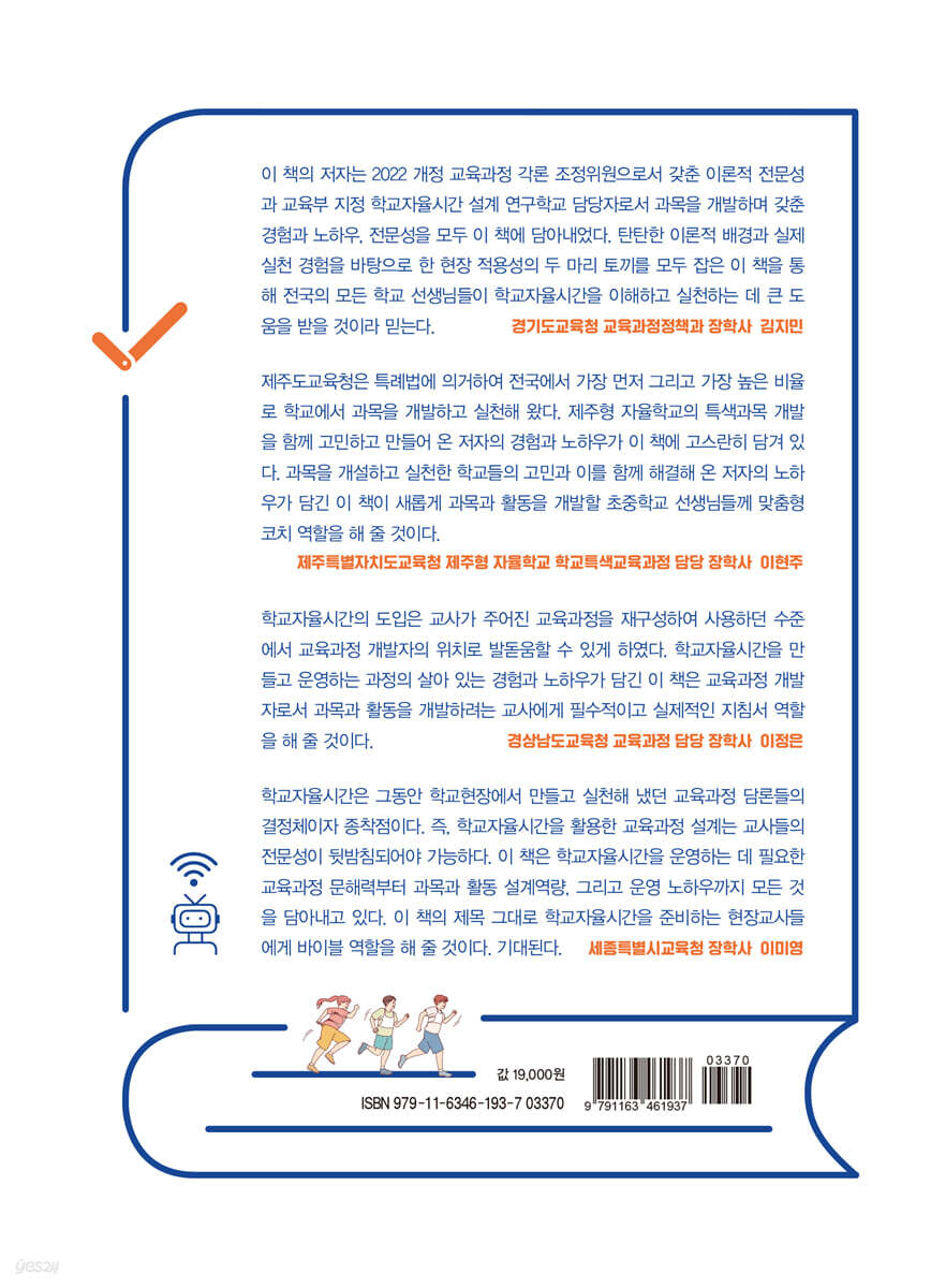이 책의 저자는 2022 개정 교육과정 각론 조정위원으로서 갖춘 이론적 전문성과 교육부 지정 학교자율시간 설계 연구학교 담당자로서 과목을 개발하며 갖춘 경험과 노하우, 전문성을 모두 이 책에 담아내었다. 탄탄한 이론적 배경과 실제 실천 경험을 바탕으로 한 현장 적용성의 두 마리 토끼를 모두 잡은 이 책을 통해 전국의 모든 학교 선생님들이 학교자율시간을 이해하고 실천하는 데 큰 도움을 받을 것이라 믿는다. - 김지민 (경기도교육청 교육과정정책과 장학사)