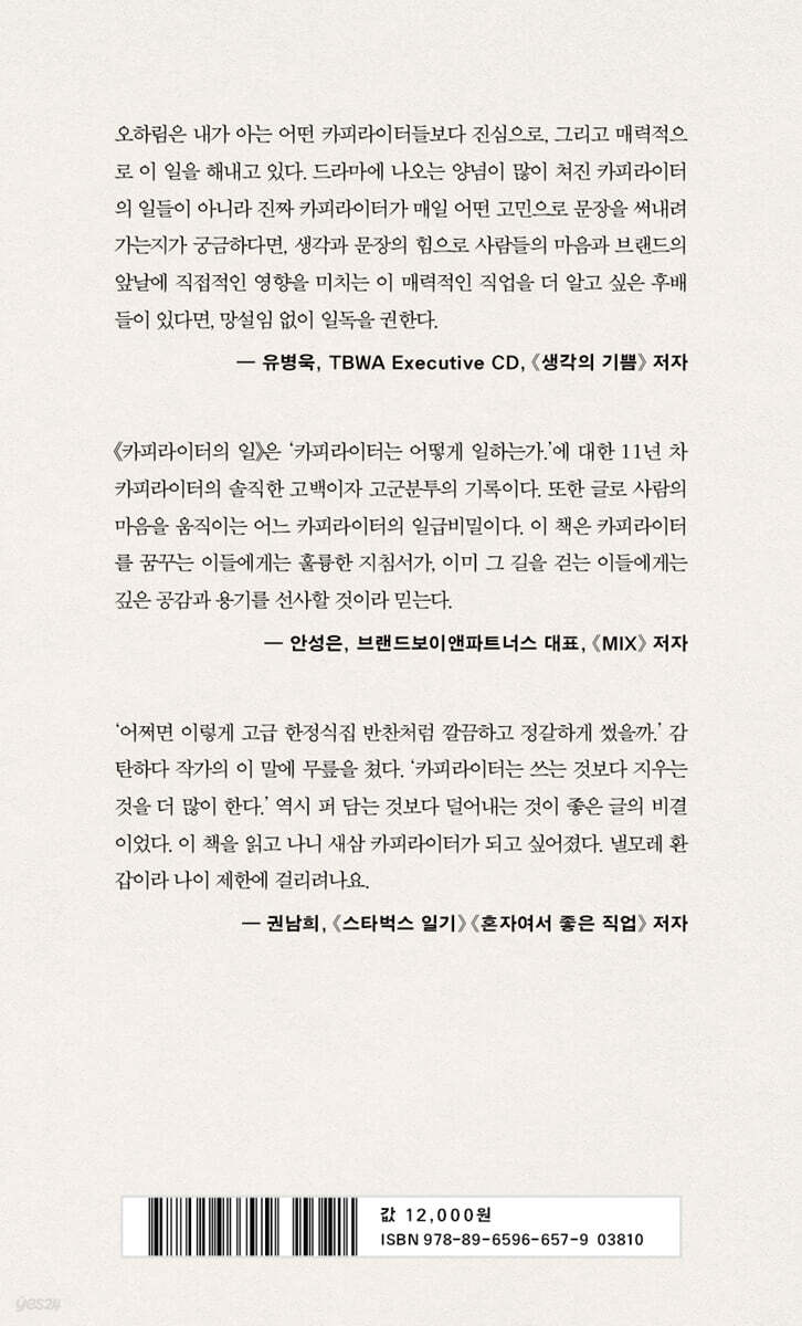 카피라이터의 일이 단지 재미있는 단어들의 조합으로 대중을 즐겁게 만드는 일이 아니라 브랜드를 향한 오랜 고민 끝에 알맞은 목소리를 입혀 큰 소리로 외치는 일이라면, 오하림은 내가 아는 어떤 카피라이터들보다 진심으로, 그리고 매력적으로 이 일을 해내고 있다. 그리고 이 책은 그 과정들을 그녀 특유의 섬세한 단어들의 조합으로 빠짐없이 설명한다. 평범을 비범으로 바꾸는 팁들을 알차게 모은 뒤, ‘카피는 이래야 한다.’라고 쉬운 말투로 표현한다. 드라마에 나오는 양념이 많이 쳐진 카피라이터의 일들이 아니라 진짜 카피라이터가 매일 어떤 고민으로 문장을 써내려 가는지가 궁금하다면, 생각과 문장의 힘으로 사람들의 마음과 브랜드의 앞날에 직접적인 영향을 미치는 이 매력적인 직업을 더 알고 싶은 후배들이 있다면, 망설임 없이 일독을 권한다. - 유병욱 (TBWA Executive CD, 《생각의 기쁨》 저자)