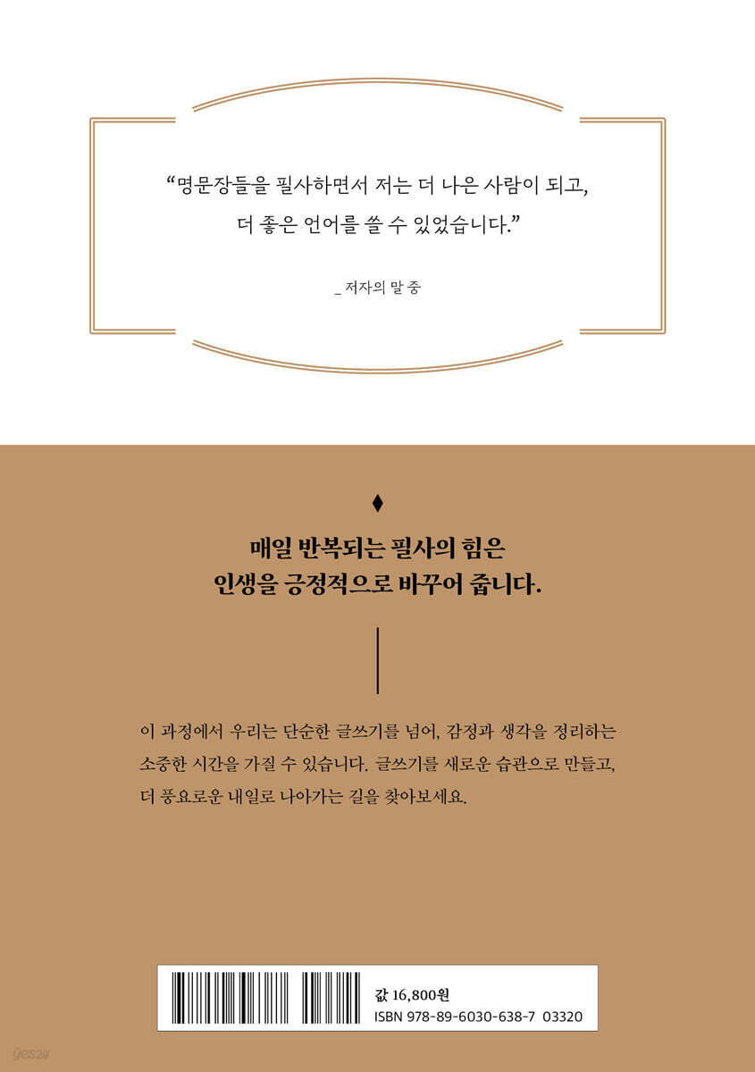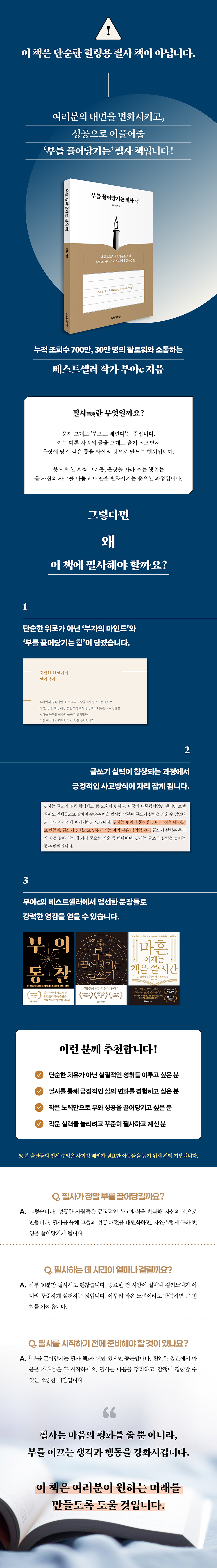 글쓰기와 ‘이것’ 덕분 부아c는 글쓰기가 돈도, 인맥도, 능력도 필요 없이 누구나 시작할 수 있는 강력한 도구라고 강조한다. 필사는 이러한 글쓰기의 힘을 더 깊이 있게 체험할 수 있는 방법으로, 저자는 자신의 이야기를 통해 영향력을 키우고, 그 영향력을 돈으로 변환시킬 수 있음을 보여준다. 그가 말하는 '부를 끌어당기는 필사'는 단순한 글쓰기 연습이 아닌, 다른 사람과 매끄럽게 소통할 수 있도록 도와주는 존재다. 필사를 꾸준히 하는 사람은 다른 사람의 마음을 감동시키는 글을 쓸 수 있다. 다른 사람이 쓴 훌륭한 문장들이 머릿속에 가득해서다. 내 글을 좋아하는 팬이 늘기를 바란다면 지금 바로 필사부터 도전해 보라. 필사는 단순한 글쓰기 연습을 넘어, 당신의 꿈을 실현하고 더 많은 독자들과 소통할 수 있는 길을 열어줄 것이다. 몸과 마음, 나아가 인생까지 업그레이드 시켜주는 필사의 힘 인생에 큰 변화가 필요하다면 오늘부터 ‘필사’를 시작하라. 필사는 사고를 한 단계 끌어올리는 과정으로, 삶을 긍정적으로 발전시킨다. 마음을 안정시키면서 사고방식을 바꾸는 역할을 하기에 그렇다. 글의 의미를 몸으로 익히는 과정에서 우리는 자아를 되돌아보고, 또 다른 관점을 발견하게 된다. 동시에 무언가를 지속적으로 실천하면서 자기 효능감을 높일 수 있다. 또한, 우리는 반복적인 글쓰기 과정을 통해 작은 성취감을 경험하게 된다. 이러한 작은 성취는 자신감을 불어넣고, 스트레스를 완화하는 데 도움을 준다. 동시에 끈기를 키우는 데도 중요한 역할을 한다. 필사하는 과정에서 얻은 집중력은 업무와 개인적 목표를 설정하고 달성하는 데 도움을 줄 수 있다. 꾸준한 베껴 쓰기, 성공의 기반이 되는 첫걸음 필사는 모방을 통해 좋은 작품을 창출해 내는 방식이다. 좋은 작품은 대개 모방에서 시작된다. 저자 역시 수많은 블로그 글을 읽고, 그중에서도 좋은 문장이 있으면 저장해두는 습관이 있다. 그중에서도 특히나 감명 깊은 문구는 필사를 한다. 저자는 베껴 쓰기의 과정을 통해 글의 흐름과 표현 방식을 글쓰기에 자연스럽게 녹여낸다. 소비하는 것이 아닌, 체화하는 단계로 나아가기에 글을 성공적으로 완성하는 데 중요한 밑거름이 되는 것이다. 좋은 문장에 독창적인 생각을 덧붙여 도출한 결과물은 훌륭할 수밖에 없다. 또한, 베껴 쓰기를 하다가 글감이 생각나거나 이야기의 토대를 발견하기도 한다. 결국, 베껴 쓰기는 자신만의 스타일을 찾도록 도와주어 성공의 기반이 된다. |