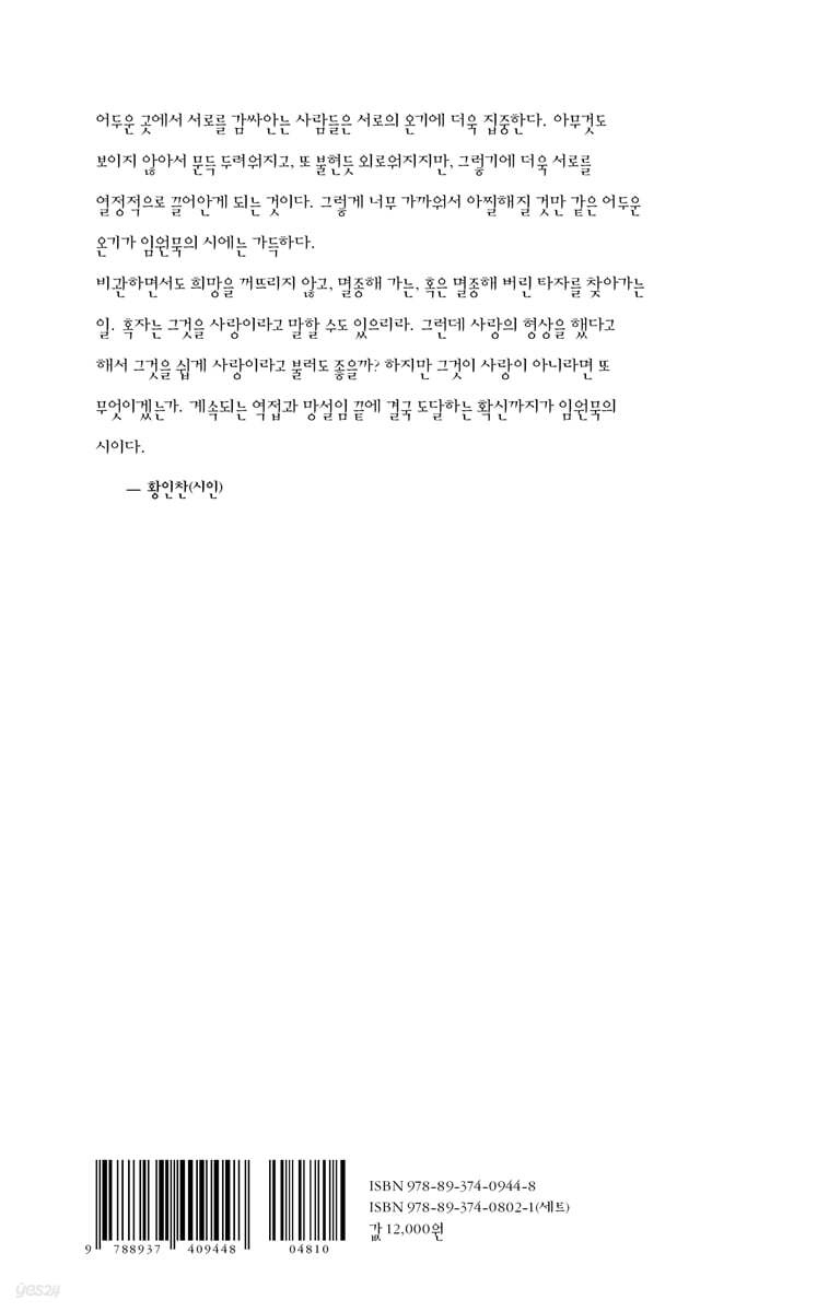 어두운 곳에서 서로를 감싸안는 사람들은 서로의 온기에 더욱 집중한다. 아무것도 보이지 않아서 문득 두려워지고, 또 불현듯 외로워지지만, 그렇기에 더욱 서로를 열정적으로 끌어안게 되는 것이다. 그렇게 너무 가까워서 아찔해질 것만 같은 어두운 온기가 임원묵의 시에는 가득하다. 비관하면서도 희망을 꺼뜨리지 않고, 멸종해 가는, 혹은 멸종해 버린 타자를 찾아가는 일. 혹자는 그것을 사랑이라고 말할 수도 있으리라. 그런데 사랑의 형상을 했다고 해서 그것을 쉽게 사랑이라고 불러도 좋을까? 하지만 그것이 사랑이 아니라면 또 무엇이겠는가. 계속되는 역접과 망설임 끝에 결국 도달하게 되는 확신까지가 임원묵의 시이다. - 황인찬 (시인)