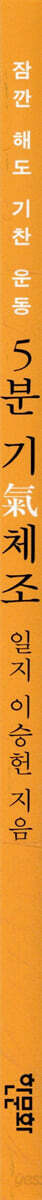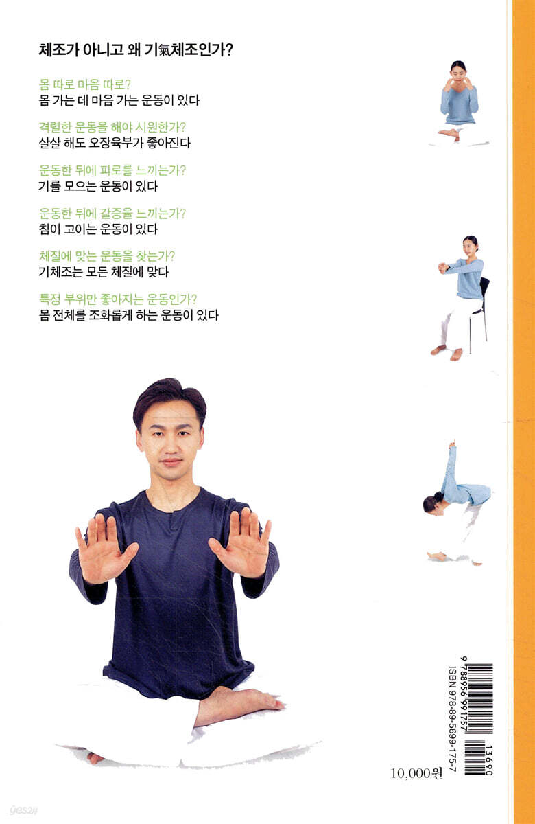 1부 체조가 아니고 왜 기체조인가? 몸 따로, 마음 따로? 몸 가는데 마음 가는 운동이 있다 운동한 뒤에 갈증을 느끼는가? 침이 고이는 운동이 있다 운동한 뒤에 피로를 느끼는가? 기를 모으는 운동이 있다 체질에 맞는 운동을 찾는가? 기체조는 모든 체질에 맞다 격렬한 운동을 해야 시원한가? 살살 해도 오장육부가 좋아진다 특정 부위만 좋아지는 운동인가? 몸 전체를 조화롭게 하는 운동이 있다 기운 가지고 놀기: 기를 느끼고 모으고 보내보자 기운 느끼기/ 기운 모으기/ 기운 보내기 건강습관 만들기 1-활기찬 하루를 여는 기체조 6 기지개켜기/ 손뼊치기. 손비벼서 얼굴 쓸어주기/ 눈에 기운주기/ 치아 부딪히기/ 혀로 잇몸마사지 2부 사무실에서 쉽게 하는 상황별 기체조 유연성 체크: 내 몸은 얼마나 유연한가? 팔 비틀기/ 팔 뒤로 돌려잡기/ 상체 숙여 손짚기 오래 앉아있으면 기가 막힌다 긴장은 어깨에서 시작된다 고개를 떨군 채 오래 있지 마라 머리를 두드리면 잠든 뇌가 깨어난다 책이나 모니터를 가까이 한 위에는 눈동자를 돌리자 나른하고 정체된 기분이 들 때는 손을 들어 올려라 키보드를 열심히 두드렸다면 손가락을 깍지 껴라 등이 무겁고 소화가 안 될 때는 등 뒤로 깍지를 끼고 상체를 숙여라 건강습관 만들기 2-숙면을 위한 기체조 6 다리 벌리고 옆구리 기울이기/ 다리 뻗어 윗몸 숙이기/ 다리 벌리고 앞으로 숙이기/다리 들어 넘기기/ 엎드려서 다리 들고 넘기기/ 허공자세 3부 집안에서 자주하면 좋은 증상별 기체조 근력 체크: 내 몸은 얼마나 근력이 있는가? 상체 들어올리기/ 나룻배 자세/ 앉았다 일어서기 아랫배를 두드리면 오장육부가 튼튼해진다 장운동으로 만병의 근원인 숙변을 없애자 피로가 몰려오면 탁한 기운을 털어내자 머리 아프고 잠 못 이루는 밤에 발끝을 부딪치자 등근육을 풀어주면 젊어진다 가슴이 시원해지는 활쏘기로 감기를 예방한다 천지 밀기로 단매한 마음을 기르자 허리에서 다리까지 통증이 사라진다 건강습관 만들기 3: 누구나, 언제 어디서나 짬짬이! 찜질방에서 허리를 비틀어라/ 머리 감으면서 톡톡톡~/ 텔레비전 앞에서 골반을 교정하라/ 지하철이나 버스 안에서 항문을 조여라/ 오래 서 있을 때는 무릎을 굽혀라/ 공원이나 산에서 막힌 가슴을 뚫어라 증상별 기체조 찾아보기 부록 본문 속의 주요 경락 기체조 수련장 안내 |