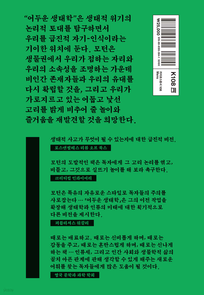모턴은 특유의 자유로운 스타일로 독자들의 주의를 사로잡는다 … 『어두운 생태학』은 그의 이전 작업을 확장해 생태학과 인류의 미래에 대한 획기적으로 다른 비전을 제시한다. - 퍼블리셔스 위클리