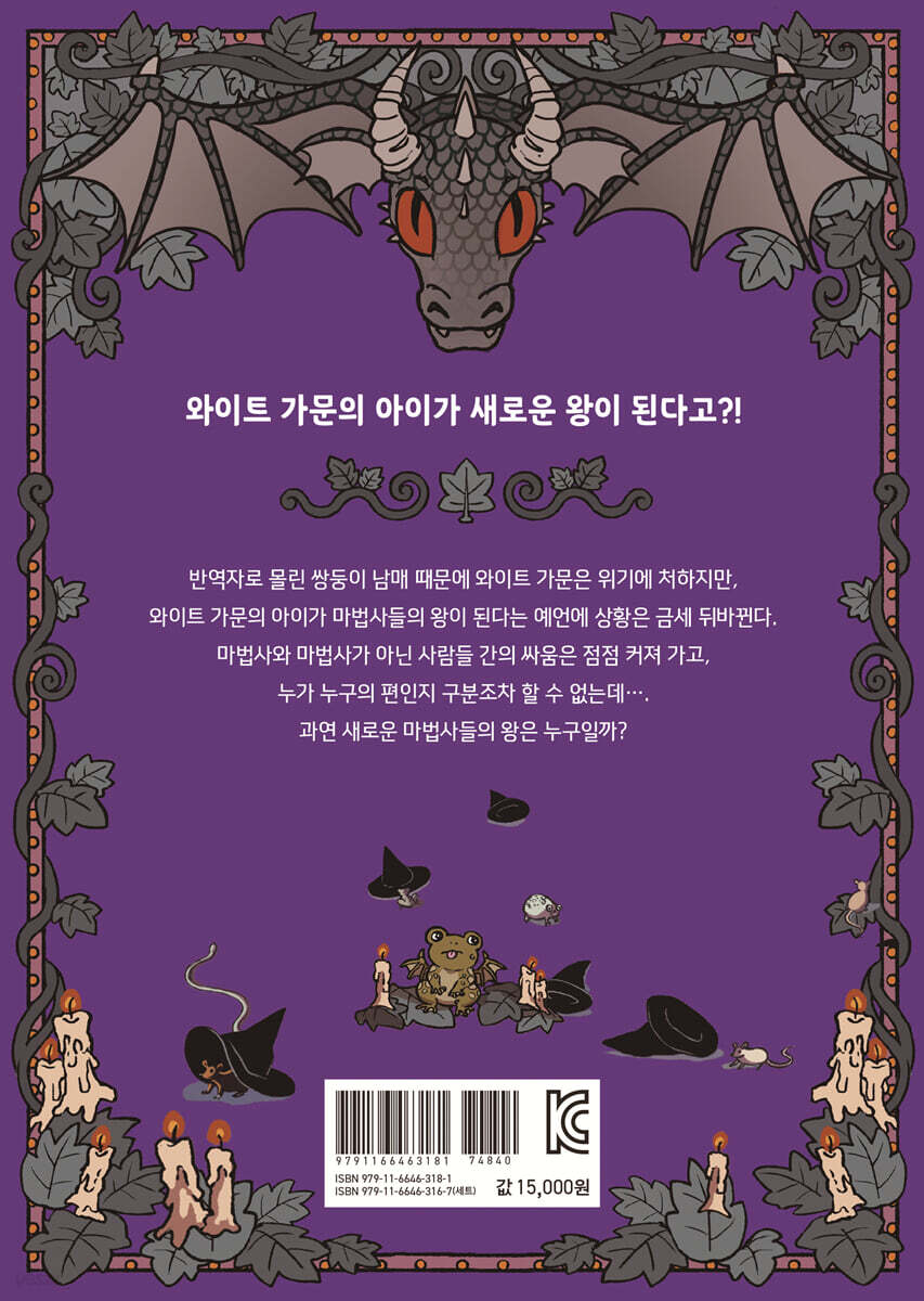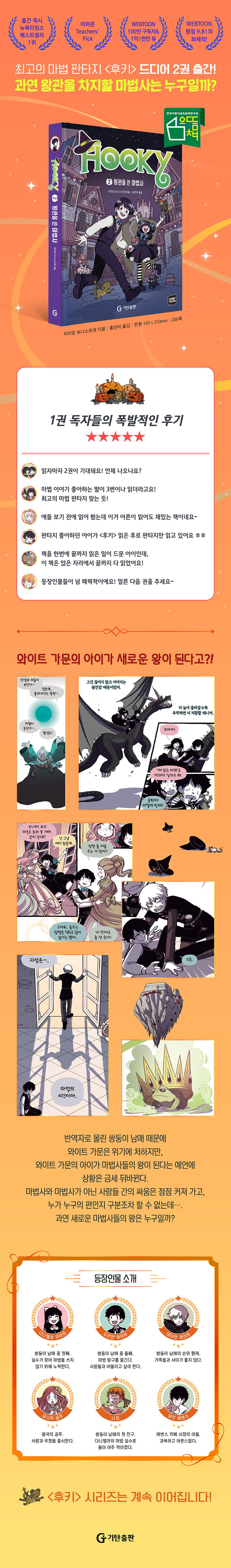 뉴욕타임스 베스트셀러 1위 & 아마존 Teachers' Pick! 〈후키〉 시리즈는 ‘WEBTOON’ 연재 당시 평점 9.81을 기록하며, 100만 구독자 달성과 1억 1천만 뷰라는 엄청난 기록도 세웠어요. 영미권 웹툰이지만 우리나라에서도 팬 사이트가 지속적으로 운영될 정도였지요. 〈후키〉 시리즈가 웹툰으로 연재될 때부터 팬클럽이 있었던 이유는 입체적이고 매력적인 등장인물들, 마법 판타지가 가미된 세계관, 감각적이고 화려한 일러스트 등을 꼽을 수 있어요. 웹툰이 인기리에 완결된 이후 그래픽 노블로 재탄생한 〈후키〉 시리즈는 출간하자마자 큰 화제를 불러일으키며 뉴욕타임스 베스트셀러 1위를 차지했으며, 아마존 Teachers‘ Pick으로 선정되는 쾌거도 이루었답니다. 검은 옷을 벗은 다니엘라, 외로운 니코, 대립하는 도리안과 데미안까지 각양각색 등장인물들의 자아 찾기 프로젝트! 다니엘라는 자신이 마법을 쓸 때마다 상황을 나쁘게 만든다는 생각에 빠져 마법을 쓰지 않기로 결심해요. 마스터 펜드래건 손에서 자란 니코는 마스터에게 인정받는 마법사가 되기 위해 오랫동안 노력했지만, 마법 능력이 생기지 않았지요. 마법 능력이 뛰어난 도리안에게 질투심도 느껴요. 데미안은 부모님을 나쁜 마법사라고 생각하기 때문에, 마법사가 아닌 사람들 편에 서지요. 그러다 동생인 도리안과 마주치고 둘은 심하게 다퉈요. 서로를 나쁜 마법사로 여기면서요. 《후키2 - 왕관을 쓴 마법사》에 나오는 인물들은 각자 선과 악을 어떻게 판단할지, 자신이 앞으로 무엇이 될지 고민하고 있어요. 이 책을 읽는 독자들 역시 비슷한 고민을 한 적이 있거나 지금 하고 있을 수도 있어요. 방황하는 쌍둥이 남매와 친구들을 통해 내가 가졌던, 혹은 갖고 있는 고민에 대해 돌이켜 보는 건 어떨까요? 두근두근, 무도회에서 펼쳐지는 가슴 설레는 이야기 ‘못다 한 이야기’에서 주인공들의 속마음도 엿보세요! 왕궁에서 초대형 무도회가 열리자, 모니카 공주는 친구들에게 ‘왕궁 파티에서 지켜야 할 기본 규율’을 알려 줍니다. 특히, 댄스 수업에 가장 열성을 보여요. 사랑과 연애를 중시하는 모니카 공주에게 무도회란? 맞아요! 파트너와의 커플 의상부터 춤추는 매너까지 모든 게 정말정말 중요해요. 이미 파트너 선정부터 모든 계획을 완벽하게 짜 놨는데… 이런, 친구들이 생각대로 따라 주지 않네요. 무도회에서는 어떤 일들이 펼쳐지게 될까요? 본문 마지막에는 제7장과 제10장의 뒷이야기가 에필로그처럼 실려 있어요. 주인공들의 알쏭달쏭 속마음이 제대로 포착되지요. 과연 모니카 눈에만 특별하게 보이는 사람은 누구일까요? 또 니코가 본인도 모르게 자꾸 시선이 갔던 사람은 누구일까요? ‘못다 한 이야기’를 읽으며 등장인물들의 재미난 에피소드도 확인해 보세요! |