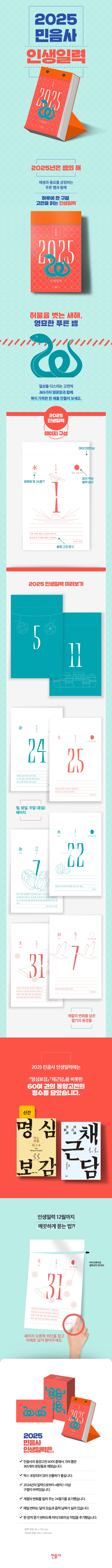 재생과 풍요를 상징하는 푸른 뱀과 함께 하루에 한 구절 고전을 읽는 인생일력 2018년부터 많은 사랑을 받아온 민음사의 오리지널 콘텐츠 ‘인생일력’이 올해에도 찾아왔습니다. 2025년은 ‘푸른 뱀의 해’인 을사년. 허물을 벗으며 새롭게 태어나는 뱀은 재생과 풍요를 상징하는 영험한 존재인데요. 푸른 뱀과 함께 24절기마다 우리 세시풍속을 일러스트로 담은 민음사 인생일력은 매일을 의미 있고 정감 있게 채웁니다. 고전 속 365가지 명문장과 함께, 복 있는 새해를 맞이하세요. 『논어』와 『사기』에서 『채근담』과 『명심보감』까지 민음사의 동양고전 60여 권을 인생일력에 정성껏 담았습니다 인생일력 한 권에는 민음사의 동양고전 60여 권이 담겨 있습니다. 『논어』, 『맹자』, 『대학』, 『중용』과 『사기 열전』, 『한서 열전』, 『채근담』, 『명심보감』(근간) 등의 고전은 오랜 세월을 전해 온 넓고 깊은 지혜를 들려줍니다. 『삼국유사』에 실린 소박하고 아름다운 향가와 『한국 산문선』의 엄선된 우리 옛글은 바로 이 땅에서 살았던 옛사람의 이야기를 정답게 전하고요. 책상 위에 두고 매일 뜯으며, 낱장에 그날의 느낌을 적으며 하루를 갈무리해 보세요. 당신의 하루가 소중한 기록이 됩니다. |