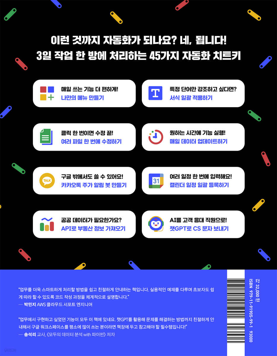 업무에서 구글 스프레드시트와 구글 설문을 정말 많이 활용하는데, 추가로 구현하면 좋겠다 싶었던 기능이 모두 이 책에 있네요! 챗GPT를 활용해 문제를 해결하는 방법까지 친절하고 자세히 안내되어 있어서 코딩을 조금 할 줄 알고 구글 워크스페이스를 평소에 많이 쓰는 분이라면 책장에 반드시 두고 참고해야 할 필수템입니다! - 송석리 (교사,《모두의 데이터 분석 with 파이썬》저자)