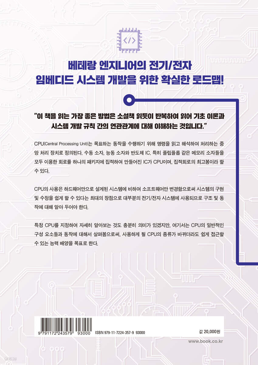 1. CPU 일반 1.1. CPU의 구조 및 동작 1.2. 명령어 구조와 실행 파일 1.3. CPU 동작을 위한 주변 하드웨어 1.4. 리셋 후 펌웨어 부팅 과정 1.5. 인터럽트 2. MCU(Micro Controller Unit) 2.1. GPIO 2.2. MCU 선택의 고려사항 3. 펌웨어의 동작 이해 3.1. CPU 의 동작과 바이너리 파일 생성 과정 3.2. 스타트업 프로그래밍 실습 II. 펌웨어 개발 규칙 1. 펌웨어의 설계 및 구현 규칙 1.1. 펌웨어 구조 1.2. 펌웨어의 환경 설정 1.3. 펌웨어의 안전성 1.4. 펌웨어의 성능 1.5. 펌웨어의 양산 및 유지보수 III. 펌웨어 설계 및 개발 1. 시스템 개발 프로세스 2. 시스템 요구사항 및 펌웨어 설계 2.1. 시스템 요구사항 2.2. 펌웨어 설계 3. 제어기로 보는 코드 구현 순서 3.1. ON/OFF 제어기 3.2. 온도 제어기의 설계 및 코드 구현 3.3. 채터링 방지 알고리즘 4. 데이터 취득 및 처리 4.1. ADC 와 DAC&PWM 4.2. 수치 해석 4.3. 디지털 필터 5. 통신 5.1. 직렬 통신 일반 5.2. 직렬 통신 종류 5.3. 자료 구조론 5.4. 모드버스(Modbus) 펌웨어 구현 IV. [참고] 디버깅 |
