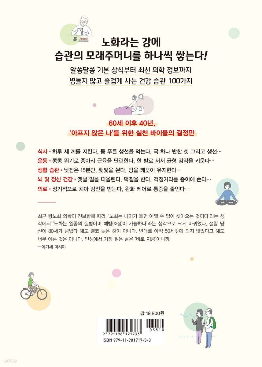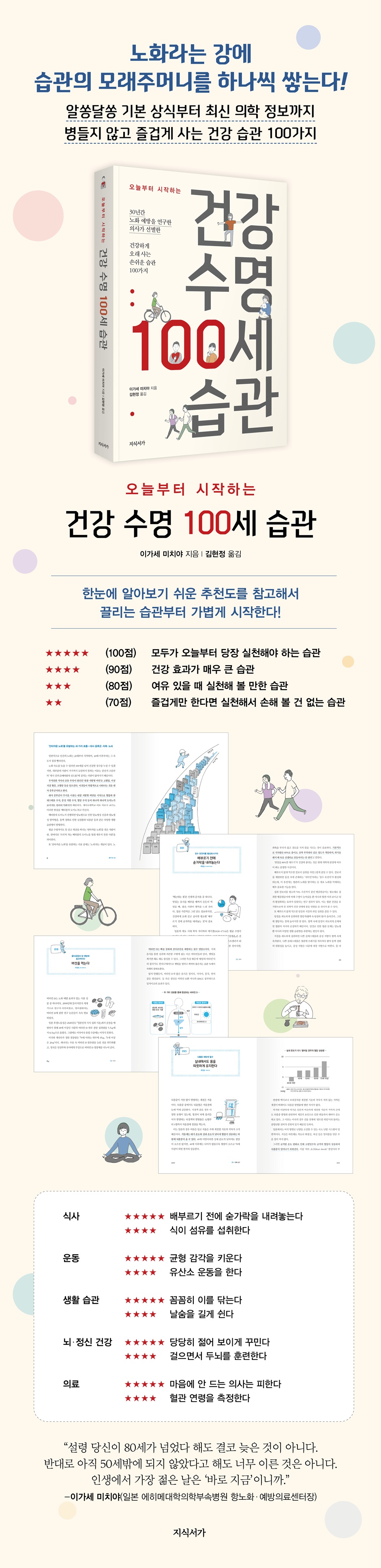 100가지 습관에 대한 총론 ※참고: 별표(★)는 저자의 추천도입니다. 1장 식사 기본 설명 ★★★★★ 001 배부르기 전에 숟가락을 내려놓는다 ★★ 002 야채를 먼저 먹고, 탄수화물은 나중에 ★★★★ 003 적게 먹더라도 하루 세 끼를 유지한다 ★★★★ 004 ‘국 하나, 반찬 셋 그리고 생선’이 기본 ★★★ 005 ‘맛있는 저염식’을 먹는다 ★★★ 006 슈퍼 향신료를 사용한다 ★★★ 007 질 좋은 기름을 쓴다 ★★★ 008 고기는 굽거나 튀기지 않는다 ★★ 009 하루 적정 칼로리를 유지한다 ★★ 010 일주일에 한 번 치팅 데이를 갖는다 ★★★★ 011 콩류 식품을 섭취한다 ★★★★ 012 낫토를 먹는다 ★★ 013 견과류를 챙겨 먹는다 ★★★★ 014 마늘을 먹는다 ★★★★★ 015 등 푸른 생선을 먹는다 ★★ 016 달걀을 먹는다 ★★ 017 유제품을 챙긴다 ★★★★ 018 버섯을 먹는다 ★★★★ 019 식이 섬유를 섭취한다 ★★ 020 항산화 음식을 먹는다 ★★★ 021 껍질째 먹는다 ★★★★ 022 저혈당식을 먹는다 ★★★ 023 지중해식으로 먹는다 ★★★ 024 술을 마실 거라면, 레드와인으로 ★★ 025 매일 양명주 마시기 ★★★ 026 루이보스티를 마신다 ★★★ 027 영양제로 영양을 보충한다 ★★★★ 028 나쁜 콜레스테롤을 줄인다 ★★ 029 노릇노릇 고소한 냄새가 나는 음식은 자제한다 ★★★ 030 소시지와 햄을 자제한다 ★★★★ 031 트랜스 지방산을 피한다 ★★★ 032 나쁜 기름을 피한다 ★★★ 033 과당을 줄인다 ★★★ 034 당질 몬스터를 줄인다 ★★ 035 패스트푸드를 자제한다 2장 운동 기본 설명 ★★ 036 운동 목표를 정한다 ★★★★ 037 종아리를 강화한다 ★★★★ 038 대퇴 사두근을 강화한다 ★★★★ 039 척주 기립근과 뼈를 강화한다 ★★★★★ 040 균형력을 키운다 ★★ 041 모세 혈관의 혈류를 촉진한다 ★★ 042 악력을 키운다 ★★★★ 043 유산소 운동을 한다 ★★★★★ 044 하루에 4,000보 이상 걷는다 ★★ 045 자전거를 탄다 3장 생활 습관 기본 설명 ★★★ 046 멜라토닌으로 숙면한다 ★★ 047 수면 환경을 바꾼다 ★★ 048 주말에 일찍 일어난다 ★★ 049 낮에는 뒹굴거리지 않는다 ★★ 050 낮잠은 15분만 잔다 ★★★★ 051 살짝 뜨거운 물에 몸을 담근다 ★★★★ 052 담배를 줄이거나 피우지 않는다 ★★ 053 하루에 물을 2리터 마신다 ★★★ 054 햇빛을 쐰다 ★★ 055 매일 혈압을 측정한다 ★★ 056 노래를 부르거나 수다를 떤다 ★★★★★ 057 보청기를 끼고 대화한다 ★★★★ 058 날숨을 길게 쉰다 ★★ 059 림프 마사지를 한다 ★★ 060 눈 건강을 지킨다 ★★★★★ 061 꼼꼼히 양치한다 ★★ 062 편하고 질 좋은 옷을 입는다 ★★ 063 불필요한 것들은 버린다 ★★ 064 방을 깨끗하게 유지한다 ★★★ 065 실내에서도 몸을 따뜻하게 유지한다 ★★★ 066 목을 따뜻하게 한다 ★★★★ 067 자주 웃는다 ★★ 068 죽을 때까지 움직이며 일한다 ★★★ 069 운전 면허를 반납하지 않는다 4장 뇌·정신 건강 기본 설명 ★★ 070 텔레비전을 보기보다는 책을 읽는다 ★★ 071 생각하는 취미를 갖는다 ★★★★ 072 걸으면서 두뇌를 훈련한다 ★★ 073 옛날 일을 떠올린다 ★★ 074 한 달에 한 번은 짧은 여행을 떠난다 ★★ 075 아름다운 것을 본다 ★★★ 076 아이를 적극적으로 돌본다 ★★ 077 귀여운 반려동물과 함께 산다 ★★★★★ 078 장내 환경을 개선한다 ★★★ 079 꼭꼭 씹어 먹는다 ★★★ 080 마음을 차분히 가다듬는다 ★★★ 081 흥미로운 일에 도전한다 ★★ 082 덕질을 한다 ★★ 083 소셜 네트워크 서비스를 활용한다 ★★ 084 나보다 어린 선생님에게 배운다 ★★★★★ 085 당당히 젊어 보이게 꾸민다 ★★ 086 건강 염려증을 버린다 ★★★ 087 걱정거리를 종이에 쓴다 ★★★★ 088 살아 있음에 감사한다 5장 의료 기본 설명 ★★★ 089 항노화 검진을 받는다 ★★★ 090 대사 증후군 검사를 받는다 ★★★★ 091 혈관 연령을 측정한다 ★★★★ 092 뇌 검진을 받는다 ★★ 093 암 검진을 받는다 ★★ 094 정기적으로 치아 검진을 받는다 ★★ 095 백신은 맞고 싶을 때 맞는다 ★★★★★ 096 약은 최대 다섯 종류까지만 먹는다 ★★★★★ 097 마음에 안 드는 의사는 피한다 ★★★ 098 70세가 넘으면 수술을 받지 않는다 ★★★ 099 완화 케어로 통증을 줄인다 ★★★★ 100 아파도 즐거운 인생을 산다 맺음말_ 건강 수명 100세도 더 이상 꿈이 아니다 부록_ 증상별 추천 습관 베스트 5: 이 증상에는 이 습관이 좋다! 참고 문헌 |