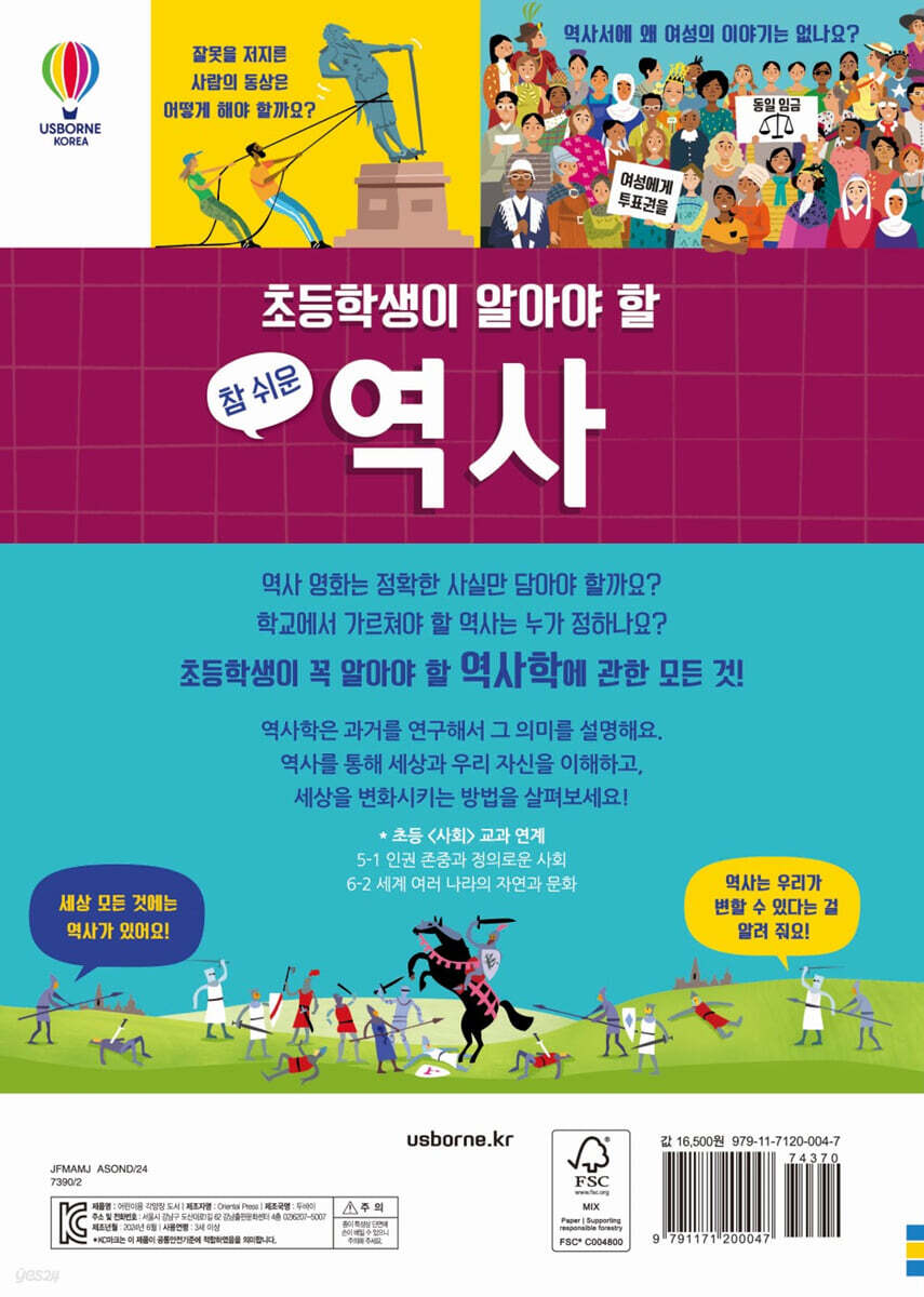 역사를 왜 배워야 하는지 알고, 나만의 역사관을 세워 보세요! 역사의 정의부터 역사 연구 방법, 역사를 탐구하는 다양한 접근법, 역사 연구의 의미까지, 역사를 둘러싼 여러 가지 개념과 지식을 사례 중심으로 풀어낸 역사 입문서 『초등학생이 알아야 할 참 쉬운 역사』가 어스본 코리아에서 출간되었다. 초등학생의 눈높이에 맞춘 간결한 설명과 풍부한 예시, 짜임새 있는 인포그래픽 형식이 어렵게 느껴질 수 있는 역사학의 원리와 주요 주제를 실제 역사 속에서 살펴보며 효과적으로 이해할 수 있도록 돕는다. 초등 〈사회〉 교과서 속 역사의 기본 개념을 이해하는 단계부터 역사와 관련된 다양한 이론, 역사를 연구하는 이유까지 한층 더 깊이 알려 준다. 어린이는 세계 역사의 실제 사례를 통해 역사를 바라보는 다양한 관점을 경험함으로써 유연한 사고로 사회와 사람들을 이해할 수 있다. 이처럼 어린이 스스로 우리가 사는 세상에 대해 능동적으로 고민하는 과정에서 사고력과 논리력, 문제 해결력이 길러진다. 역사가 어렵고 복잡하다는 편견은 이제 그만! 역사에 대해 잘 알지 못했던 아이들도 이 책을 읽으면서 쉽고 흥미진진하게 역사를 이해하고, 세상을 다양한 관점으로 바라볼 수 있는 시야를 갖게 될 것이다. ◆ 역사의 개념과 연구 방법부터 역사를 통해 오늘날의 세계를 이해하기까지 초등학생이 꼭 알아야 할 역사의 모든 것 * 초등 〈사회〉 교과 연계 5-1 인권 존중과 정의로운 사회 6-2 세계 여러 나라의 자연과 문화 총 일곱 장으로 구성된 이 책은 역사의 개념과 역사를 통한 현대 사회의 이해까지 다양한 역사 지식을 조목조목 풀어나간다. 역사학의 다양한 연구 방식과 개념을 이해함과 더불어 역사를 통해 사람과 사회를 알고, 나아가 오늘날의 우리 사회를 더 좋은 방향으로 이끌어 갈 수 있음을 이해한다. 제1장에서는 역사는 어떤 것을 다루고 다루지 않는지, 역사 기록을 살펴볼 때 주의를 기울여야 하는 것은 무엇인지 등 역사 연구의 기초 개념에 대해 살펴본다. 제2장에서는 역사가들이 어떤 도구를 사용하고 어떤 자료를 선택하는지 알아본다. 제3장에서는 역사를 탐구하는 다양한 방법을 알아보고, 역사가들이 각자 다른 접근법을 선택하는 이유를 살펴본다. 제4장에서는 역사가들이 ‘사람’을 기준으로 연구하는 경제사, 정치사, 문화사, 여성사를 살펴본다. 제5장에서는 역사가들이 각기 다른 ‘장소’에서 일어난 일을 이해하는 방식을 민족사, 역사 지리학, 생태사를 통해 알아본다. 제6장에서는 역사가들이 어떤 일이 일어난 ‘이유’를 알기 위해 탐구하는 방법을 군사사, 종교사, 오리엔탈리즘, 유토피아와 디스토피아 개념을 중심으로 살펴본다. 제7장에서는 역사와 관련한 다양한 논쟁거리에 대해 생각해 보고, 우리 생활에서 역사가 어떤 역할을 하고 의미를 가지는지 살펴본다. 이 과정을 통해 탐구심과 사고력을 키우고 역사 연구를 통해 세상을 변화시킬 수 있다는 것을 이해할 수 있을 것이다. ◆ 역사와 우리 사회에 대해 호기심을 가지고 끊임없이 질문해요! ‘사고력’과 ‘논리력’, ‘문제 해결력’이 Up! 이 책은 아이들이 수많은 역사책을 접하기 전, ‘역사서’는 글쓴이의 관점으로 인한 함정이 있을 수 있음을 이해하고, 주체적으로 역사를 바라볼 수 있도록 돕는다. 먼저 역사에 접근하는 다양한 방법과 역사 자료를 찾고 믿을 만한 정보를 구별하는 방법을 알려 준다. 그리고 역사를 사람, 장소, 이유로 크게 나누어 함께 살펴본다. 세상에는 역사책이 왜 그렇게 많을까? 과거를 시대로 구분하여 단순화시키면 어떤 문제점이 있을까? 과거의 잔혹하고 이상한 일들을 어떻게 이해해야 할까? 왜 역사는 서로 다른 이야기를 할까? 여러 가지 흥미로운 질문들에 관한 다양한 논의와 사례를 알아보며 어린이들은 비판적으로 사고하는 능력을 키우고, 역사를 바라보는 자신의 관점을 갖게 될 것이다. 또한 역사 교과서에서 가르쳐야 할 내용은 누가 정하는 것인지, 역사 드라마에서는 정확한 역사만을 담아야 하는 것인지, 역사적 인물에 대한 평가가 달라지면 동상은 어떻게 하는 게 좋을지 등 역사와 관련된 이슈도 제시하고 있다. 책을 읽고 세계 역사의 주요 논제에 대해서 가족, 친구, 선생님과 이야기해 보며 사고력과 논리력, 문제 해결력을 기를 수 있을 것이다. ◆ 초등 눈높이에 꼭 맞는 친절한 설명과 유머러스한 그림 만화, 지도, 인포그래픽 등 다양한 형식의 알록달록하고 아기자기한 그림이 아이들의 시선을 사로잡는다. 역사와 관련된 여러 개념과 이론, 사례를 만화 형식과 결합한 인포그래픽 방식으로 한눈에 보여 주어 관련 내용을 보다 효과적으로 이해하도록 돕는다. 역사학의 기초와 심화 개념을 처음 접하는 아이들도 누구나 이해할 수 있도록, 이야기의 흐름에 맞는 구체적인 그림과 명확한 설명을 통해 핵심 주제와 개념을 설명해 준다. 덕분에 아이들은 낯설고 어려운 용어도 막힘없이 받아들일 수 있다. 상황 예시와 그림을 통해 역사 지식을 쉽게 이해하고, 생활 속에서 역사학 어떻게 사용되는지 역사학의 다양한 응용법을 알 수 있다. 말풍선 속 대화는