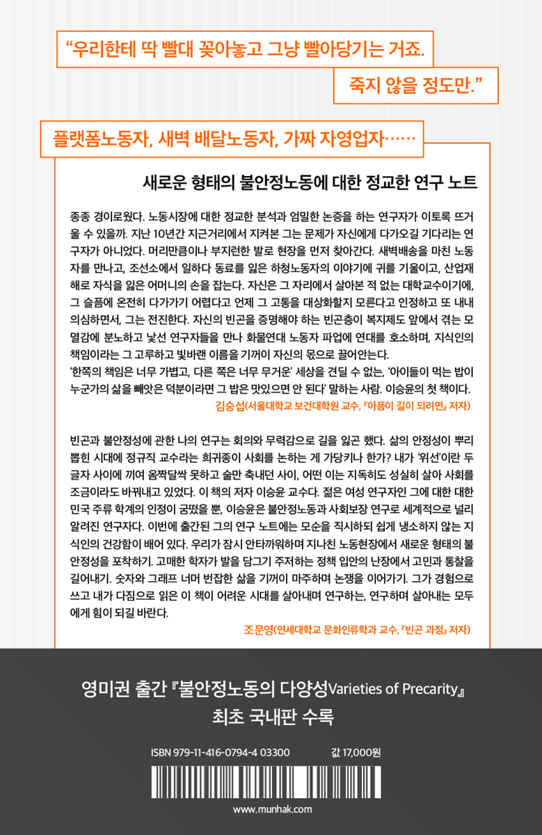 빈곤과 불안정성에 관한 나의 연구는 회의와 무력감으로 길을 잃곤 했다. 삶의 안정성이 뿌리 뽑힌 시대에 정규직 교수라는 희귀종이 사회를 논하는 게 가당키나 한가? 내가 ‘위선’이란 두 글자 사이에 끼여 옴짝달싹 못하고 술만 축내던 사이, 어떤 이는 지독히도 성실히 살아 사회를 조금이라도 바꿔내고 있었다. 이 책의 저자 이승윤 교수다. 젊은 여성 연구자인 그에 대한 대한민국 주류 학계의 인정이 굼떴을 뿐, 이승윤은 불안정노동과 사회보장 연구로 세계적으로 널리 알려진 연구자다. 이번에 출간된 그의 연구 노트에는 모순을 직시하되 쉽게 냉소하지 않는 지식인의 건강함이 배어 있다. 우리가 잠시 안타까워하며 지나친 노동현장에서 새로운 형태의 불안정성을 포착하기. 고매한 학자가 발을 담그기 주저하는 정책 입안의 난장에서 고민과 통찰을 길어내기. 숫자와 그래프 너머 번잡한 삶을 기꺼이 마주하며 논쟁을 이어가기. 그가 경험으로 쓰고 내가 다짐으로 읽은 이 책이 어려운 시대를 살아내며 연구하는, 연구하며 살아내는 모두에게 힘이 되길 바란다. - 조문영 (연세대학교?문화인류학과?교수,?『빈곤?과정』?저자)