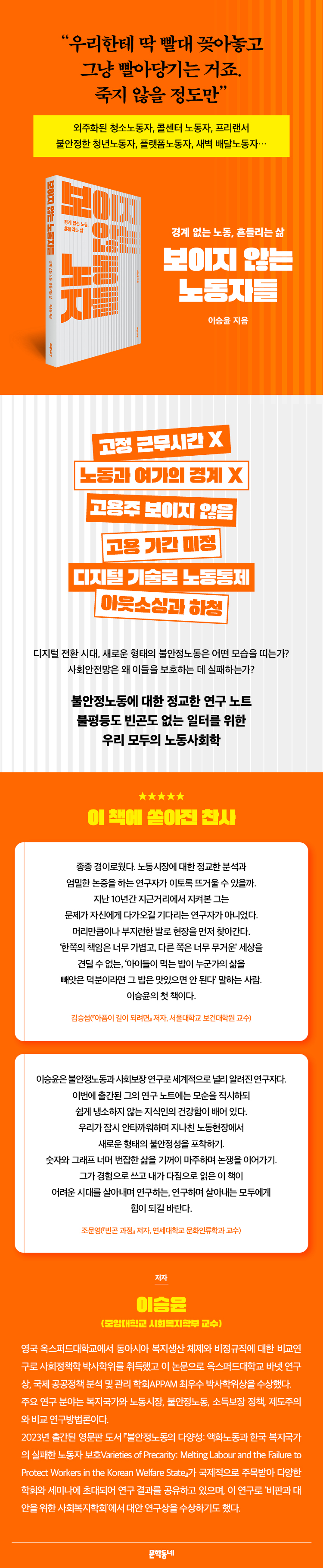 근로자 10만 명당 치명적 산업재해 수 3050 클럽 국가 1위 순수 자영업자 고용보험 가입 비율 0.5%에 불과 우리는 왜 일할수록 불안정해지는가? 플랫폼노동자, 콜센터 노동자, 새벽 배달노동자… 디지털 전환 시대, 새로운 형태의 불안정노동에 대한 정교한 연구 노트 지난 몇십 년간 노동의 형태가 변하면서 ‘노동자 계급’이나 ‘프롤레타리아트’와 같은 전통적인 범주로는 설명하기 어려운 새로운 형태의 일이 등장했다. 콜센터 노동자, 프리랜서, 새벽 배달노동자, 소규모 사업장 노동자와 가짜 자영업자(종속적 자영업자) 등이 그 예다. 불안정노동자는 비정규직, 일일 노동자, 단기계약자뿐 아니라 유튜버, 크리에이터, 플랫폼노동자 등 신종 직종으로 범위가 확장되고 있다. 표면적으로 이들은 독립적인 자영업자나 프리랜서로 보이며, 자유롭고 창의적인 방식으로 노동하는 듯하지만 실상 고용은 더 불안하고, 임금은 더 적게 받고, 일터는 더 위험한 경우가 많다. 기술 발전에 따른 플랫폼경제 확산이라는 변화에도 불구하고, 왜 노동자들의 권리는 발맞추어 신장되지 못하는가? 우리는 왜 일할수록 불안정해지는가? 『보이지 않는 노동자들』은 불안정노동자들의 삶에 밀착해 이들의 노동현장을 관통하는 이론은 무엇일지, 불안정노동의 확산은 어떤 메커니즘으로 설명될 수 있을지를 고찰한 연구노트다. 동시에 저자는 불안정노동자들의 삶을 보호하는 데 현재의 사회안전망이 얼마나 무력한지를 진단하고, 이를 넘어설 더 나은 사회보장제도를 제안하고자 한다. 국내외에서 노동 연구로 주목받아온 중앙대 사회복지학부 교수 이승윤의 첫 단독 저서로, 모순의 노동현장을 구체적으로 보여주는 풍부한 데이터, 해외의 사회보장제도 소개는 이 책의 큰 미덕이다. 무엇보다 노동 연구자로서 학문적 성실함과 윤리적 태도를 겸비한 그의 연구는 우리 사회 노동의 ‘실재’를 파악하는 데 좋은 도구가 될 것이다. 『보이지 않는 노동자들』의 궁극적 목적은 단순히 경제성장에도 불구하고 노동자들이 여전히 가난하고 불안정하다는 익숙한 서사를 반복하는 것이 아니다. 오히려 일의 형태가 변화하면서 새로운 불안정성이 어떻게 그 모습을 드러내는지, 그리고 불안정노동자를 둘러싼 제도적 노력이 어느 부분에서 실패하는지, 무엇보다 불안정노동과 사회정책을 내가 어떻게 연구하며, 무엇을 배웠는지를 공유하고자 한다. 동시에 많은 나를 포함한 연구자, 정책 입안자, 정치인, 그리고 행정가 들이 이러한 현실과 얼마나 괴리되어 있는지도 반성적으로 살피고자 했다. _「책머리에」에서, 15쪽 “우리한테 딱 빨대 꽂아놓고 그냥 빨아당기는 거죠. 죽지 않을 정도만.” 다양한 얼굴의 불안정노동을 관통하는 이론은 무엇인가? 사회안전망은 왜 노동자를 보호하는 데 이토록 무력한가? 노동자 10명 중 4명이 비정규직으로 일하는 시대, 불안정노동의 현실은 어떤가? 불안정노동자들을 가리키는 용어로 프레카리아트precariat가 쓰이기도 하는데, 이들은 언제든 쉽게 쓰다 버릴 수 있는 ‘일회용’ 노동력으로 취급받는다. 과거 노동자 계급을 대표하던 임금노동자들 역시 고용과 소득의 불안정성을 겪었지만 산업화 이후 정치적 노력, 사회안전망 구축, 법 제도 개선 등을 통해 어느 정도 인간다운 삶을 누릴 수 있었다. 하지만 ‘노동자 계급’이나 ‘프롤레타리아트’와 같은 전통적 범주에서 벗어난 비표준적 형태의 불안정노동자들은 노동시장에서 새로운 계층을 형성하면서도 취약한 노동 조건에 그대로 노출되어 있다. 고용 불안정, 소득 불규칙, 일터에서의 통제권 부재, 사회보장 접근성 제한 등이 그것이다. 이 책의 1부 「격랑의 노동현장, 준비되지 않은 사회」에서는 불안정노동자들이 마주한 다양한 현장 가운데에도 특히 몇 년 새 급증한 새벽 배달노동자, 산업재해 노동자, 가짜 자영업자들의 현실을 톺아보았다. 첫 장을 여는「시간과 돈, 모두 부족한 이중빈곤자」는 불안정노동자들이 겪는 공통의 문제로 ‘이중빈곤’ 개념을 제시한다. 모두에게 똑같이 24시간이 주어지는 것 같지만 베블런이 분석했듯 각자 누리는 시간의 양은 사회적 계급에 따라 다르며, 장시간 일하면서도 소득빈곤에 시달리는 이들은 ‘이중빈곤’의 늪에서 빠져나오기 힘들다. ‘누가 어떤 빈곤에 시달리는가’에 대한 연구 결과 저자는 ‘시간빈곤’은 정규직 노동자가 비정규직 노동자에 비해 경험할 확률이 높지만, ‘시간빈곤’과 ‘소득빈곤’을 모두 겪는 비율은 비정규직이 훨씬 높다고 지적한다. 이는 낮은 사회복지 지출로 대다수 필수재를 돈으로 구매해야 하고, 유급휴가 보장률이 낮은 한국사회의 민낯이다. 이제 불안정노동의 첫 번째 현장, 새벽 배달노동자들의 삶을 보자. ‘유통 혁신’이라 칭송받으며 파죽지세로 시장규모 11.9조를 기록(2023년)한 새벽노동 현장은 어떤가. 이 시장을 움직이는 빅데이터 기술은 노동자의 동선과 업무량을 통제하는 전자감시 시스템과도 짝을 이룬다. 또한 새벽노동(야간노동)은 세계보건기구 산하 국제암연구소IARC가 지정한 발암물질로 제한 권고사항이지만, 배달노동자들의 