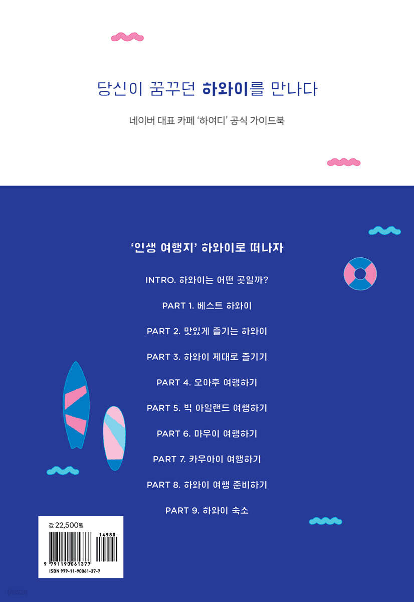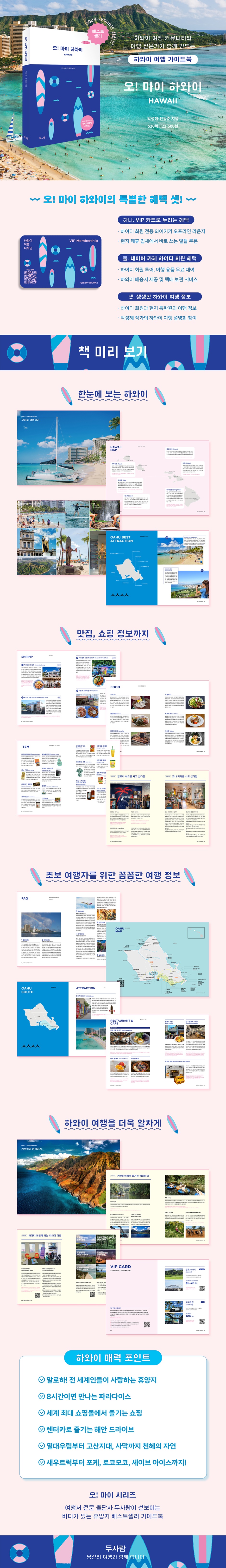 초보 여행자를 위한 친절한 하와이 안내서 많은 사람들이 ‘인생 여행지’로 꼽는 하와이. 하지만 막상 가려면 언제 가는 게 가장 좋을지, 어느 곳에 가야 할지, 무엇을 먹고 어디에서 쇼핑해야 할지 막막하기만 하다. 『오! 마이 하와이』에는 FAQ, 하와이 대표 키워드, 현지 문화까지 실려 있어 여행자들의 궁금증을 해결해준다. 하와이 지도와 일정별 추천 코스, 오아후ㆍ빅아일랜드ㆍ마우이ㆍ카우아이 섬별 여행 준비에서부터 호텔 체크인까지 필요한 모든 정보를 총망라했다. 또한 저자이자 현지 로컬이 추천하는 필수 여행지와 뷰 포인트, 액티비티 등을 소개해 여행자들의 고민을 덜어준다. 책을 읽다 보면 멀게만 느껴졌던 하와이가 어느새 성큼 다가와 있을 것이다. 오직 하와이에만 가능하다 가족 여행부터 커플 여행까지, 저마다에 딱 맞춘 하와이 수많은 할리우드 스타를 비롯해 버락 오마바 전 미국 대통령, 오프라 윈프리, 빌 게이츠 같은 세계적인 셀러브리티들이 하와이를 사랑하는 데는 그만한 이유가 있다. 바로 어디에서도 경험할 수 없고 누구나 좋아하는 여행지와 여행법이 가득하기 때문이다. 가족 여행자들이라면 하와이의 멋과 맛을 동시에 즐길 수 있는 전통 쇼 루아우, 돌고래를 직접 만날 수 있는 씨 라이프 파크, 태평양 전쟁의 역사를 간직한 진주만, 폴리네시안 문화센터 등을 방문해보기를 추천한다. 조금 더 짜릿하고, 특별한 하와이를 즐기고 싶다면 화산 분화구를 오르는 코코 크레이터 레일웨이 트레일, 할레아칼라의 장엄한 일몰, 푸른 바다 위에서 즐기는 세일링과 스노클링, 탁 트인 해안선 드라이브도 좋다. 먹고 마시고 쇼핑하는 즐거움 트럭에서 맛보는 새우 요리, 명품 쇼핑까지 튀기면 다 맛있다지만 하와이의 기막힌 풍광을 배경으로 트럭에서 오동통하게 튀겨낸, 그 오리지널 새우 요리 맛에는 절대 비할 수 없을 것이다. 현지의 신선한 식재료를 사용하는 하와이 리저널 퀴진, 알록달록 무지개빛 하와이를 꼭 닮은 셰이브 아이스, 비치 바에 앉아 석양을 바라보며 즐기는 블루 하와이안 칵테일, 세계 최고 커피로 꼽히는 코나 커피까지 더한다면 이미 여행의 반은 채워진 셈이다. 하와이의 수식어 중에 빠지지 않는 게 있다면 바로 ‘쇼핑의 파라다이스’다. 하와이에는 명품 매장부터 일반 백화점, 아웃렛까지 다양한 매장이 있어 평소 쇼핑에 관심이 없던 이들까지 쇼핑하는 재미에 푹 빠지게 된다. 이 책은 시즌별 쇼핑 노하우 외에도 살아 있는 하와이를 경험할 수 있는 파머스 마켓, 깨알 쇼핑의 즐거움을 선사하는 슈퍼마켓까지 소개하여 취향에 따라 쇼핑을 즐길 수 있다. 하와이 대표 섬 오아후부터 매력만점 빅아일랜드, 마우이, 카우아이까지 하와이를 처음 찾는 여행자라면 오아후만 둘러보기에도 시간이 짧다. 와이키키가 속한 남부, 서핑 성지 노스 쇼어가 있는 북부, 최고 일몰을 감상할 수 있는 코코 헤드가 있는 동부, 오아후 최대 루아우 쇼인 파라다이스 코브가 있는 서부, 진주만이 있는 중심부를 구분해 초보 여행자들이 오아후를 더욱 쉽고 꼼꼼하게 둘러볼 수 있도록 한다. 매력 만점 이웃섬 여행도 빼놓을 수 없다. 대자연을 느낄 수 있는 빅아일랜드 화산국립공원, 발 아래 구름 바다가 펼쳐지는 마우이 할레아칼라 국립공원, 가장 아름답고 장엄한 해안선을 만날 수 있는 카우아이의 나팔리 코스트 등. 오아후와는 또 다른 하와이의 매력을 경험할 수 있다. 하와이 여행의 든든한 동반자 현지 사용 가능한 VIP 카드 수록 『오! 마이 하와이』는 섬별 상세 지도와 해변 지도, 렌터카 이용하기, 백여 곳의 호텔 정보까지 자세하게 제공한다. 또 네이버 카페 ‘하여디(하와이 여행 디자인)’가 제공하는 라운지 이용과 무료 투어 혜택, 제휴업체에서 사용할 수 있는 VIP카드를 수록해 실속까지 알뜰히 챙길 수 있다. |