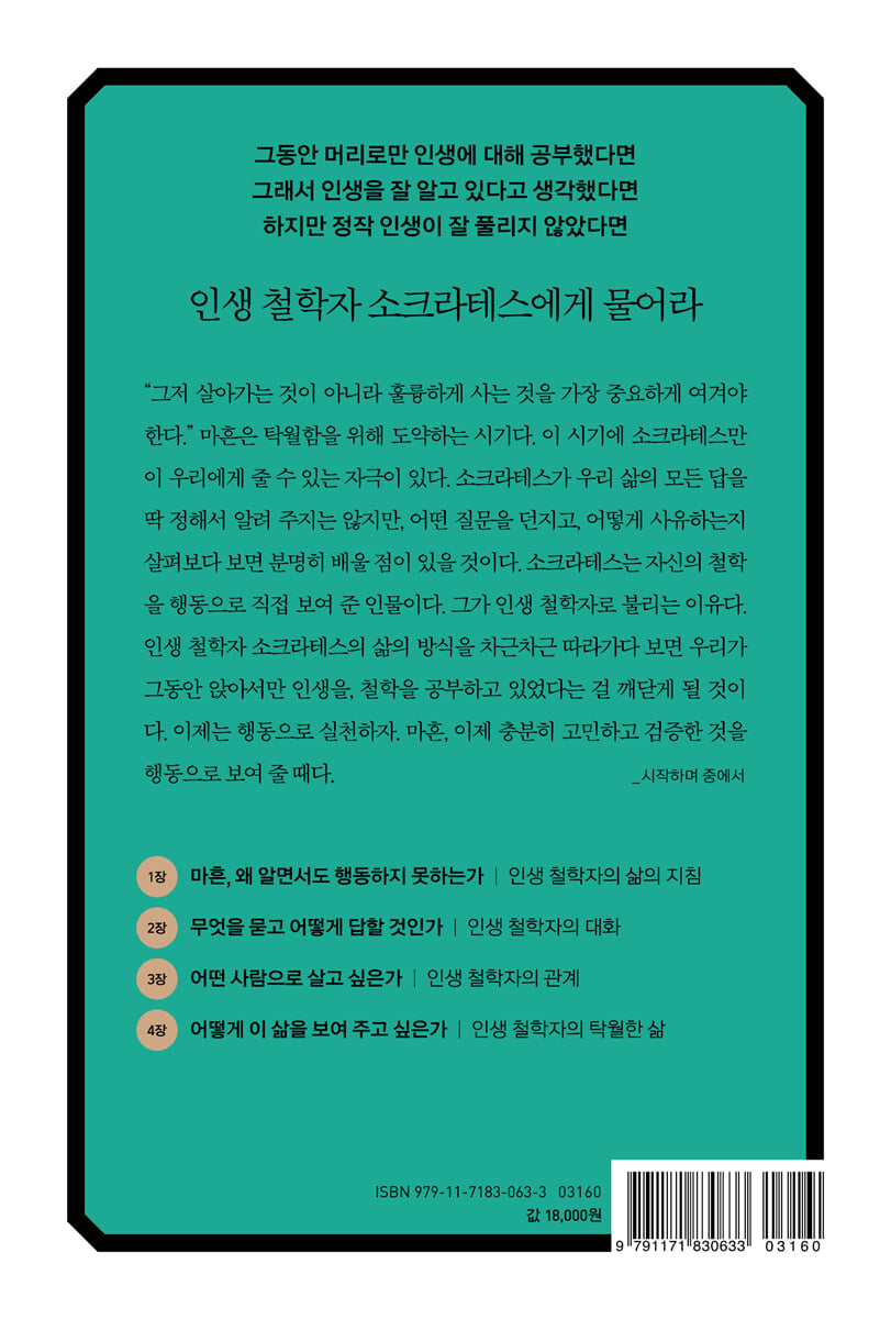 해제 인생으로 자신의 철학을 보여 준 소크라테스 1장 마흔, 왜 알면서도 행동하지 못하는가_인생 철학자의 삶의 지침 01 너 자신을 알라 |무지의 지| 02 나를 아는 것은 모든 지혜의 근본이다 |자신| 03 자신의 본성을 얼마나 알고 있는가 |내면| 04 무엇이 옳은지 아는 사람은 옳은 일을 한다 |판단력| 05 삶의 목적이 없다면 존재의 의미가 없다 |소명 의식| 06 삶은 자신의 선택대로 흐른다 |행복| 2장 무엇을 묻고 어떻게 답할 것인가_인생 철학자의 대화 07 지혜로운 사람은 질문하며 지혜를 얻는다 |검증| 08 자신이 옳다고 믿는 것을 증명할 수 있어야 한다 |권위| 09 모든 것을 의심하고 다시 생각하라 |궤변| 10 대화는 우리 내면의 생각을 그대로 보여 준다 |엘렝코스| 11 지식 없는 삶은 죽음에 가까운 삶이다 |배움| 12 죽음을 두려워 말라 |죽음| 3장 어떤 사람으로 살고 싶은가_인생 철학자의 관계 13 사랑은 눈이 아니라 마음으로 보는 것이다 |사랑| 14 천천히 시작하여 끝까지 유지되는 것이 우정이다 |우정| 15 당신의 결점을 말해 주는 사람과 가까이하라 |성장| 16 스스로에게는 엄격해도 타인에게는 관대하라 |포용| 17 눈과 귀는 두 개지만 혀는 한 개다 |겸손| 18 자기 가족을 섬기는 것이 인간됨의 첫걸음이다 |가족| 4장 이 삶을 어떻게 보여 주고 싶은가_인생 철학자의 탁월한 삶 19 위대한 삶을 위해 위대하게 꿈꿔라 |탁월함| 20 유일한 선은 앎이며 유일한 악은 무지다 |품격| 21 악행은 타인보다 자신에게 더 큰 상처를 입힌다 |정의| 22 인생에서 무엇을 해야 하는지 알아야 한다 |용기| 23 그저 살지 말고 바르게 살아라 |주인| 24 더 많이 얻고자 하기보다 더 적은 것에 만족하라 |절제| |