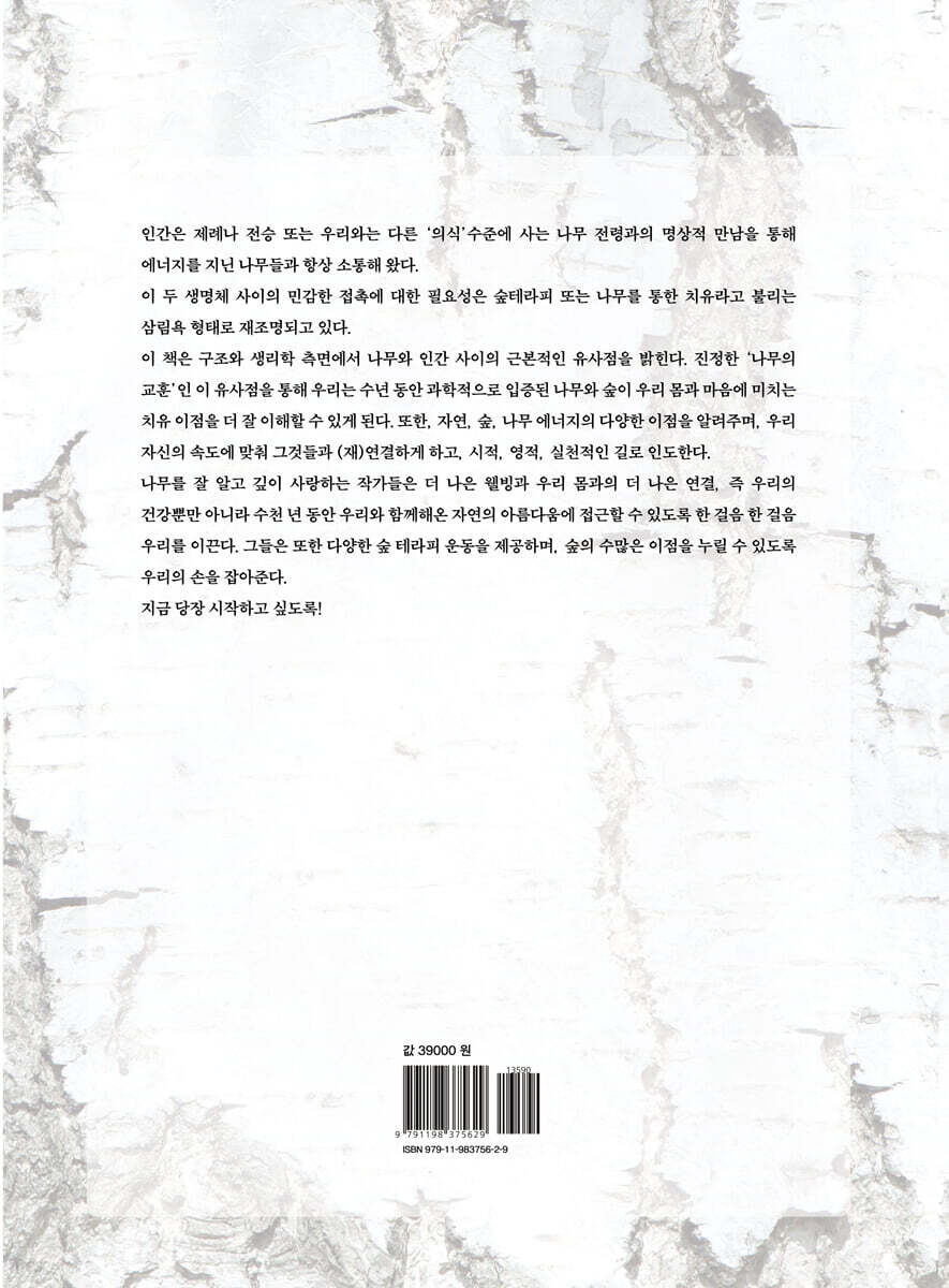 1부 - 숲테라피 개요 8 나무와 소통하다 11 나무와 인간의 유사성 15 숲테라피 장점 21 ㆍ 숲공기의 장점 21 ㆍ 숲공기의 살균작용 27 ㆍ 삼림욕의 역할과 효능 28 ㆍ 치유의 숲 31 ㆍ 나무의 치유적 터치 31 ㆍ 양극을 지닌 숲 32 ㆍ 숲을 호흡하다 33 ㆍ 나무를 이용한 아로마테라피와 후각테라피 33 ㆍ 나무의 향 34 ㆍ 숲을 보고, 듣고, 그리다 36 ㆍ 나무 에너지의 이점 39 ㆍ 나무 에너지를 시각화하다 41 2부 - 실용 숲테라피 48 삼림욕 50 ㆍ 삼림욕이란? 50 ㆍ 숲테라피 운동은 어디서 할 수 있나? 50 ㆍ 어떤 나무를 선택할 것인가? 51 ㆍ 운동은 언제 하나? 51 ㆍ 삼림욕은 얼마나 자주 해야 하나? 52 ㆍ 삼림욕은 누구를 위한 것인가? 52 ㆍ 홀로? 아니면 그룹? 52 ㆍ 가져갈 준비물은? 53 ㆍ 기타 주의사항 54 숲테라피 운동 57 ㆍ 호흡 리듬 ? 57 ㆍ 운동 설명 57 -운동 1 - 숲, 공원, 정원으로 들어간다. 58 -운동 2 - 숲속에서의 휴식 60 -운동 3 - 나무를 선택한다. 62 -운동 4 - 부정적 에너지 방출 64 -운동 5 - 나무를 끌어안는다. 66 -운동 6 - 나무의 긍정적인 에너지로 채운다. 68 -운동 7 - 나무의 수직성을 통합하다. 70 추가 운동 74 ㆍ 물속에 발 담그기 74 ㆍ 숲속에서 책 읽기 74 ㆍ 나무에 인사하기 75 ㆍ 맨발로 걷기 75 ㆍ 나무의 기공 77 ㆍ 산림 마사지 79 -대나무나 다른 나무들을 이용한 마사지 79 -바오딩Bao Ding 밤 마사지 80 -숲 매트리스 81 -나무봉 짚고 걷기 81 숲테라피 장소의 예 83 ㆍ 프랑스 83 ㆍ 스위스 86 ㆍ 벨기에 89 3부 - 가정에서 하는 숲테라피 96 가정요법 98 ㆍ 쟈뀌에 Jacquier 에어볼Bol d’air로 숲을 호흡해 보자 98 ㆍ 천연 에어로졸과 나무의 향기 100 ㆍ 나무의 싹눈부터 병까지, 싹눈테라피 101 ㆍ 나무 목욕 108 ㆍ 분재 109 ㆍ 숲속 오두막 110 ㆍ 숲속 해먹 111 ㆍ 의식적으로 장작 패기 112 ㆍ 생명나무 심기 112 ㆍ 살아있는 숲의 개념 113 부록 1: GDV 생체전기학 118 부록 2: 싹눈테라피Gemmotherapie의 역사 121 부록 3: 생명의 나무 재단 123 부록 4: 숲테라피 연수 124 참고문헌 125 목차 128 |