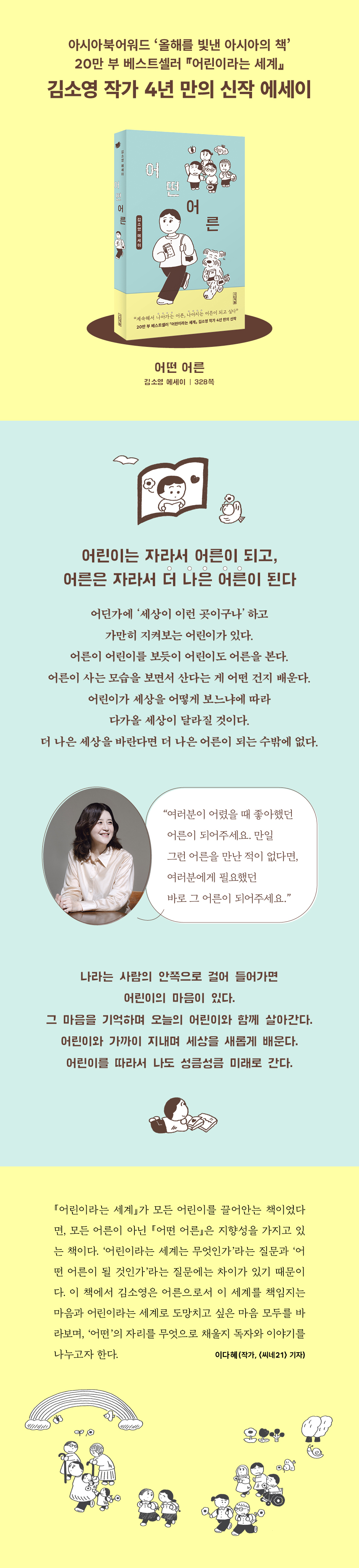 『어린이라는 세계』 김소영 신작. 이번엔 ‘어떤 어른이 되어야 할까?’라는 물음에 답한다. 어린이와 어른이 닿아있는 일상의 순간을 전하며, 어린이에게 다양한 어른의 모습이 필요함을 말한다. 어른을 통해 미래를 체험하는 아이들. 우리는 각자의 방향에서 나아가고 나아지는 어른이 되어야 할 것이다.