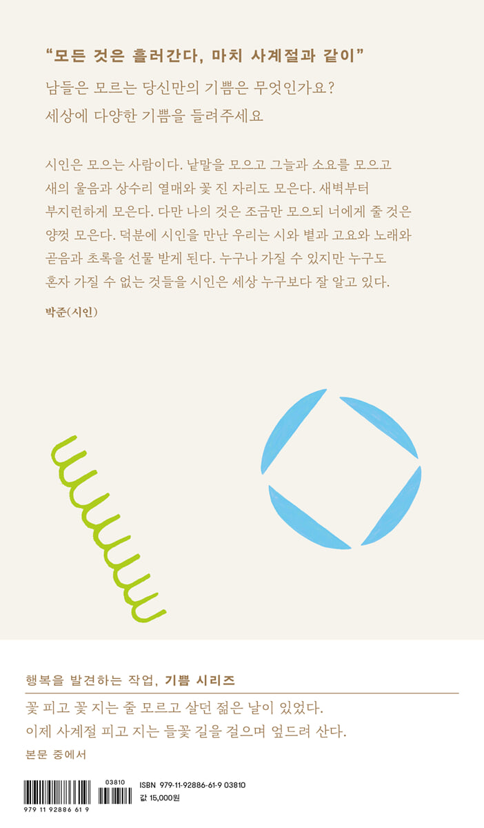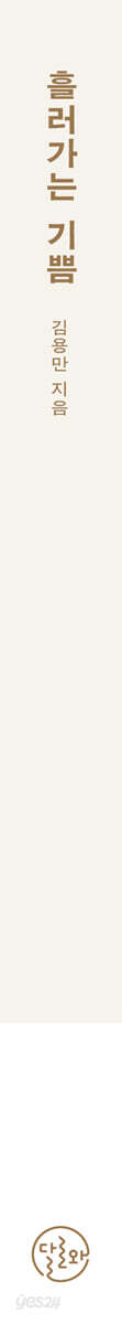 세상에 다양한 기쁨을 들려주세요 달로와의 ‘기쁨 시리즈’ “누구에게나 기쁨의 순간은 똑같을까?” 마인드빌딩의 문학 브랜드, 달로와에서 선보이는 ‘기쁨 시리즈’는 이 질문으로 시작되었다. 왜 나에겐 끔찍한 일이 저 사람에겐 기쁨이 되고, 나에겐 기쁨이 되는 일이 누군가에겐 끔찍한 순간인 걸까? 기쁨 시리즈는 행복을 발견하는 작업이다. 우리 모두의 행복이 아니라 당신의 행복을 찾아가는 여정이다. 누구도 행복으로 여기지 않았던 순간에 관한, 누구도 행복이라고 인정하지 않았던 나만의 행복에 관한 이야기이다. 그리하여 행복이 바로 지금, 이곳에, 누구에게나 있음을 전한다. 각자의 기쁨이 모여 우리의 다양성이 되기를 바란다. ‘기쁨 시리즈’의 첫번째, 〈흘러가는 기쁨〉 수면 아래서 끌어올릴 첫번째 기쁨은 ‘흘러간다’이다. 우리는 흘러가는 것을 그대로 두지 못한다. 흘러가는 시간은 붙잡고 싶어 하고, 흘러가는 세월은 곁에 두고 싶어 한다. 흘러가지 못하도록 관계를 억지로 끌고 가기도 하고, 흘러가는 대로 살아가기를 두려워한다. 그러나 흘러가는 것이 곧 삶이다. 흘러가는 그 흐름에 몸을 맡기지 않으면 인생이 더욱 고통스러워질 뿐이다. 시간의 흐름에 따라 변화하는 사계절을 바라보며, 시간이 멈추기를 바라는 것이 아니라, 변화하는 계절을 때마다 즐겨야만 한다. 어차피 모든 것은 흘러가기 때문이다. 〈흘러가는 기쁨〉의 저자 김용만 시인은 30여 년 동안 작은 공장의 용접공으로 일하다 퇴직했다. 이후로는 흘러가는 것들을 붙잡지 않고, 그저 바라보며 살고자 전북 완주 산골에 터를 잡았다. 그곳에서 봄이 되면 사람들에게 채송화 씨앗을 나눠주고, 여름이 되면, 가을이 되면 감을 말리고, 겨울이 되면 봄을 기다린다. 그렇게 때가 되면 변하는 계절과 거짓말처럼 모습을 달리하는 자연 속에서, 계절같이 흘러가는 삶 앞에 겸손한 마음을 가지게 된다. 그 겸손하고 소박한 마음은 곧 시인만의 기쁨이 된다. “봄은 언제나 거기에 있었어” 계절이 곧 인생과 같은 것처럼, 우리의 인생에도 사계절이 있다. 언젠가는 아무런 수확도 얻어내지 못하고 혹한을 견뎌야만 하는 야속한 겨울을, 언젠가는 지구가 깨어나는 것처럼 모든 것이 되살아나는 봄을 모두 겪을 것이다. 흘러가는 시간과 세월을 붙잡아두려고 한다면 겨울에서 벗어나 봄을 맞이할 수 없다. 흘러가야만 겨울을 보내고 봄을 맞이할 수 있는 것이다. 그러니 언젠가 어디에선가 혹독한 겨울을 보내게 될 당신에게, 저자는 얘기한다. “봄은 오는 게 아니라 거기에 있었다”라고. 겨울을 보내느라 곁에 있는 봄을 보지 못하는 당신에게 〈흘러가는 기쁨〉은 봄은 언제나 당신의 곁에 있다는 것을 잊지 말라는 마음을 전한다. 이 책이 당신의 겨울날에 봄과 같은 믿음이 되기를 바란다. 디자이너의 말 〈흘러가는 기쁨〉의 디자인은 자연이 지닌 고유한 아름다움과 섬세한 흐름을 담아내고자 했다. 물감의 질감이 살아 있는 조형적 요소들은 자연의 리듬을 닮았다. 자유롭게 흩어져 있는 형태들은 꽃이거나 이파리처럼 보이기도 하고, 한 가지 색처럼 보이지만 여러 색이 섞여 있는 듯한 느낌을 준다. 보는 이의 시선과 감정에 따라 다르게 보이는 이 모양들은 자연의 다양성과 일치한다. 이 책을 읽으며 자연 속에서 흘러가는 기쁨을 느끼길 바란다. |