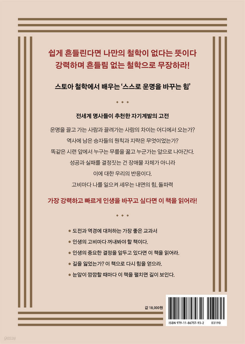 우리는 대부분 시련을 피하느라 인생을 허비한다. 저자는 이런 접근 방법이 비극적일 만큼 심각한 오류임을 지적하며, 공포와 난관, 승리에 대한 집착으로부터 해방시켜주는 스토아 철학의 지혜를 소개한다. - 샤론 레벨 (『삶의 기술』 저자)
