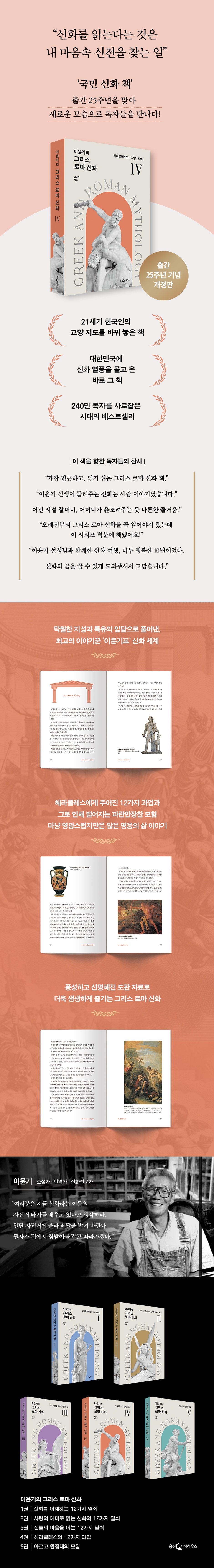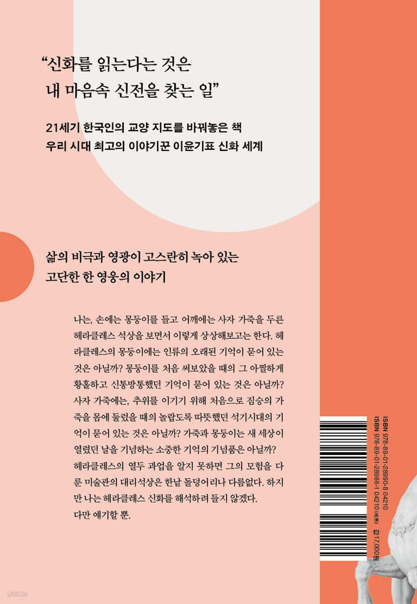 240만 독자들의 선택, 이 시대 최고의 베스트셀러 『이윤기의 그리스 로마 신화』 출간 25주년 기념 개정판 최고신 제우스의 아들로 태어났지만 영광스럽지만은 않았던, 영웅 헤라클레스의 고단하고 험난한 모험과 인생 우리에게도 널리 알려진 그리스 로마 신화의 영웅, 헤라클레스. 그를 다룬 예술 작품은 셀 수 없이 많은데, 그중 가장 유명한 조각상은 이탈리아의 나폴리 국립 고고학 박물관에 있는 〈지친 헤라클레스〉다. 이 헤라클레스는 사자 가죽을 걸친 올리브나무 몽둥이에 기대어 쉬고 있다. 자신의 영광과 용맹을 상징하는 그 ‘사자 가죽’과 ‘올리브나무 몽둥이’다. 하지만 온몸이 축 늘어진 채 고개를 떨군 영웅의 모습은 작품의 이름처럼 지치고 고단해 보인다. 12년 동안이라 이어진 열두 과업을 치르는 일이 아무리 최고신 제우스의 아들이라 해도 쉽지만은 않았기 때문이 아닐까. 이처럼 헤라클레스의 삶은 영광되지만 험난했다. 대한민국에 그리스 로마 신화 열풍을 불러일으킨 주역이자 240만 명이 넘는 독자들에게 사랑받아온 ‘국민 신화 책’, 『이윤기의 그리스 로마 신화』. 그 4권은 영웅 헤라클레스의 이야기를 다룬다. 제우스의 아들로 태어나 ‘헤라의 영광’이란 뜻의 이름이 붙여진 사연부터 인간 세상에서의 죽음 이후 마침내 신들의 세계에 이르기까지, 그야말로 영웅의 일대기를 담았다. 네메아의 사자와 물뱀 휘드라, 크레타의 황소, 아마존 여왕의 허리띠 등 열두 과업을 완수해가는 과정은 파란만장하고 흥미진진하다. 대적할 자 없는 강인한 영웅의 이면에 존재하는 인간적 면모를 함께 만나보자. 독득한 해석과 재기발랄한 상상력! 최고의 이야기꾼 ‘이윤기표’ 신화 세계 2000년, 『이윤기의 그리스 로마 신화』의 첫 권이 출간되고 대한민국에 그야말로 그리스 로마 신화 열풍이 불었다. 서구 문명의 토대인 그리스 신화를 우리 정서와 현대 감각에 맞추어 소개한 이 책을 통해 수많은 독자가 매력적인 신화의 세계에 빠져들었고, ‘21세기 한국인의 교양 지도를 바꿔놓은 책’이라는 찬사를 받으며 지난 25년간 240만 부 이상 판매고를 올렸다. 먼 나라의 옛이야기에 지나지 않던 그리스 로마 신화가 국민 필수 교양으로 자리 잡고, 만화와 공연, 전시로 확장되기까지 신화 열풍의 중심에 이 책이 있었다. 그리스 로마 신화는 그 자체로 문학, 역사학, 인류학, 심리학 등 인문학 전반을 포괄하는 인류 문화의 원형으로, 시간과 공간을 넘어 현대인의 삶과 세계를 고스란히 반영하는 대표적인 고전이다. 이러한 신화의 매력과 가치를 독자의 눈높이에 맞춰 전해주는 데 탁월한 재능을 지녔던 ‘최고의 이야기꾼’ 이윤기의 지성과 입담은 그야말로 명불허전이다. 그는 첫 책을 쓰며, 다음과 같이 부드럽게 채근했고, 수많은 독자가 그의 입담과 독려에 빠져 신나게 신화의 넓고 깊은 세계로 페달을 굴렸다. “여러분은 지금 신화라는 이름의 자전거 타기를 배우고 있다고 생각하라. 일단 자전거에 올라 페달을 밟기 바란다. 필자가 뒤에서 짐받이를 잡고 따라가겠다.” _1권 들어가는 말에서 ‘국민 신화 책’, 첫 출간 25주년을 맞아 새로운 옷으로 갈아입다 다가오는 2025년은 『이윤기의 그리스 로마 신화』가 처음 출간된 지 25년이 되는 해다. 이를 기념해 새롭게 선보이는 개정판은 독자로 하여금 더욱 쉽고 즐겁게 ‘이윤기표’ 신화 세계를 여행하도록 돕는 데 주력했다. 디자인을 정돈하여 가독성을 높였고, 이 책의 매력 중 하나인 다채로운 도판 자료들을 더 생생하게 감상할 수 있도록 화질을 대폭 개선하고 최신 자료를 추가했다. 이제 막 자전거 타기에 나선 독자부터 이미 자전거 타기의 고수가 된 독자까지, 모두가 신화의 자전거 페달을 거침없이 밟으며 앞으로 달려 나갈 수 있길 기대한다. 이 책을 읽은 독자들의 찬사 “가장 친근하고, 읽기 쉬운 그리스 로마 신화 책.” “이윤기 선생이 들려주는 신화는 사람 이야기였습니다. 어린 시절 할머니, 어머니가 읊조려주는 듯 나른한 즐거움.” “서양 문화를 한층 깊이 이해하는 데 도움이 된 책. 진작 읽어야 했다는 아쉬움이 든다.” “오래전부터 그리스 로마 신화를 꼭 읽어야지 했는데 이 시리즈 덕분에 해냈어요!” “이 책은 나의 편협하고 엉성한 지식들을 부드럽고 짜임새 있는 모양으로 잡아주었다.” “그리스 로마 신화에 관련된 책들이 너무나 다양해서 어떤 것부터 읽어야 될지 고민할 때, 이 책이 정답이 될 것입니다.” “『이윤기의 그리스 로마 신화 1』을 처음 읽었을 때의 충격을 지금도 잊을 수 없다. ‘신화를 이렇게 해석할 수도 있구나’, 색다른 관점을 배웠다.” “간직하고 두고두고 보고 싶은 책! 언젠가 다시 읽어봐야지 생각했어요.” “저자의 독특한 그리스 로마 신화 해석이 돋보입니다.” “이윤기 선생님과 함께한 신화 여행, 너무 행복한 10년이었다. 신화의 꿈을 꿀 수 있게 도와주셔서 고맙습니다.” |