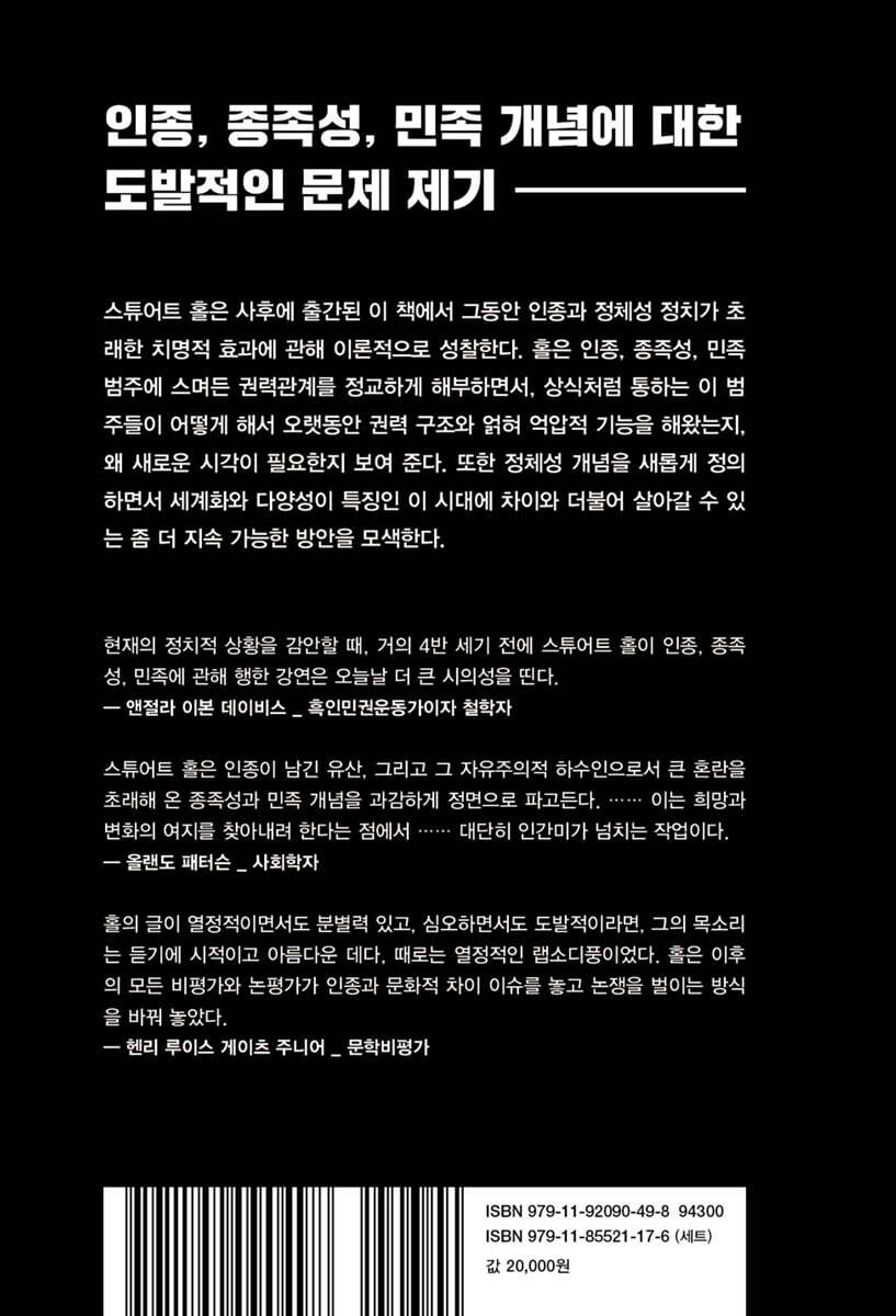 스튜어트 홀은 인종이 남긴 유산, 그리고 그 자유주의적 하수인으로서 큰 혼란을 초래해 온 종족성과 민족 개념을 과감하게 정면으로 파고든다. …… 이는 희망과 변화의 여지를 찾아내려 한다는 점에서 …… 대단히 인간미가 넘치는 작업이다. - 올랜도 패터슨 (사회학자)