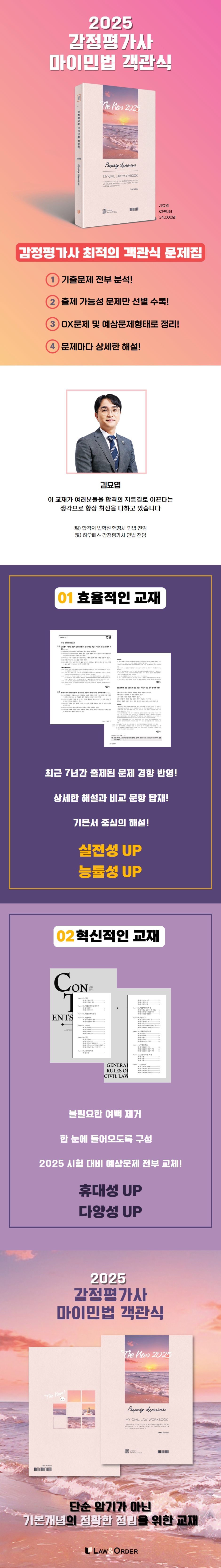 안녕하세요. 김묘엽입니다.감정평가사 학원 하우패스에서 민법을 강의하고 있는 김묘엽입니다. 여러분들의 필기를 줄이기 위해 판서노트로 수업을 진행하고 있고, 집중력을 높이는 방법으로 전자칠판을 활용하고 있습니다. 또한 교재를 휴대하지 않아도 될 수 있게 모든 책을 전자책으로 출간했습니다. 전자책 사용설명서를 뒤에 기재했으니 이를 참조하시면 더 쉽게 전자책 활용이 가능하시리라 생각됩니다.2024년 감정평가사 문제부터 교수님들의 출제방향성이 완전히 확립되었다는 느낌을 받았습니다. 기출문제의 단순한 반복출제보다 법학의 기본개념을 여러 표현으로 응용하는 문제들이 출제되었습니다. 법대교수님들이 이러한 출제경향을 고수하시는 이유는 법적 마인드 확립을 위해서는 기본개념의 정립이 필수적이고, 이에 대한 변별력을 판단하는 가장 좋은 수단이 응용문제라고 생각하시기 때문입니다. 2024년 감정평가사 시험문제는 이러한 교수님들의 견해가 가장 많이 반영된 문제였습니다.기출문제에 대한 단순한 암기만으로 벼락치기 공부를 했던 지금까지의 공부방식은 이제 통하기 어려운 상황이 되었습니다. 따라서 기본개념의 정확한 정립과 이를 바탕으로 한 충실한 이해, 그리고 다양한 관점의 접근과 생각이 필요합니다. 수업의 특징입니다.1.판서노트를 활용해서 기본이론을 정리한 후에 요약서를 보면서 중요한 부분에 밑줄을 그어서 확인합니다. 올해 출제가 유력한 부분은 요약서에 별도로 표시를 해가면서 요약서를 나만의 비법서로 만드는 시간을 가지게 됩니다.2.먼저 문제집에 있는 문제 중에서 다시 출제되기 어려운 문제는 삭제합니다. 출제가능한 문제 중 필수 문구와 문장에 밑줄을 그어 드립니다.3.밑줄을 그은 필수 문장을 반복해서 읽다 보면 문제에 대한 읽기 능력과 접근능력이 높아집니다. 문제의 모든 지문을 읽지 않아도 바로 정답을 찾을 수 있게 되고, 응용되거나 변형된 문제가 나와도 문제를 읽고 출제의도를 파악하는 데 어려움이 없게 됩니다.4.기본적인 개념의 다양한 관점의 접근과 생각이 가능하도록 여러 사례로 설명을 드리겠습니다.이번 교재의 특징입니다.1.지금까지 출제된 감정평가사 기출문제를 전부 분석했습니다. 2015년 기출문제부터는 한 문제도 빠짐없이 문제집에 실었고, 2014년부터 그전에 출제된 문제들은 출제가능성이 있는 것들만을 선별해서 OX문제 및 예상문제형태로 정리해 두었습니다.2.최근 7년간 출제된 타 시험 기출문제도 완전히 분석했습니다. 문제 중에서 최근의 출제 경향에 맞는 시험문제를 엄선해서 예상문제형태로 정리해 두었습니다.3.각 문제마다 빠짐없이 상세한 해설을 달았습니다. 어느 문제라도 의문이 생기면 바로 해설을 읽고 해결하실 수 있도록 했습니다.4.각 해설은 기본서에 있는 내용으로 기술했습니다. 해설을 읽는 것만으로도 기본서의 내용을 여러 번 정독하시는 효과가 생기게 하기 위한 목적입니다. 해설에 대한 강사의 각색은 최대한 자제했습니다. 5.작년 문제집의 예상문제 중에서 2024년 시험에서 출제되었던 부분은 삭제하고 새롭게 출제될 수 있는 예상문제로 전부 교체했습니다.6.비교해서 봐야 하는 문제는 OX형태로 5지 선다형 문제 밑에 비교 문항까지 표시해서 추가해 두었습니다.해마다 여러분들의 애정 어린 관심과 아낌없는 조언에 깊이 감사드립니다. 오탈자와 잘못된 해설을 찾아서 지적해 주신 여러분들에게 정말로 미안하고 감사한 마음입니다. 저의 교재를 믿고 공부해 주시는 모든 분들을 생각하며 정성을 다해서 수정과 보안을 했습니다. 다들 너무 감사드립니다.제 강의와 교재로 여러분들의 합격의 지름길을 만든다는 생각으로 항상 최선을 다하고 있습니다. 여러분 모두의 건승을 기원합니다.2024. 10. 8. 김묘엽