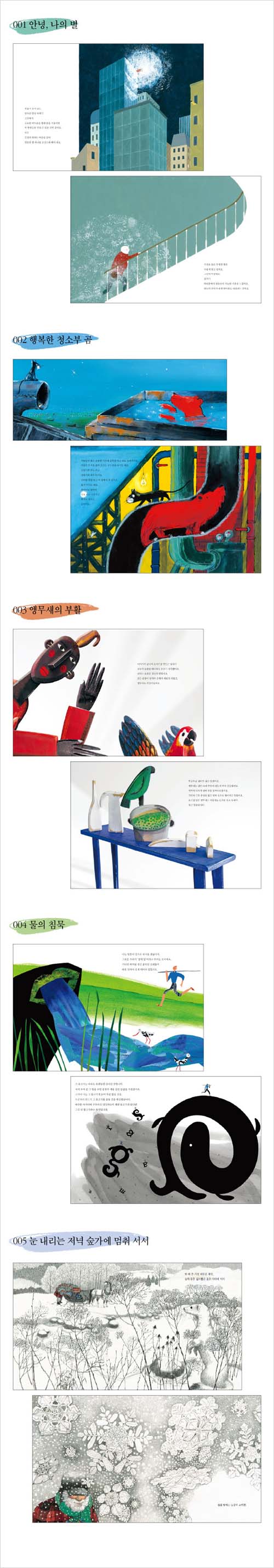 002 행복한 청소부 곰 003 앵무새의 부활 004 물의 침묵 005 눈 내리는 저녁 숲가에 멈춰 서서 |