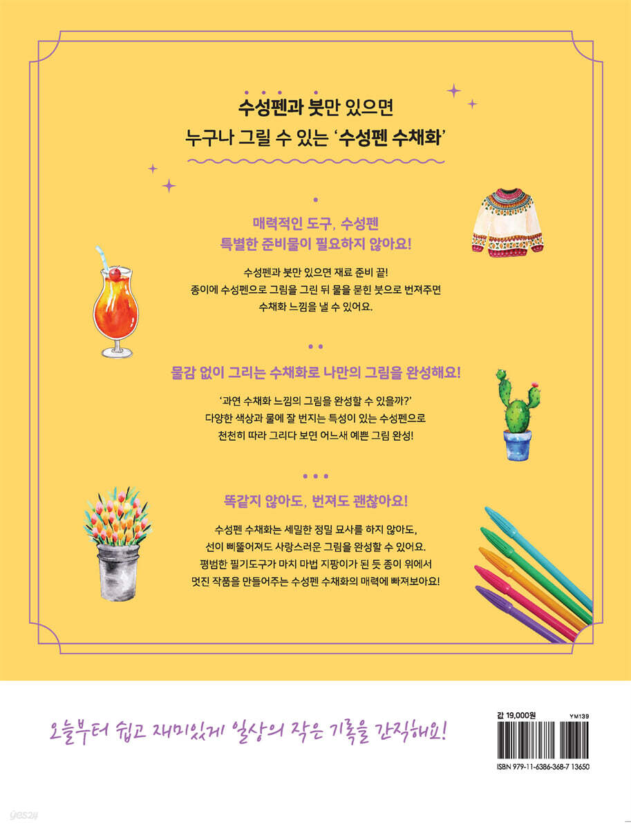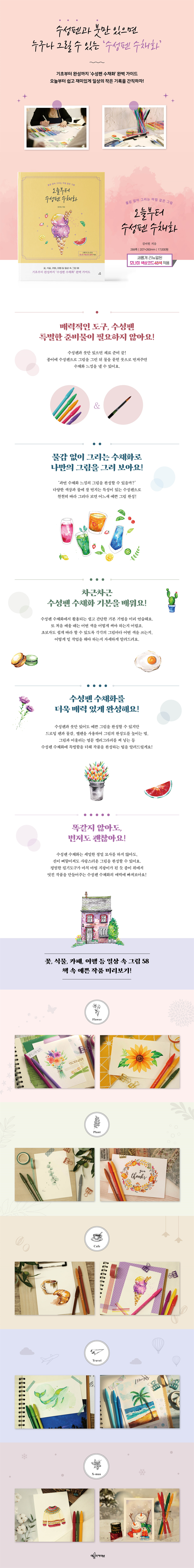 프롤로그 Chapter 1. 수성펜 수채화 준비하기 수성펜 수채화 필수 재료 이런 것도 있으면 편해요 수성펜 기본 기법 수성펜 48색 컬러 팔레트 사계절 컬러칩 Chapter 2. 햇살 담아 그리는 수채화 파란 하늘 그라데이션 카드 무지개 선물상자 담쟁이 넝쿨 아래에서 빛 쏟아지는 발코니 Chapter 3. 사랑스러운 꽃 그림 수채화 세상 쉬운 꽃 그리기 5가지 방법 향기 가득 반리스 Bonus 아이와 함께 그리는 들꽃 엽서 레터링 플라워 Bonus 블랙 수성펜의 매력 탐구 러블리 꽃다발 그레이 튤립 화분 햇살 담은 해바라기 카네이션 감사카드 Bonus 수성펜 수채화 다지기 깃털 그리기 1 장미 그리기 장미 축하카드 테이블 위 라벤더 도도한 양귀비 Chapter 4. 싱그러운 식물 그림 수채화 세상 쉬운 잎사귀 그리기 싱그러운 그린테라피 몬스테라 양팔 선인장 빨간 꽃 선인장 유칼립투스 야자수 나무 가을 담은 단풍잎 달력 호박 가을 리스 Bonus 수성펜 수채화 다지기 보석 자작나무 Chapter 5. 분위기 좋은 카페에서 시원한 수박 상큼한 오렌지 Bonus 수성펜 수채화 다지기 깃털 그리기 2 새콤달콤 주스 Bonus 수성펜 수채화 다지기 달걀프라이 Bonus 수성펜 수채화 다지기 풍선 민트모히토, 자몽에이드, 블루에이드 아이스 아메리카노 카페모카와 크루와상 블루베리아이스크림 초코 가득 아이스크림 Bonus 수성펜 수채화 다지기 파랑새 달달한 마카롱 Chapter 6. 수채화 속 여행 이야기 어린왕자의 소행성 고래의 꿈 Bonus 수성펜 수채화 다지기 깃털 그리기 3 바닷가에서 1 바닷가에서 2 썸머 타임 엽서 가을나무가 있는 풍경 여행스케치 여행가방 Chapter 7. 크리스마스에 눈이 올까요? 크리스마스트리 1 크리스마스트리 2 호랑가시 잎사귀 크리스마스 장식 볼 눈사람 포근한 스웨터 눈 내리는 겨울밤 선물상자 크리스마스의 선물 |