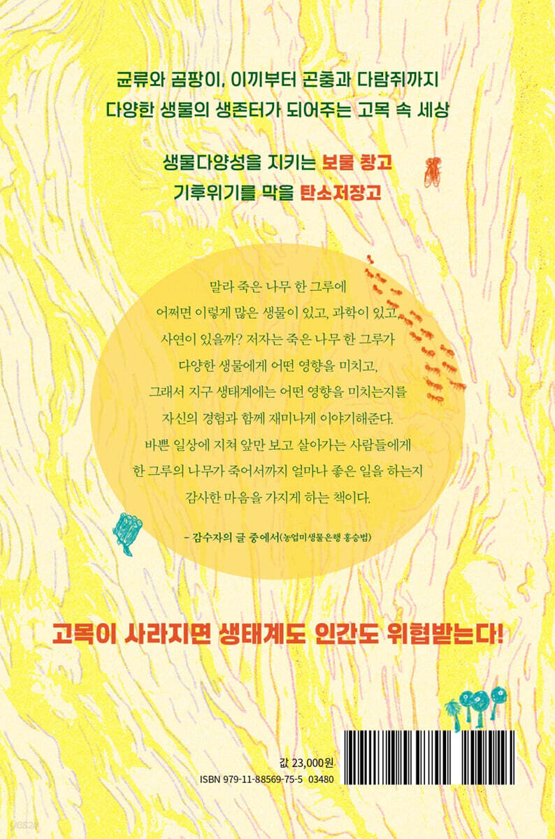 “말라 죽은 나무 한 그루에 어쩌면 이렇게 많은 생물이 있고, 과학이 있고, 사연이 있을까? 저자는 죽은 나무 한 그루가 다양한 생물에게 어떤 영향을 미치고, 그래서 지구 생태계에는 어떤 영향을 미치는지를 자신의 경험과 함께 재미있게 이야기해준다. 바쁜 일상에 지쳐 앞만 보고 살아가는 사람들에게 한 그루의 나무가 죽어서까지 얼마나 좋은 일을 하는지 감사한 마음을 가지게 하는 책이다.”