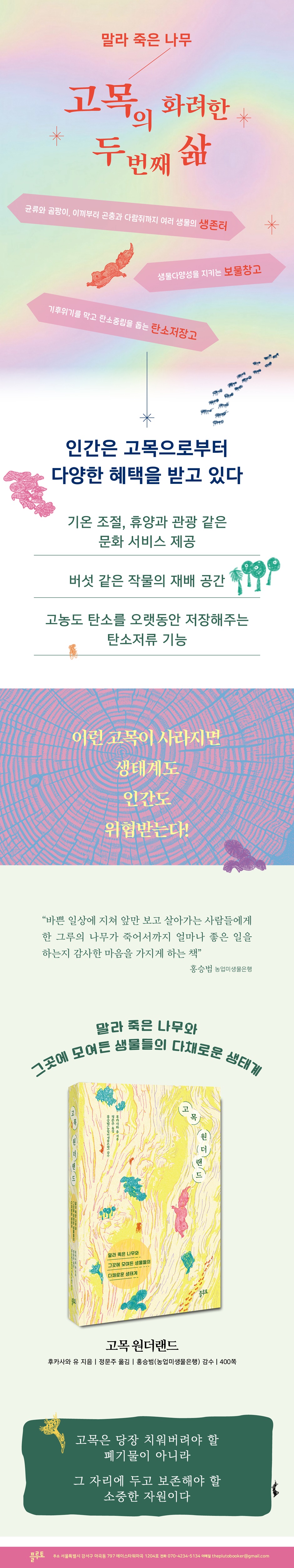 - 홍승범(농업미생물은행) 말라 죽은 나무 고목의 화려한 두 번째 삶 『고목 원더랜드』에서 소개하는 고목(枯木)은 말라 죽은 나무를 가리킨다. 죽어서 썩은 것처럼 보이는 고목에서 어떤 일이 벌어지는지 아는 사람은 드물 것이다. 우리가 버섯이라고 부르는 곰팡이인 목재부후균이 나무를 분해하기 시작하면, 다양한 생물이 찾아온다. 나무에 자란 곰팡이를 먹기 위해 곤충들이 오고, 다람쥐와 뱀도 온다. 동물뿐 아니라 많은 식물이 곰팡이와 특별한 관계를 가지고 있다. 특히 난초는 뿌리에 사는 균근곰팡이가 없으면 생존 자체가 어렵다. 한 그루의 고목에 이처럼 많은 생물이 생태계를 이루며 살아간다. 분해가 진행되면서 나무 위에 다음 대를 이을 나무가 자란다. 고목은 생태계의 순환을 보여주는 축소판이자 다양한 생물이 생존을 다투는 각축장이다. 저자는 자신의 집 마당에서 말라 죽은 졸참나무로 이야기를 시작한다. 고목에서 재미있는 현상들이 나타날 것임을 알고 있던 저자는 고목을 그대로 둔다. 나무가 죽은 해 가을, 졸참나무에서 야광 독버섯인 화경솔밭버섯이라 자란 데 이어 참부채버섯, 팽나무버섯이 자랐다. 그리고 일본에서는 좀처럼 보기 힘든, 다람쥐가 버섯을 먹는 광경까지 보게 된다. 『고목 원더랜드』는 저자의 체험과 연구 과정에서 생긴 에피소드를 바탕으로 썼기에, 학술적인 내용임에도 재미와 즐거움을 느낄 수 있다. 각 장 뒤에는 저자가 직접 그린 동식물 스케치와 함께 ‘현장 관찰 기록’이 실려 있다. 자신이 연구하는 대상에 대한 애정과 연구자로서의 성실함을 느낄 수 있다. 또한 본문의 사진들은 글만 읽어서는 떠올리기 어려운 균류와 곰팡이, 곤충들을 보여준다. 덕분에 고목에 관한 연구와 실험도 쉽게 이해할 수 있다. 균류와 곰팡이, 이끼부터 곤충과 다람쥐까지 고목 호텔에 머무르는 손님들 고목은 천천히 분해되는 동안 다양한 숲속 생물의 보금자리가 된다. 저자는 이 모습을 수많은 객실을 갖춘 호텔에 비유한다. 『고목 원더랜드』 1부에서는 저자가 고목 호텔에서 만난 생물들을 소개한다. 1장에서는 초등학교 때 자유 연구 숙제를 하면서 시작된 이끼와의 인연에 관해, 2장에서는 박물관 여름방학 강좌 때 경험한 점균(변형균)과의 충격적인 만남에 관해, 3장에서는 대학 시절부터 현재로 이어지는 버섯과의 운명적인 만남에 관해, 4장에서는 공동연구자와 함께 갔던 부생란 연구 여행에 관해, 5장에서는 집 마당에 놓아둔 통나무를 찾아온 곤충과 동물에 관해 소개한다. 고목에는 눈에 보이는 생물만 사는 것이 아니다. 6장에서는 맨눈으로 볼 수 없는 세균과 바이러스의 이야기도 정리했다. 눈에 보이는 생물이라도 영양분을 교환하는 과정 등을 직접 관찰하기는 어렵다. 이 책에서는 우리 눈에 보이지 않는 부분을 보여주기 위해 생태학에서 사용하는 환경 DNA 분석이나 안정동위원소 분석 등에 관해서도 친절하게 설명한다. 첨단 분석법이 보여주는, 고목을 둘러싼 생태계는 놀라울 정도로 정교하고 체계적이다. 고목이 세상을 구한다! - 기후위기와 탄소저류, 탄소중립 고목은 수많은 자연현상과 연결되어 있다. 그 대표적인 예가 지구 환경이 변화하면서 점점 중요해지고 있는 탄소저류(貯留)다. 고목은 그 무게의 절반가량이 탄소로 이루어져 있어 분해되는 과정에서 이산화탄소가 방출되지만, 모두 분해되어 대기 중으로 방출되는 것은 아니다. 분해되기 어려운 일부 성분은 남아서 토양유기물로 탄소저류에 기여한다. 탄소저류는 기후위기를 막고, 탄소중립에 큰 보탬이 될 중요한 기능이다. 『고목 원더랜드』 2부에서는 전 지구적으로 일어나는 일들이 고목과 어떤 관련이 있는지 정리했다. 7장에서는 균류가 고목을 어떻게 분해하는지를 소개하고, 8장에서는 전 세계에서 빈번히 발생하는 수목의 대규모 고사와 그로 인해 엄청나게 발생한 고목이 생태계에 미치는 영향에 관해, 9장에서는 숲에서 고목이 사라지면 어떤 일이 일어나는지, 10장에서는 인간은 고목에게서 어떤 혜택을 받고 있는지 설명한다. 마지막으로 11장에서는 도목갱신 현상을 소개한다. 도목갱신이란 나무가 죽어 쓰러지면 그 위에 새로운 나무가 자라는 것이다. 다음 세대의 수목으로 성장해가는 매우 중요한 현상이다. 고목이 사라지면 생태계도 인간도 위협받는다 - 고목을 대하는 슬기로운 태도 고목이 사라지면 고목에 사는 생물의 다양성도 잃어버린다. 음식과 물, 기온 조절, 휴양과 교육, 관광 같은 문화 등 생태계로부터 제공받는 혜택을 생태계 서비스라고 한다. 생물다양성을 잃으면 다양한 생태계 서비스마저 잃어버릴 것이다. 그중에는 아직 알려지지 않은 것도 많다. 고목에만 서식하는 어떤 균류가 암이나 감염증의 특효약이 될지 모른다. 탄소저류는 무엇보다 중요한 고목의 생태계 서비스이다. 현재 삼림에는 861기가톤의 탄소가 비축되어 있다고 추산한다. 그중 고목은 73기가톤으로 전체 산림의 약 8퍼센트를 차지한다. 산림 전체 탄소량의 8퍼센트밖에 안 되니 대수롭지 않다고 생각할 수 있다. 하지만 방대한 토양 속 탄소도 원래는 고목이나 낙엽이었다. 분해가 진행된 
