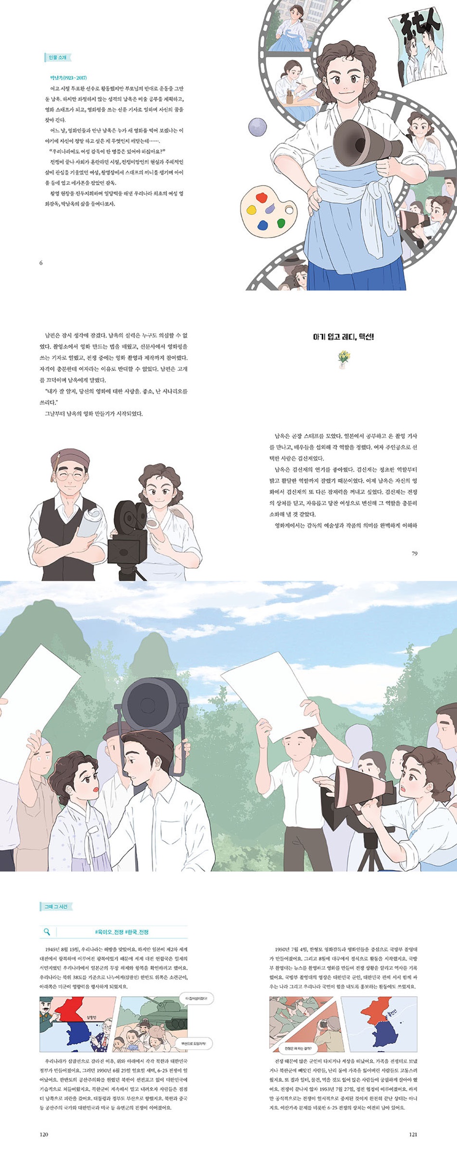 꿈을 안고 영화계에 발을 디디다 좋아하는 것도 잘하는 것도 많았던 박남옥은 예체능 능력자였어요. 고등학교 시절 육상부에서 활동하며 높이뛰기, 투포환 선수로 활동하는 동시에 문학, 미술, 영화를 좋아했지요. 가족의 반대로 좋아하던 운동을 그만두었을 때 좌절하지 않고 다른 길을 찾을 수 있었던 것은 낙천적인 성격뿐만 아니라 하고 싶은 게 많았던 꿈 부자 면모 덕분이기도 했어요. 박남옥은 꿈을 이루지 못해도 오래 고민하고 걱정하기보다 다음 일을 실행하는 사람이었어요. 대학 공부가 적성에 안 맞으면 영화를 보며 스트레스를 풀었고, 그럼에도 대학에 계속 다니기 어렵겠다는 생각이 들자 미련 없이 학교에서 나와 신문사 기자가 되었지요. 해방 이후 우리말을 잘하지 못해 신문 기자로 일할 수 없게 되자 영화사 촬영소에서 스크립터로 일했어요. 이 모든 경험이 영화감독으로 거듭나는 자양분이 되었지요. 자기 삶과 작품으로 나타낸 당당한 여성상, 여자도 하고 싶은 게 있다는 당연한 사실을 드러내다 박남옥이 영화계에 발을 디딘 당시 영화계에는 남성 영화인이 많았어요. 박남옥이 스크립터로 일하다 촬영소를 그만둔 데에는 가족들의 반대도 있었지만, 여성 영화인의 정착을 어렵게 하는 영화계의 현실도 영향을 미쳤어요. 경력을 쌓은 박남옥이 영화감독을 하겠다고 했을 때도 걱정스러운 목소리와 부정적인 시선들이 많았어요. 영화 투자자를 구하기도 어려웠고 후반 작업을 위한 협조를 받기도 어려웠지요. 그런 박남옥이 만든 영화 〈미망인〉은 특별했어요. 당시 영화에서는 제대로 드러내지 않았던 여성의 현실과 솔직한 마음을 잘 표현했어요. 자신의 꿈과 열정, 하고 싶은 것에 대한 열망을 숨기지 않았던 박남옥은 자기 삶을 주체적으로 이끌어 가는 여성 주인공을 만들었지요. 영화 잡지를 낼 만큼 영화를 사랑했던 박남옥은 〈미망인〉 이후로는 작품 활동이 없었는데, 당시 박남옥이 겪었던 녹록지 않은 현실을 알 수 있어요. 예술인이자 리더 박남옥, 우리나라 여성 영화감독의 길을 열다 영화는 글(시나리오), 연기, 미술, 음악 등 다양한 예술 분야를 아우르기 때문에 종합 예술이라고 불려요. 영화 촬영 과정을 책임지고 통솔하는 영화감독은 영화에 적용되는 예술 전반을 이해해야 하지요. 또 사람들이 모여 작업하기 때문에 통솔력도 필요해요. 사람들을 섭외하고, 영화를 촬영하고, 후반 작업까지 맡은 박남옥은 영화 전반에 대한 이해가 높고 리더십 있는 감독이었어요. 박남옥의 이런 선구자적인 활동이 오늘날 여성 영화감독들의 약진을 가능케 한 발판이 되었지요. 당시에는 여자는 잘하는 게 있어도 때가 되면 결혼을 하고, 아이를 키워야 한다고 생각했어요. 직업을 가지는 것보다 좋은 아내, 좋은 엄마가 되는 게 더 중요했지요. 박남옥도 결혼을 하고 가정을 꾸려 아이를 낳았지만 영화를 향한 열정을 멈추지 않았어요. 박남옥은 아이를 업고 촬영장에 나와 일했지요. 박남옥이 세상을 떠난 후, 박남옥의 딸은 박남옥이 쓴 글을 모아 박남옥의 자서전을 출간했어요. 영화감독 박남옥은 엄마로서도 딸에게 자랑스러운 사람이었어요. 《우리나라 최초의 여성 영화감독 박남옥》을 통해 박남옥의 영화 한 편이 우리나라 영화계에, 여성의 사회생활에 어떤 의미가 되었는지 생각해 볼 수 있기를 바랍니다. 일제 강점기에도, 해방 후에도, 전쟁 때에도, 전쟁이 멈추고 나서도 여성은 주체적으로 꿈을 선택하기 어려웠던 시절, 자신만의 꿈을 찾아 가며 영화를 사랑하는 마음을 놓지 않았던 우리나라 최초의 여성 영화감독 박남옥을 만나 보세요. 《우리나라 최초의 여성 영화감독 박남옥》에는 6·25 전쟁(한국 전쟁)을 소개하는 ‘그때 그 사건’, 영화감독 박남옥을 알아보고 또 다른 여성 영화감독 홍은원을 소개하는 ‘인물 키워드’, 영화 제작 과정과 용어를 알 수 있는 ‘그때 그 현장’ 등 정보 페이지도 함께 구성되어 있어 박남옥을 폭넓게 이해할 수 있어요. 청어람주니어 블로그(https://blog.naver.com/juniorbook)에서 《우리나라 최초의 여성 영화감독 박남옥》 독후 활동지를 내려받을 수 있습니다. 인물 관계도, 낱말 퍼즐, 독서 퀴즈, 독서 토의·토론 등 다채로운 내용이 담겨 있으니 독후 활동 시 활용해 보세요. ‘여성 인물 도서관’ 시리즈를 소개합니다 1. 왜 여성 인물일까요? 옛날에는 유교 사상 때문에 자기 목소리를 낼 수 없는 여성들이 많았어요. 하지만 그 시대에도 정치, 사업, 복지, 문학, 의학, 독립운동, 노동 운동, 언론, 법, 예술 등 다양한 분야에서 활동하며 자신의 삶을 개척해 나간 여성들이 있었어요. 역사의 중심에 있었던 남성들보다 덜 알려진, 하지만 알아야 할 여성들의 이야기를 쉽고 재미있게 풀어 동화로 엮었어요. 2. 다른 인물 이야기와 무엇이 다를까요? 인물이 살던 시대와 역사적 사건을 연대기적 구성으로 설명하기보다는 역경을 이겨 내는 인물의 성격과 삶의 태도에 집중했어요. 어떤 분야에서 두각을 드러냈는지, 어떤 점에서 뛰어났는지 조명함으로써 입체감 있는 인물의 삶에 몰입해 실감나게 읽을 수 있는 인물 동화예요. 3. 인물 이야기로 어