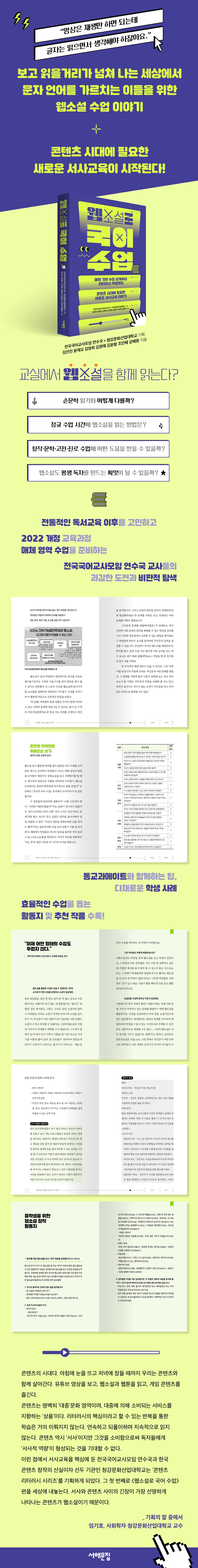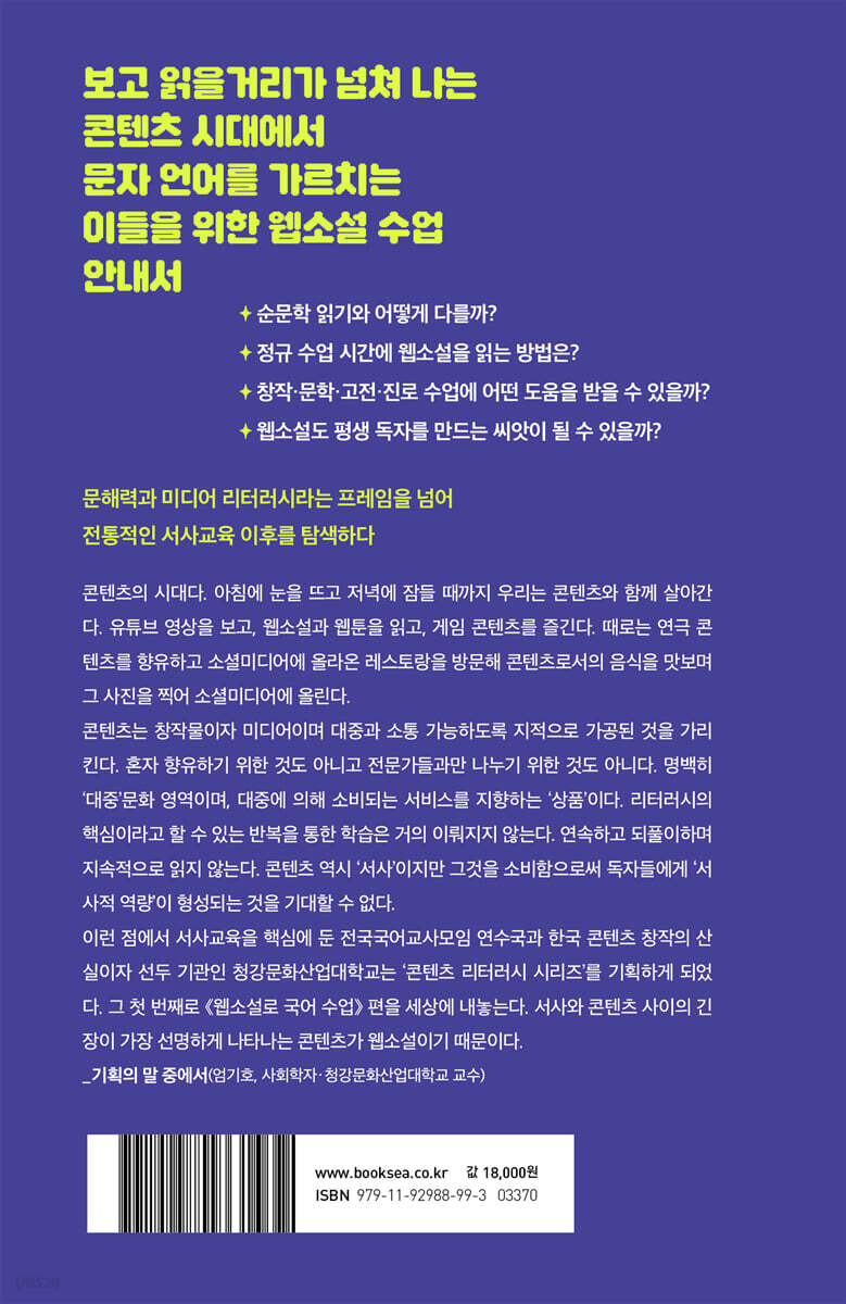 프롤로그 _김선민(청강문화산업대학교 만화콘텐츠스쿨 웹소설창작전공 교수) 01 이야기를 좋아하는 마음은 같으니까 ― 평생 독자를 발견하는 새로운 씨앗, 웹소설로 책 대화하기 웹소설이라도 읽어서 다행인 세상 서로에게 배우는 마음으로 우리들의 웹소설 역사 공유하기 종이책에 등 돌리지 않는다 가상의 세계에서 진실 말하기: 웹소설 형식의 힘 _〈데뷔 못 하면 죽는 병 걸림〉 함께 읽기 나눌 이야기가 많으면 좋은 책 _『우리의 정원』 책 대화가 일깨워 준 것 남이 보여 준 서사가 아니라 내가 만든 서사를 갖는 기쁨 어떻게 읽느냐가 중요하다 02 책과 나 사이에 그은 선을 지우는 일 ― 사고의 균열을 일으키는 웹소설 읽기 문학 창작반에 찾아온 “쾅!” 시작은 얄팍했다 무시무시한 흡인력 속에서 _[1~3차시] 〈전지적 독자 시점〉 독서일지 쓰기 흥미로운 질문 쥐여 주기 _[4~5차시] 모두가 말하는 모둠 토의 문해력 문제가 아닐지도 모른다 _매끄럽고 영리한 글의 의미 혼란의 한복판에 뛰어드는 읽기 _생각지 못한 교육적 효과 쉽게 평가하고 연민하지 못하는 경험 _[6차시] 서평 초고 쓰기 소설의 목표에 닿다 _[7차시] 인간과 세계의 이면을 응시하게 하는 서평 스토리의 역할을 인정할 때 선명해지는 것 03 클리셰라는 도움닫기 ― 누구나 쓸 수 있는 즐거움에 초대하는 웹소설 창작 필요한 건 독창성이 아닌 전형성 웹소설 작가 데뷔 1초 전 _[1차시] 독자 중심 글쓰기의 의미 Lv.0 사람들은 어떤 웹소설을 좋아할까? _[2~4차시] 장르별 웹소설 탐구 Lv.1 망망대해에서 클리셰를 찾아라! _[5~6차시] 장르 작가 집단 토의 Lv.2 선명하고 직관적인 스토리를 위해 _[7~12차시] 장르 클리셰 활용 Lv.3 클리셰는 독자만을 위한 것일까? _[13~15차시] 로그라인과 시놉시스 작성 말하지 않았지만 말하고 싶었던 우리의 메시지들 두근두근, 웹소설 1화 대공개! 재미있는 이야기는 성공한다 [참고자료] 중학생을 위한 웹소설 창작 활동지 04 세상을 구하는 웹소설 수업 ― 5060 동교과메이트와 함께, 시대의 욕망을 공존의 가치로 끌어오는 문학 시간 그래도 학교에선 안 돼! 정규 수업에서 웹소설을 가르치려면 두 부장님의 얼렁뚱땅 웹소설 입성기 사회 문제에 관심은 있지만… 저는 한낱 개인인걸요? 판타지가 여는 새로운 길 _[1차시] 지속가능발전목표와 웹소설 연결하기 의외의 퀘스트들 _[2~3차시] 〈나 혼자 탑에서 농사〉 읽기 어떤 동기와 능력으로 해결할까? _[4차시] 주인공의 특징 어떤 세상에서 해결할 수 있을까? _[5차시] 세계관 형성 요소 소시민에서 행동하는 실천가로 _[6~7차시] 사회 문제의 원인 찾기 놀러 와요, 나의 이세계 _[8~9차시] 판타지 요소로 사회 문제 해결하기 웹소설이기에 가능했다 [인터뷰] “이제 어떤 형태의 수업도 두렵지 않다.”: 막무가내 후배의 수업 파트너, 오애경 부장님 후기 05 콘텐츠로 미래를 준비하는 너에게 ― 자신의 이야기와 꿈, 욕망을 담는 웹소설 쓰기 프로젝트 너희 이렇게 웹소설 좋아했다고? 무한히 확장되는 시드 콘텐츠 일러스트와 웹툰부터 게임, 드라마까지 쓰고 싶은 장르를 찾아서(feat. 챗GPT) _[1차시] 관심 콘텐츠와 웹소설 탐색 키워드 위에 짓는 내 취향의 세계 _[2차시] 세계관과 스토리 윤곽 설계 살아 보지 못한 삶을 이해하는 시간 _[3차시] 캐릭터 구상 이야기가 가야 할 방향 설정하기 _[4~5차시] 시놉시스 완성 쓰다 보니 내 얘기잖아? _순문학 창작과 다름없는 웹소설 창작 진로 글쓰기의 또 다른 진화 [참고자료] 웹소설 쓰기 프로젝트 과제 모음 06 이것은 시대를 초월한 이야기일까? ― 토의 질문으로 탐색하는 고전소설의 가치와 웹소설의 미래 웹소설은 낯설고 고전소설은 지루해 고전소설과 웹소설이 비슷하다고? 웹소설과 친해져 보자 _[1~4차시] 웹소설의 특징 이해하기 조선시대 사람들도 ‘사이다’를 좋아했네요! _[5~8차시] 고전소설의 매력 “약한 사람들이 먼저 죽는 것은 마땅할까?” _[9~12차시] 비판적으로 읽는 웹소설 “불공평한 조건에서의 성취는 공정할까?” _[13~18차시] 고전소설과 웹소설을 관통하는 질문 찾기 권선징악과 일장춘몽을 넘어서 _웹소설이 보여 준 고전의 가치 웹소설도 고전이 될 수 있을까? _[19~20차시] 고전의 조건 과거와 현재를 잇는 새로운 상상력: 〈흥부집 막내아들〉 고전소설에 웹소설 더하기 더 넓고 깊은 읽기를 위한 질문을 기대하며 [참고자료] 고전소설과 엮어 읽기 좋은 웹소설 주 |