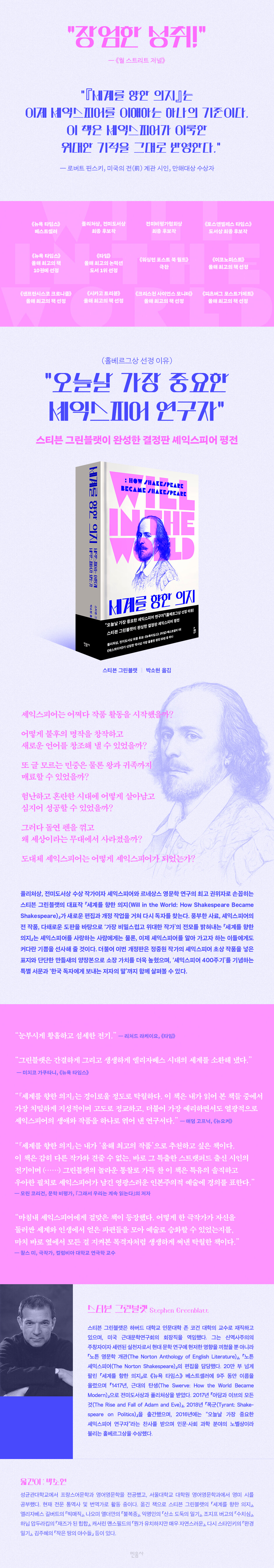 셰익스피어는 어쩌다 작품 활동을 시작했을까?어떻게 불후의 명작을 창작하고 새로운 언어를 창조해 낼 수 있었을까?또 글 모르는 민중은 물론 왕과 귀족까지 매료할 수 있었을까?험난하고 혼란한 시대에 어떻게 살아남고 심지어 성공할 수 있었을까?그러다 돌연 펜을 꺾고 왜 세상이라는 무대에서 사라졌을까?도대체 셰익스피어는 어떻게 셰익스피어가 되었는가? 퓰리처상, 전미도서상 수상 작가이자 셰익스피어와 르네상스 영문학 연구의 최고 권위자로 손꼽히는 스티븐 그린블랫의 대표작 『세계를 향한 의지(Will in the World: How Shakespeare Became Shakespeare)』가 새로운 편집과 개정 작업을 거쳐 다시 독자를 찾아왔다. 풍부한 사료, 셰익스피어의 전 작품, 다채로운 도판을 바탕으로 ‘가장 비밀스럽고 위대한 작가’의 전모를 밝혀내는 『세계를 향한 의지』는 셰익스피어를 사랑하는 사람에게는 물론, 이제 셰익스피어를 알아 가고자 하는 이들에게도 커다란 기쁨을 선사해 줄 것이다. 더불어 이번 개정판은 정중원 작가의 「셰익스피어 초상」 작품을 넣은 표지와 단단한 만듦새의 양장본으로 소장 가치를 더욱 높혔으며, ‘셰익스피어 400주기’를 기리는 「기념사」와 ‘한국 독자에게 보내는 저자의 말’까지 함께 살펴볼 수 있다.저자 스티븐 그린블랫은 『노튼 영문학 개관』과 『노튼 셰익스피어』의 편집을 주간하며 쌓아 온 자신의 모든 역량을 『세계를 향한 의지』에 쏟아 넣으며, ‘신역사주의 비평’의 선구적 실천자로서 확고히 자리매김한다. ‘신역사주의 비평’이란 문학과 역사를 따로 분리해 고려하지 않고, 거대한 사회적 관계망에 참여해 서로 영향을 주고받는 관계로 이해한다. 그러한 기치에 따라, 그린블랫은 지금까지 신화적 대상으로 여겨지며 온갖 의혹과 논란 속에 휩싸여 있던, 영문학에서 가장 중요한 작가 윌리엄 셰익스피어를 새로운 비평적 렌즈로 조명해 낸 것이다. 저자는 수세기 동안 되풀이되어 온 셰익스피어를 둘러싼 논쟁들, 이를테면 ‘셰익스피어는 실존 인물인가?’, ‘셰익스피어는 자기 작품의 주인이 맞는가?’, ‘셰익스피어처럼 별 볼 일 없는 인물이 어찌 이런 걸작들을, 한두 편도 아니고 서른 편 넘게 써낼 수 있었는가?’ 등에 정면으로 맞서며 인간 셰익스피어의 장엄한 승리를 확신한다. 『세계를 향한 의지』는 ‘윌리엄 셰익스피어는 어떻게 대문호 셰익스피어가 됐는가?’라는 물음에 가장 명쾌한 답을 제공해 주리라. 셰익스피어의 전 작품은 물론, 엘리자베스 시대의 사료들을 가로질러 ‘위대한 작가 셰익스피어’의 전모가 밝혀지다!윌리엄 셰익스피어는 지난 400여 년간 수많은 독자(혹은 관객)들에게 끊임없이 경이를 선사해 왔다. 완벽하고 정교한 언어 사용, 인간 존재의 심연을 관통하는 주제 의식, 희극과 비극, 희곡과 소네트를 넘나드는 완벽한 성취에 이르기까지 반백도 안 되는 짧은 세월 동안 셰익스피어가 이룩한 업적은 놀라움 그 자체다. 그래서일까, 셰익스피어의 실존이나 작가적 능력을 둘러싼 의혹은 문학계의 해묵은 논쟁거리다. 헨리 제임스나 마크 트웨인 같은 문학가들은 물론, 역사학자와 문학 연구자, 정신 분석학자 들까지 나서 셰익스피어와 얽힌 갖가지 논쟁에 불을 댕겼다. 하지만 한평생 셰익스피어 연구에 천착해 온 스티븐 그린블랫은 이러한 의혹과 추리 소설적 환상에 반박을 가하며, 윌리엄 셰익스피어의 삶과 작품의 실체를 명약관화하게 규명해 낸다. 먼저 저자는 셰익스피어의 모든 작품은 물론, 그가 작성했을 사적인 문서와 사회생활을 하며 남긴 다종다양한 공문서에 이르기까지 세밀히 검토하며 ‘인간 셰익스피어’의 실체에 최대한 투명하게 다가선다. 시골 마을 장갑 장수의 아들로 태어난 그가 어떻게 언어를 배우고, 가톨릭으로부터 어떤 영향을 받았으며 또 연극에 매료됐는지, 또 무슨 수로 고전 작가들의 우아한 문체와 시정잡배의 해학적인 언어를 습득해 자유자재로 구사할 수 있었는지, 영리한 극장주로서의 처세술과 예술가적 창조력을 어찌 조율해 냈는지, 그리고 불행한 가정생활과 비밀스러운 성적 지향을 어떤 은밀한 방식으로 작품 속에 녹여냈는지 등, 눈부시고 흥미진진한 이야기들을 일거에 펼쳐 놓는다. 더불어 셰익스피어의 걸작들, 그 행간 사이사이에 숨은 엘리자베스 시대의 풍경들과 만화경처럼 다채로운 언어들이 내뿜는 광채를 ‘인간 셰익스피어’의 숨결을 통해 되살려 낸다. 우리는 셰익스피어가 4대 비극과 소네트, 역사극과 희극 속에 쏟아 낸 황홀한 문장들 사이에서 ‘인간적인 승리’를 마주하게 될 때, 그동안 셰익스피어 작품에서 느낀 감동 이상의 것을 얻게 될 것이다. 셰익스피어의 성취는 곧 인간적이고 일상적인 것의 승리! 우리가 영원토록 셰익스피어의 작품을 읽고 간직해야 할 이유셰익스피어의 작품은 왜 걸작인가? 또 셰익스피어는 어째서 위대한 작가인가? 스티븐 그린블랫은 셰익스피어의 문장과 작품에 깃든 주제 의식을 높이 평가하면서도, 그가 지난 400여 년 동안 사랑받고 살아남을 수 있었던 데에는 더 중요한 이유가 있다고 선언한다. 바로 셰익스피어가 