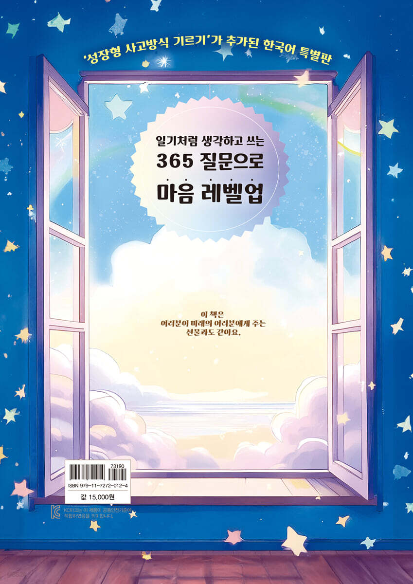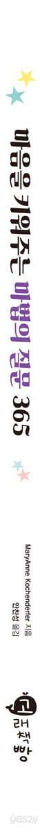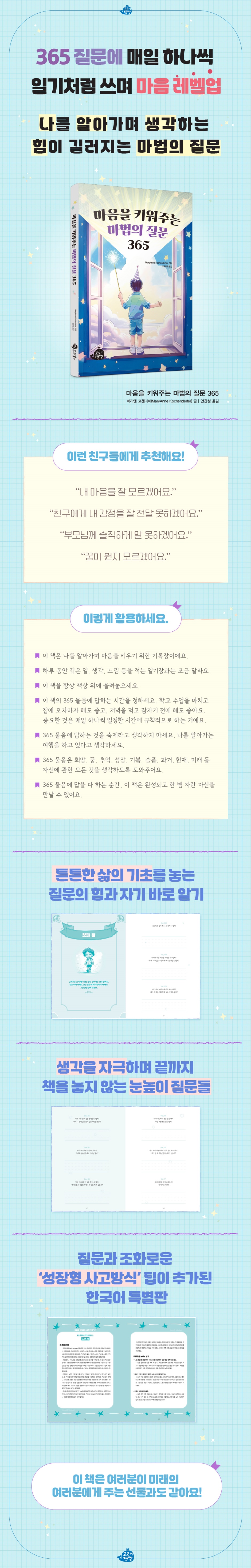 질문의 힘은 크다. 백 가지 지식을 아는 것보다 한 가지 제대로 된 질문이 성장에 더 큰 영향을 끼치기도 한다. 일찍이 소크라테스가 문답법을 통해 가르침을 얻도록 한 까닭도 질문을 통해 얻는 깨우침이 크기 때문이다. 특히 자라나는 아이들에게는 질문을 통해 생각하는 힘을 키워주는 게 더없이 좋은 방법이다. 질문식 수업이 운영되는 데서도 이를 잘 알 수 있다. 흡수력이 뛰어난 아이들은 질문을 통해 생각하고 답하면서 바로바로 사고력을 확장하며 마음이 한 단계 올라간다. 책은 질문을 통해 생각을 키우면서 아이들 스스로 자신을 알아가도록 했다. 자기 자신을 알아가는 건 자기 삶의 기초를 놓는 일이다. 성인이 되도록 자기를 모르기도 하는데, 자라나는 아이들이 자기에 대해 생각하고 답하며 스스로를 알아간다면 이보다 튼튼한 삶의 기초는 없다. 〈생각을 자극하며 끝까지 책을 놓지 않는 눈높이 질문들〉 모든 질문이 아이들 마음을 키우는 건 아니다. 좋은 질문만이 좋은 생각과 답을 끌어낸다. 자기에 대해 생각해보고 알아가는 질문, 창의력과 상상력을 발휘할 수 있는 질문, 호기심을 충족하고 키우는 질문, 이런 질문이 아이들의 생각을 자극하며 마음을 키우게 한다. 365개의 질문은 하나하나 아이들 눈높이에 맞추면서도 생각을 깨우치는 내용으로 이뤄진다. 특히 강약을 조절하며 이어지는 질문은 아이들에게 생각을 요구하면서도 이 책을 놓지 않게 한다. 이런 질문과 함께 각 달의 질문 뒤에 들어간 성장형 사고방식 실천 팁 또한 질문만큼 유용하게 활용할 수 있다. 각 달의 질문과 조화를 이루는 실천 팁은 아이들 스스로 혹은 부모나 교사와 함께할 수 있어 아이들 마음이 한층 자랄 수 있다. 이렇게 활용하세요 -이 책은 나를 알아가며 마음을 키우기 위한 기록장이에요. -하루 동안 겪은 일, 생각, 느낌 등을 적는 일기장과는 조금 달라요. -이 책을 항상 책상 위에 올려놓으세요. -이 책의 365 물음에 답하는 시간을 정하세요. 학교 수업을 마치고 집에 오자마자 해도 좋고, 저녁을 먹고 잠자기 전에 해도 좋아요. 중요한 것은 매일 하나씩 일정한 시간에 규칙적으로 하는 거예요. - 365 물음에 답하는 것을 숙제라고 생각하지 마세요. 나를 알아가는 여행을 하고 있다고 생각하세요. -365 물음은 희망, 꿈, 추억, 성장, 기쁨, 슬픔, 과거, 현재, 미래 등 자신에 관한 모든 것을 생각하도록 도와주어요. -365 물음에 답을 다 하는 순간, 이 책은 완성되고 한 뼘 자란 자신을 만날 수 있어요. |