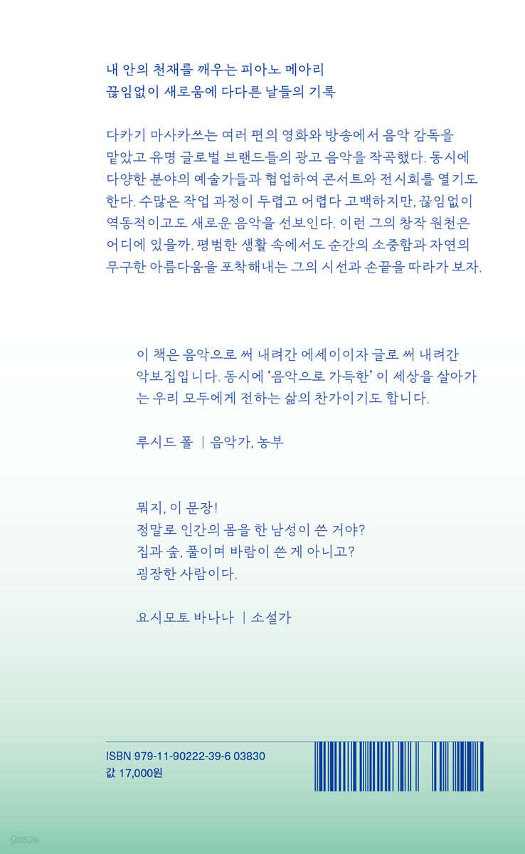 이 책은 음악으로 써 내려간 에세이이자 글로 써 내려간 악보집입니다. 동시에 ‘음악으로 가득한’ 이 세상을 살아가는 우리 모두에게 전하는 삶의 찬가이기도 합니다. - 루시드 폴 (음악가, 농부)