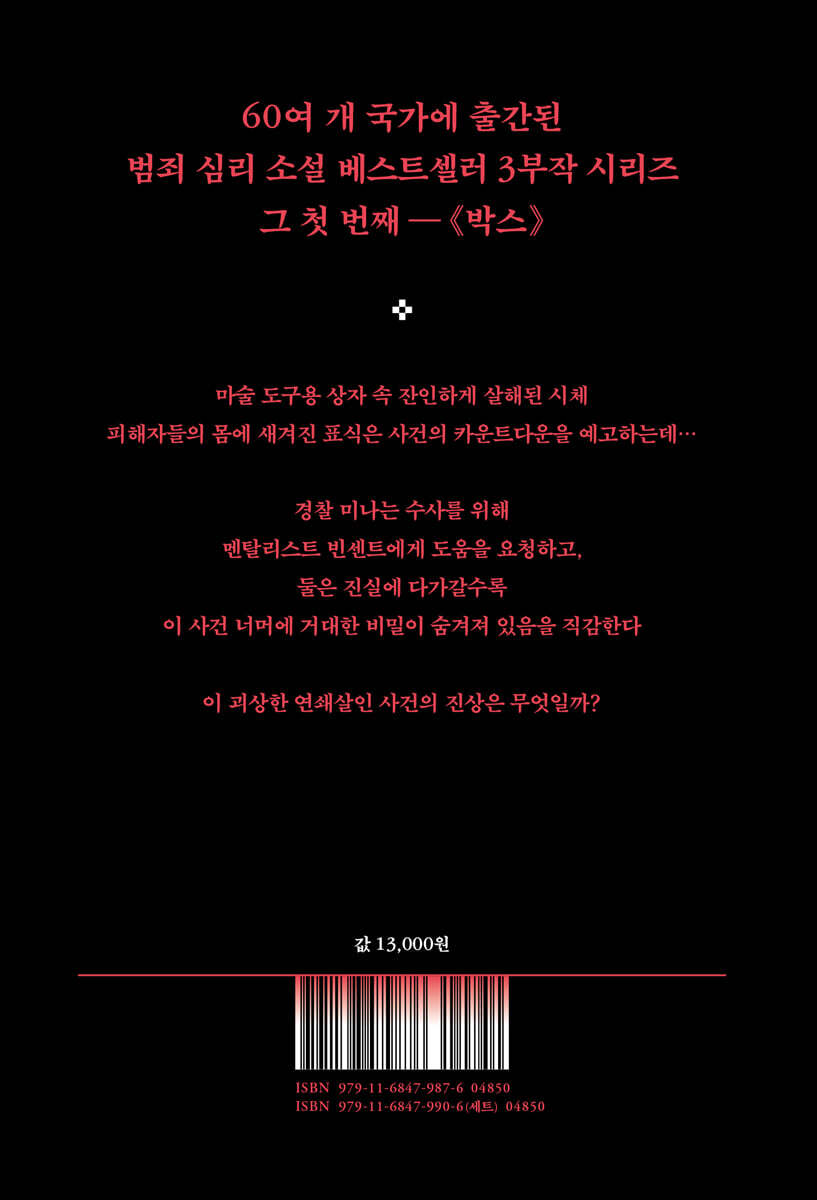 피해자들의 다리에는 수상한 로마자 숫자가 새겨져 있다… 사람 하나가 겨우 들어갈 만한 나무 소재 박스 안에서 칼에 온몸이 꿰인 시체가 발견됐다. 이 박스는 바로 ‘칼 꽂기 마술'에 쓰이는 마술용 도구. 스톡홀름 경찰서의 형사 미나는 이른바 ‘멘탈 매직'의 권위자 멘탈리스트 빈센트에게 이 끔찍한 사건의 수사를 도와 달라고 요청하지만, 빈센트의 해박한 심리학과 마술 지식으로도 수사는 미로에 갇힌 듯 보인다. 한편, 과거 자살 사건의 기록을 살펴보던 중 경찰은 두 피해자들의 몸에 동일한 방식의 로마자 숫자가 새겨져 있는 것을 발견한다. 사건이 미궁에 빠진 사이 추가 희생자가 발생하고, 그의 몸에 새겨진 또 다른 로마자 숫자를 통해 미나와 빈센트는 범인이 어떤 결말을 향해 카운트다운을 하고 있다고 확신한다. 범인이 원하는 건 대체 무엇일까? 그리고 왜 이런 일을 꾸민 걸까? 더 많은 희생자가 생기기 전에 살인범을 막아야 한다. 하지만 진실에 다가갈수록 기억 저편에서 사라진 과거의 일들이 두 사람의 발목을 잡기 시작하는데……! 범죄소설의 거장 카밀라 레크베리와 인간의 마음에 통달한 심리술사 헨리크 펙세우스가 선보이는 노르딕 느와르 올해가 가기 전 꼭 읽어야 할 스릴러 서스펜스의 거장 카밀라 레크베리와 인간 심리와 각종 최면술, 트릭 등에 통달한 심리술사 헨리크 펙세우스의 만남은 그 자체로 폭발적이다. 이 책의 주인공인 미나와 빈센트에 버금가는 조합을 보여 주는 두 사람은 치밀하게 계산된 전개 방식으로 그 어떤 추리 소설과도 다른 독창성과 스릴을 탄생시켰고, 독자들에게 전에 없던 강렬한 몰입과 긴장감을 선사한다. 노르딕 느와르의 걸작이라 불리는 《박스》, 《컬트》, 《미라지》 3부작 시리즈는 무려 60여 개국에서 출간되며 전 세계 출판계의 화제가 되었다. 특히, 시리즈의 첫 작품 《박스》는 미나와 빈센트라는 대조적인 인물들의 아슬아슬한 관계 그리고 과거와 현재를 오가는 긴장감 넘치는 전개로 독자를 단숨에 매료시킨다. 독자들은 두 남녀가 서로 부딪히고 협력하는 과정에서 형성되는 미묘한 감정의 변화를 따라가며 단순한 추리의 범주를 넘어 마술 트릭을 활용한 살인의 숨은 의미를 파헤치게 된다. 과거와 현재가 교차하는 순간마다 독자를 전율케하는 충격과 반전은 무엇일까. 자. 하나, 둘, 셋. 눈을 뜨면 당신은 이 대서사시의 첫 관문을 넘어서게 될 것이다. |