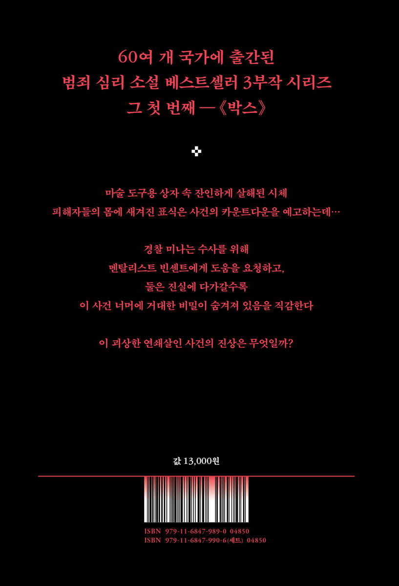 피해자들의 다리에는 수상한 로마자 숫자가 새겨져 있다… 사람 하나가 겨우 들어갈 만한 나무 소재 박스 안에서 칼에 온몸이 꿰인 시체가 발견됐다. 이 박스는 바로 ‘칼 꽂기 마술'에 쓰이는 마술용 도구. 스톡홀름 경찰서의 형사 미나는 이른바 ‘멘탈 매직'의 권위자 멘탈리스트 빈센트에게 이 끔찍한 사건의 수사를 도와 달라고 요청하지만, 빈센트의 해박한 심리학과 마술 지식으로도 수사는 미로에 갇힌 듯 보인다. 한편, 과거 자살 사건의 기록을 살펴보던 중 경찰은 두 피해자들의 몸에 동일한 방식의 로마자 숫자가 새겨져 있는 것을 발견한다. 사건이 미궁에 빠진 사이 추가 희생자가 발생하고, 그의 몸에 새겨진 또 다른 로마자 숫자를 통해 미나와 빈센트는 범인이 어떤 결말을 향해 카운트다운을 하고 있다고 확신한다. 범인이 원하는 건 대체 무엇일까? 그리고 왜 이런 일을 꾸민 걸까? 더 많은 희생자가 생기기 전에 살인범을 막아야 한다. 하지만 진실에 다가갈수록 기억 저편에서 사라진 과거의 일들이 두 사람의 발목을 잡기 시작하는데……! 범죄소설의 거장 카밀라 레크베리와 인간의 마음에 통달한 심리술사 헨리크 펙세우스가 선보이는 노르딕 느와르 올해가 가기 전 꼭 읽어야 할 스릴러 서스펜스의 거장 카밀라 레크베리와 인간 심리와 각종 최면술, 트릭 등에 통달한 심리술사 헨리크 펙세우스의 만남은 그 자체로 폭발적이다. 이 책의 주인공인 미나와 빈센트에 버금가는 조합을 보여 주는 두 사람은 치밀하게 계산된 전개 방식으로 그 어떤 추리 소설과도 다른 독창성과 스릴을 탄생시켰고, 독자들에게 전에 없던 강렬한 몰입과 긴장감을 선사한다. 노르딕 느와르의 걸작이라 불리는 《박스》, 《컬트》, 《미라지》 3부작 시리즈는 무려 60여 개국에서 출간되며 전 세계 출판계의 화제가 되었다. 특히, 시리즈의 첫 작품 《박스》는 미나와 빈센트라는 대조적인 인물들의 아슬아슬한 관계 그리고 과거와 현재를 오가는 긴장감 넘치는 전개로 독자를 단숨에 매료시킨다. 독자들은 두 남녀가 서로 부딪히고 협력하는 과정에서 형성되는 미묘한 감정의 변화를 따라가며 단순한 추리의 범주를 넘어 마술 트릭을 활용한 살인의 숨은 의미를 파헤치게 된다. 과거와 현재가 교차하는 순간마다 독자를 전율케하는 충격과 반전은 무엇일까. 자. 하나, 둘, 셋. 눈을 뜨면 당신은 이 대서사시의 첫 관문을 넘어서게 될 것이다. |