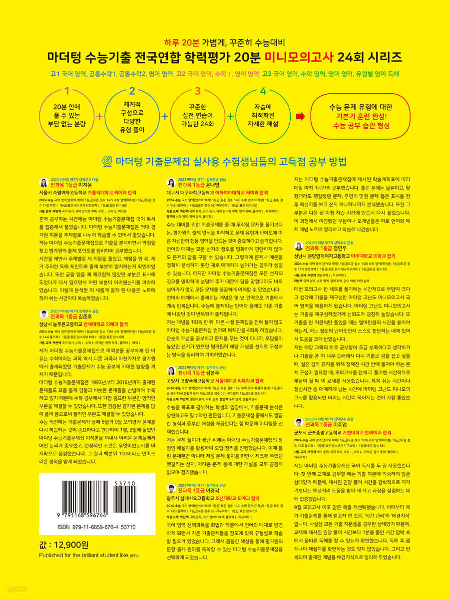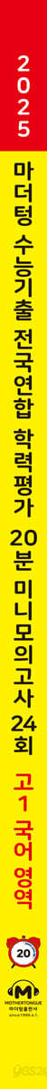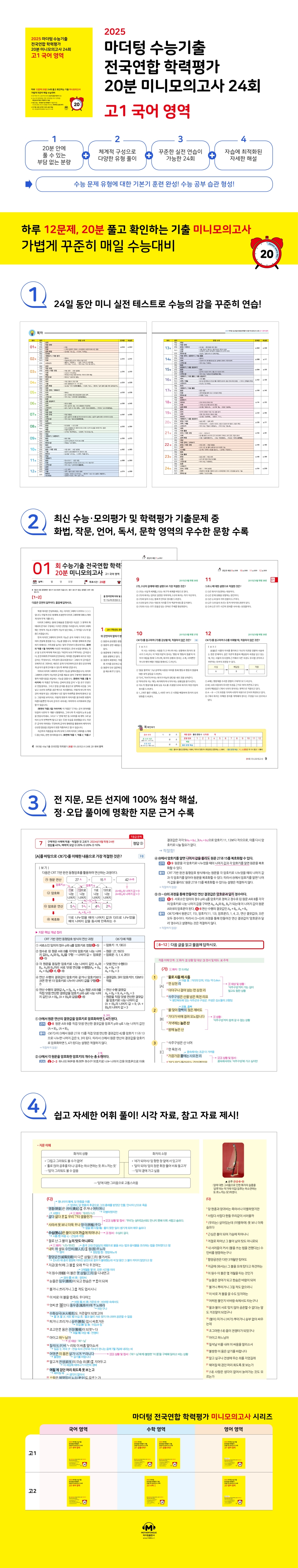 가볍게 꾸준히 수능대비 습관 형성! - 정기적인 미니 실전 테스트로 수능의 감(感)을 꾸준히 연습 - 수능 국어 영역(화법·작문·문법(언어)·독서·문학)을 매일 골고루 학습 - 최근 수능 및 학력평가 기출문제를 체계적으로 배치 - 전 지문, 모든 선지에 100% 첨삭 해설 * 하루 20분 투자로 부담 없는 학습 - 하루 20분(해설까지 40분) 투자로 부담 없이 매일 꾸준한 학습 가능 * 해설에 지문과 문제가 그대로 나오는 첨삭 해설 방식 - 해설편에 지문과 문제, 선지를 그대로 제시하고 해설이 필요한 부분에 직접 첨삭하여 편리한 학습 가능 * 문제 유형, 원문항 번호, 정답률 명시 - 문항 유형을 분류, 명시하여 각 유형별 출제 방식과 문항 풀이 방법을 익힐 수 있도록 구성 - 정답률로 문항 난이도 확인 가능, 응답률 10% 이상의 매력적 오답 표기 * 쉽고 자세한 어휘 풀이 - 지문에 등장하는 어려운 어휘나 구절을 쉽게 풀이하여 제시 * 완전한 학습을 위한 다양한 Tip - 지문을 보충 설명하는 참고 자료, 심화 자료, 시각 자료 제시 - 각 선지 내용에 대한 구체적인 예시, 상호 텍스트 제시 |