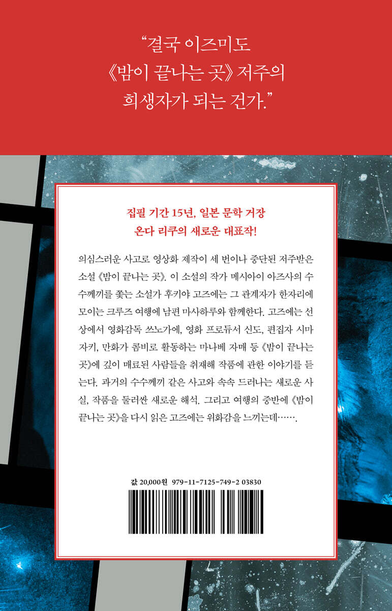 출간 즉시 “새로운 대표작”이라는 타이틀을 얻으며 베스트셀러가 된 작품. 관련 영상을 제작하려 하면 재앙을 몰고 다니는, 저주받은 소설 『밤이 끝나는 곳』을 중심으로 사건이 전개된다. 등장인물들이 함께 떠난 크루즈 여행 중 숨겨진 진실과 사라진 작가의 그림자가 서서히 밝혀진다.