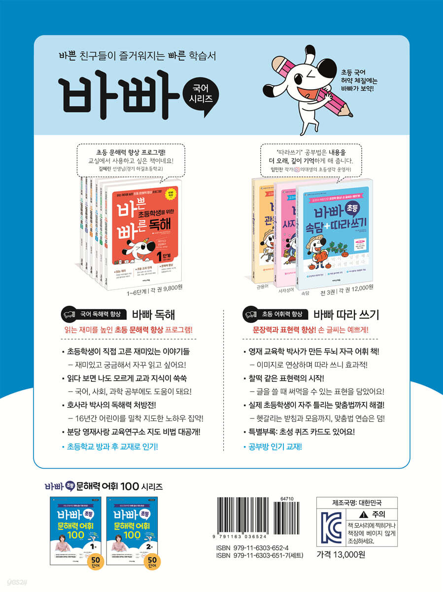 『바빠 초등 문해력 어휘 100』 교과서를 이해하는 힘, 어휘력 초등 교과서의 상당 부분이 개념을 설명하는 글로 이루어져 있습니다. 이러한 글을 제대로 이해하기 위해 가장 먼저 필요한 것이 바로 어휘력입니다. 학습 용어뿐만 아니라 설명에 쓰인 어휘를 읽고 이해하지 못하면 공부가 어려울 수밖에 없습니다. 어휘력을 키우는 방법= 꾸준한 대화와 독서+어휘 교재 학습 문제는 어휘력을 키우기가 쉽지 않다는 점입니다. 어휘력은 태어날 때부터 부모와 나누는 대화를 통해 발달하는 언어 능력의 일부입니다. 또한, 독서도 어휘력을 키우는 중요한 요소입니다. 하지만 요즘 초등학생들이 이 두 가지를 꾸준히 이어가는 것은 쉽지 않습니다. 이러한 상황에서 가장 현실적인 방법은 교재를 활용해 필수 어휘를 학습하는 것입니다. 부모와 나누는 대화나 독서가 자연스럽게 어휘를 익히는 ‘암묵적 학습’이라면, 어휘 교재를 통한 학습은 어휘를 명확하게 배우는 ‘명시적 학습’이라고 할 수 있습니다. 이러한 명시적인 학습이 뒤따라야 어휘력 향상이 빨라집니다. 표현력이 달라집니다! - ‘좋다’보다는 ‘흡족하다’, ‘달리다’보다는 ‘내달리다’ 이 책에서는 생각의 폭을 넓히고 글을 더 풍성하게 만들어 주는 어휘를 다룹니다. 예를 들면 우리가 흔히 사용하는 단어인 ‘좋다’보다는 ‘흡족하다’가 내 마음 상태를 더 정확하게 표현해 줍니다. 또, ‘달리다’보다는 ‘내달리다’가 힘찬 느낌을 좀 더 생생하게 전달합니다. 이처럼 어휘를 얼마나 잘 아느냐에 따라 말과 글을 표현하는 능력이 크게 달라집니다. 또한 이 책은 이러한 어휘의 다양한 활용형까지 알려주어, 상황에 맞게 정확한 어휘를 사용하도록 도와줍니다. 공부가 꼭 필요한 추상 명사까지 담았습니다! 명사에는 구체 명사와 추상 명사가 있습니다. 추상 명사는 눈에 보이지 않거나 손으로 만질 수 없는 것을 나타내기 때문에, 따로 공부하지 않으면 단어를 익히기 어렵습니다. 예를 들어, ‘시절’, ‘일생’, ‘눈치’ 같은 단어들은 그 뜻을 배우고 나서야, 그 단어가 쓰인 글을 제대로 이해할 수 있고, 또 그 단어를 활용해서 자신의 생각을 담은 글로 표현할 수 있게 됩니다. 이 책을 통해 의미는 알지만 정확하게 알지 못했던 추상 명사들을 익혀 보세요. 어휘 글쓰기로 진짜 ‘내 어휘’를 만듭니다! 어휘를 효과적으로 습득하기 위해서는 그 어휘가 실제로 사용되는 맥락을 알고, 그 안에서 자연스럽게 사용하는 방법을 배워야 합니다. 단순히 어휘의 뜻을 반복해서 읽는다고 어휘를 제대로 익힐 수 없습니다. 또한, 어휘의 다양한 활용형을 알아야 어색하지 않고 자연스럽게 사용할 수 있습니다. 가장 중요한 것은 어휘를 실제로 사용해 보는 것입니다. 어휘를 사용할 때 자신의 경험을 떠올려 글로 표현해 봐야 진짜 ‘내 어휘’로 만들 수 있습니다. 아이들이 『바빠 초등 문해력 어휘 100』 1, 2권으로 부담 없이 어휘를 익히고 글쓰기까지 할 수 있게 도와주세요. 이 책이 끝날 무렵에는 어휘력이 크게 자라 있을 것입니다. 일상에서 대화와 독서를 함께하는 것도 잊지 말고 꼭 챙겨 주세요! |