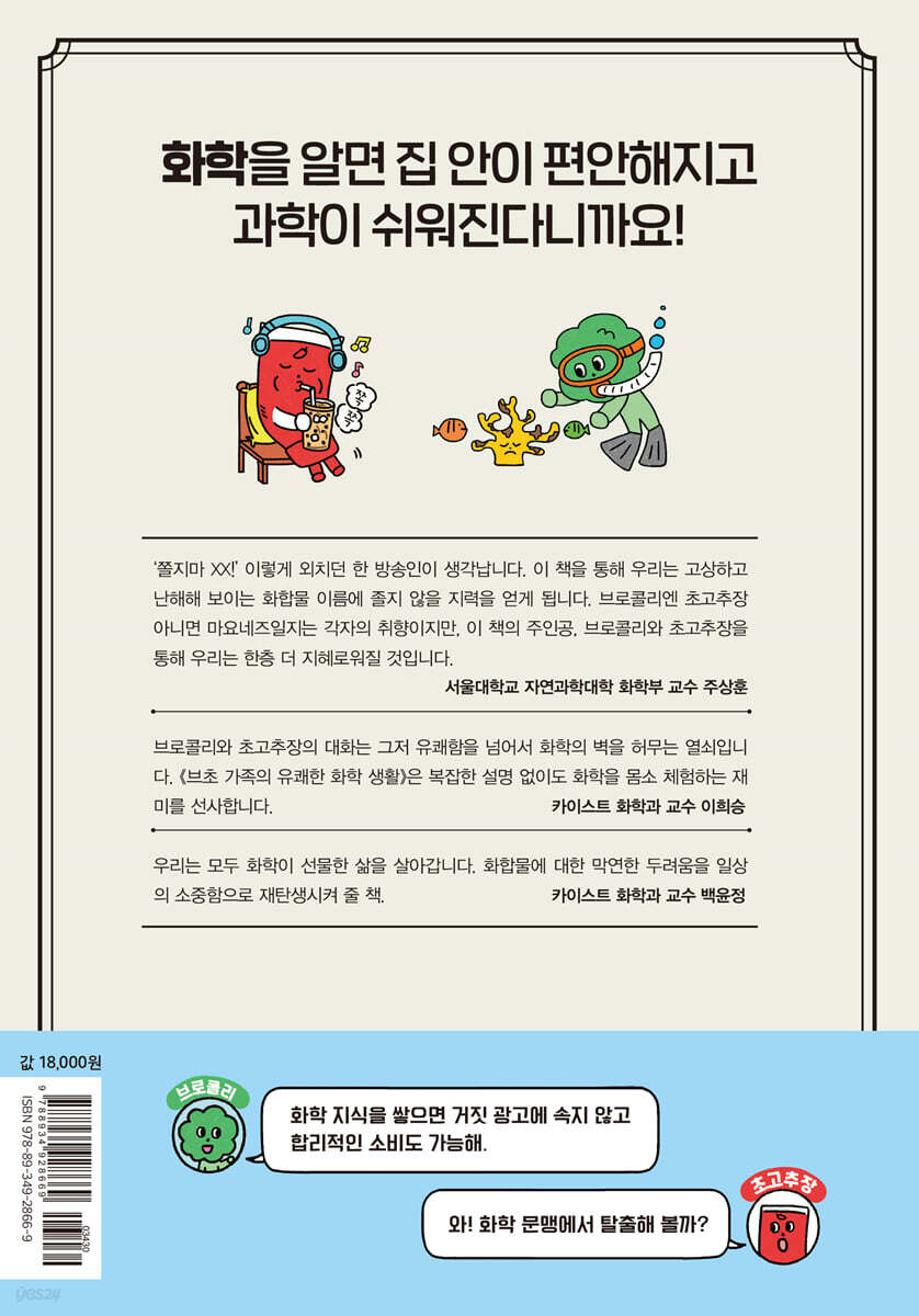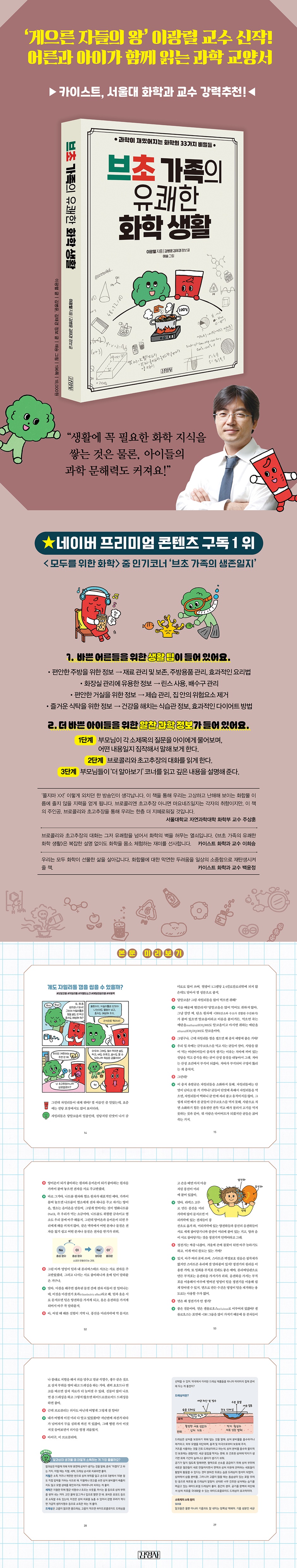 브로콜리와 초고추장의 대화는 그저 유쾌함을 넘어서 화학의 벽을 허무는 열쇠입니 다. 『브초 가족의 유쾌한 화학 생활』은 복잡한 설명 없이도 화학을 몸소 체험하는 재미를 선사합니다. - 이희승 (카이스트 화학과 교수)