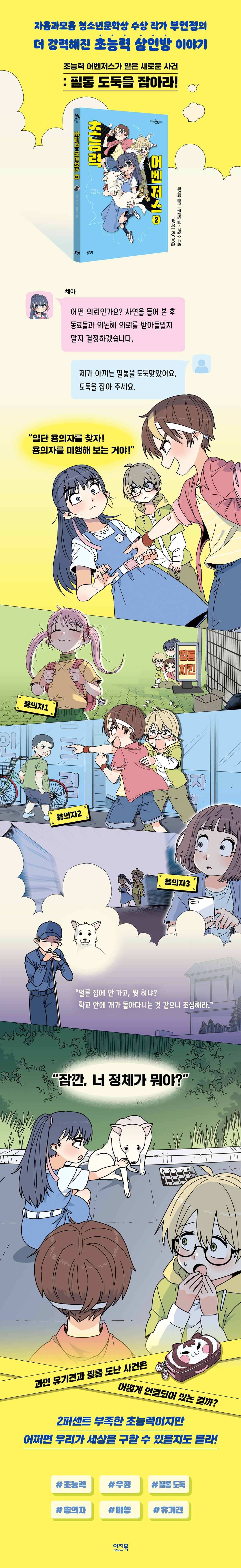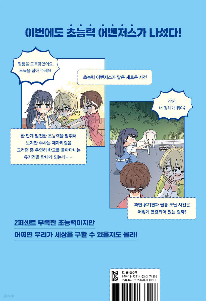 2퍼센트 부족한 우리, 100퍼센트 행복한 세상을 꿈꾸다 서로의 능력을 알아본 초능력 삼인방은 공식적으로 ‘초능력 어벤저스’의 탄생을 알린다. 작고 사소한 능력이지만 힘을 모으면 사건을 해결할 수 있다는 자신감을 얻은 초능력 어벤저스. 정체를 숨긴 채 학교 친구들에게 사건을 의뢰받는다. 이처럼 초능력 어벤저스는 자신이 가진 능력을 다른 친구들을 돕는 일에 사용한다. 아주 사소한 힘일지라도 타인을 배려하는 순수하고 따뜻한 마음을 느껴지는 대목이다. 초능력 어벤저스가 맡게 된 첫 번째 사건은 필통 도둑을 잡는 일. 사건 접수부터 목격자 증언 획득, 용의자 특정, 미행 수사까지 세 명의 주인공이 모든 것을 결정하고 수행한다. 초능력 어벤저스는 초능력을 지닌 능력자이기도 하지만, 어린이이기도 하다. 하지만 이 작품에서는 어린이라는 존재에 한계를 부여하지 않는다. 영리하고 결단력 있는 리더십을 가진 채아, 정의감을 가지고 몸을 사리지 않는 용감함을 지닌 건우, 소심하지만 누구보다 노력하는 태도를 보여 주는 도윤을 통해 당차고 주도적인 어린이의 모습을 보여 준다. 어린이에게 학교라는 공간, 친구라는 존재는 특별하다. 집만큼이나 긴 시간을 보내고, 가족만큼 오랜 시간을 함께하는 존재이기 때문이다. 그렇기에 학교는 어린이의 세계, 그 자체이기도 하다. 학교에서 일어난 도난 사건을 어른의 도움이나 간섭 없이 어린이의 힘으로 해결하는 모습은 이 책을 읽을 어린이 독자에게 어린이의 세계를 열어 보이며, 통쾌함을 선사한다. 초능력 어벤저스, 동료이기 이전에 친구인 우리! “이제 혼자 도망가지 않을게. 우린 팀이니까.” 채아가 건우와 도윤을 만나지 못했다면 어땠을까? 아마 자신 있게 초능력 어벤저스라는 이름을 붙이지 못하고 본인의 능력을 초라하게만 느꼈을지도 모른다. 완벽함을 추구하는 채아에게 있어서 엉성한 티가 나더라도 생각보다 행동부터 하는 건우의 모습은 이해할 수는 없지만 멋있게 느껴지기도 한다. 소심하고 친구가 많지 않은 도윤을 채아와 건우는 보채지 않고 배려심을 가지고 응원한다. 이 셋의 관계는 초능력자라는 공통점으로 시작되었지만 사건을 해결하기 위해 함께 시간을 보내며 진정한 친구가 되어간다. 각자가 가진 초능력만큼이나 개성 넘치는 성격을 가진 세 명의 주인공이 모여 서로의 결점을 보완해 줄 때 진가를 발휘한다. 특별한 초능력만큼이나 남다른 우정으로 똘똘 뭉치는 초능력 어벤저스와 함께해 보자! 작가의 말 어쩌면 우리 주위에는 초능력 어벤저스처럼 정체를 숨기고 활동하는 능력자들이 있을지도 모릅니다. 그 친구들은 아주 평범한 모습으로 우리들 사이에 섞여 있겠죠. 혹은 여러분이 그 능력자일지도 모르고요. _「작가의 말」에서 |