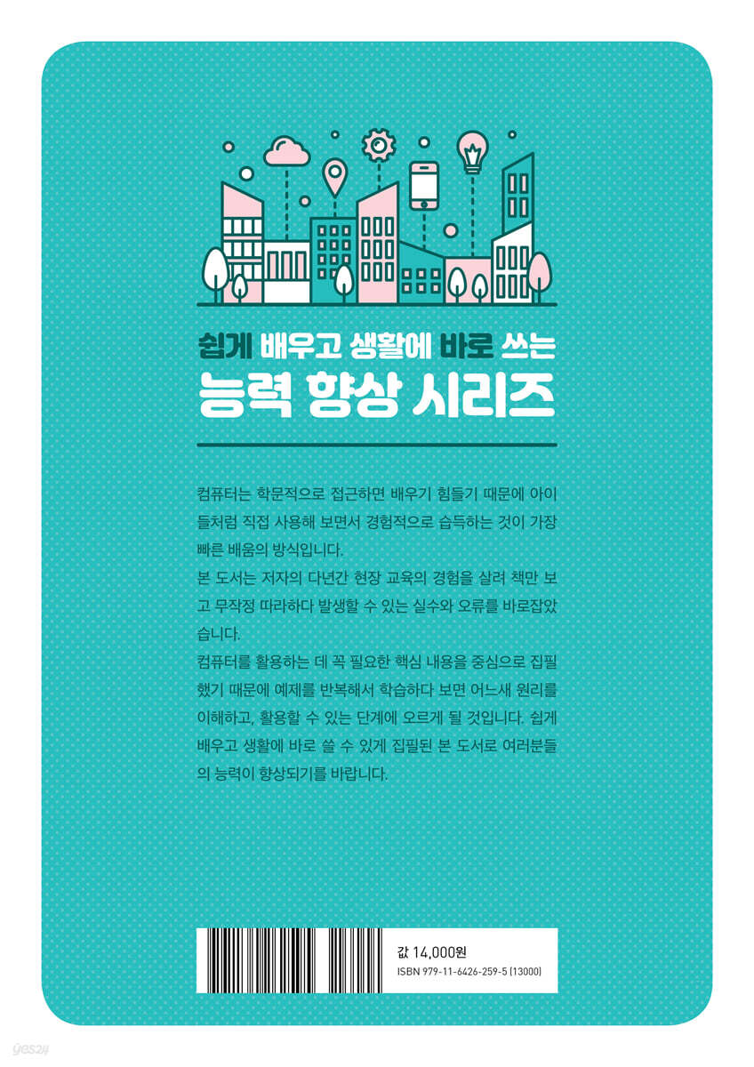 __STEP01 화면구성 살펴보기 __STEP02 작업표시줄 구성 요소 __STEP03 그림판 찾아서 실행하기 __STEP04 계산기로 평형 계산하기 __STEP05 메모장으로 글자입력 연습하기 __STEP06 컴퓨터 종료하기 Chapter02 창 조절하기 __STEP01 창 위치 변경하기 __STEP02 바탕화면에 창 스냅하기 __STEP03 창 크기 조절하기 __STEP04 계산기 사용하며 창 조절하기 __STEP05 그림판 사용하여 창 저장하기 Chapter03 바탕 화면 설정하기 __STEP01 테마로 배경 화면 변경하기 __STEP02 인터넷 사진으로 배경 바꾸기 __STEP03 화면 보호기 사용하기 __STEP04 아이콘 사라지게 하기 __STEP05 아이콘 크기 변경하기 __STEP06 화면 배율 설정하기 __STEP07 사라진 내 PC 아이콘 표시하기 Chapter04 폴더로 분류 저장하기 __STEP01 바탕 화면에 폴더 만들기 __STEP02 폴더 이동하기 __STEP03 이미지 저장하기 Chapter05 복사와 붙여넣기 __STEP01 텍스트 복사/붙여넣기 __STEP02 이미지 복사/붙여넣기 Chapter06 그림판 활용하기 __STEP01 그림판을 시작 화면에 고정하기 __STEP02 사진 열기와 가져오기 __STEP03 사진 편집과 꾸미기 Chapter07 마우스 우클릭의 비밀 __STEP01 컴퓨터 날짜/시간 변경하기 __STEP02 휴지통 비우기 __STEP03 파일/폴더 삭제하기 __STEP04 삭제된 파일 복원하기 __STEP05 내 PC 사양 살펴보기 __STEP06 시작 화면에 고정/해제하기 Chapter08 화면 캡처하기 __STEP01 윈도우 11에서 캡처하기 __STEP02 바탕 화면으로 연습하기 __STEP03 이미지 속의 텍스트 추출하기 Chapter09 음성으로 컴퓨터 다루기 __STEP01 음성으로 텍스트 입력하기 __STEP02 음성으로 앱 찾기 __STEP03 음성으로 웹 검색하기 Chapter10 네이버 웨일로 인터넷하기 __STEP01 네이버 웨일 설치하기 __STEP02 네이버 가입하기 __STEP03 네이버 아이디 찾기 __STEP04 네이버 비밀번호 찾기 __STEP05 네이버 E-Mail 보내기 |